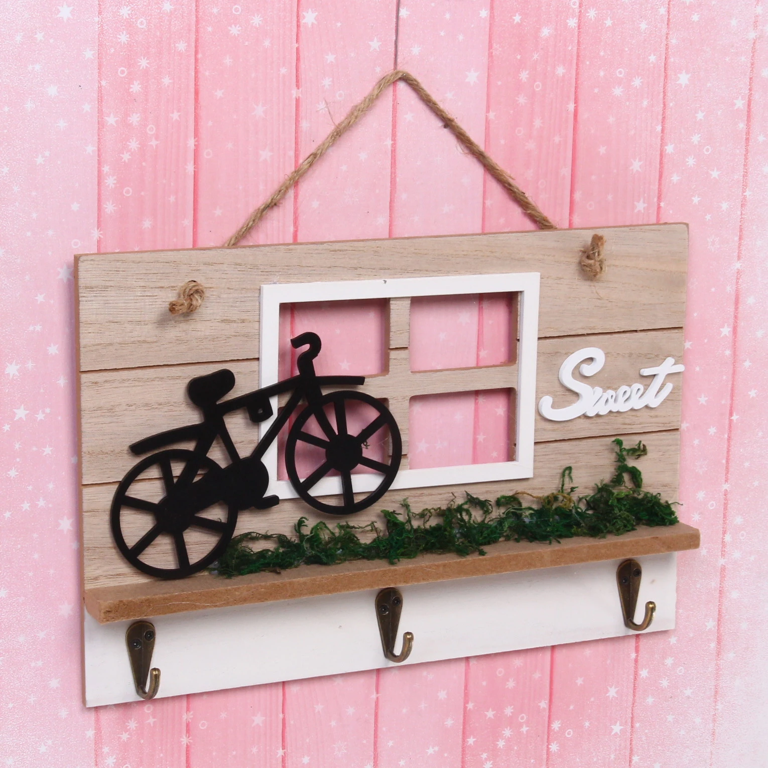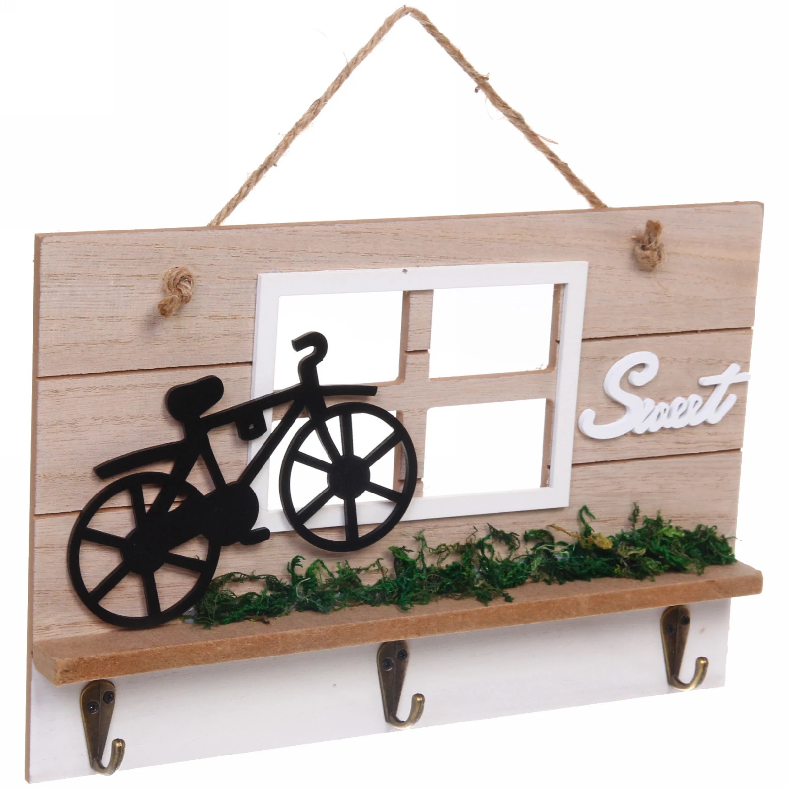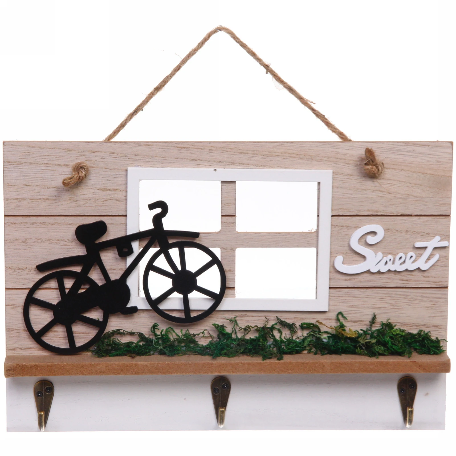 Ключница оснащена тремя прочными металлическими крючками золотистого цвета, на которые удобно разместить ключи от дома, машины, почтового ящика или брелоки. Декоративная полочка над крючками может служить для хранения мелочей или просто радовать глаз миниатюрным зелёным газоном. Изделие легко крепится на стену с помощью верёвки, идущей в комплекте, что позволяет быстро и без лишних инструментов организовать порядок в прихожей, коридоре или у входной двери.