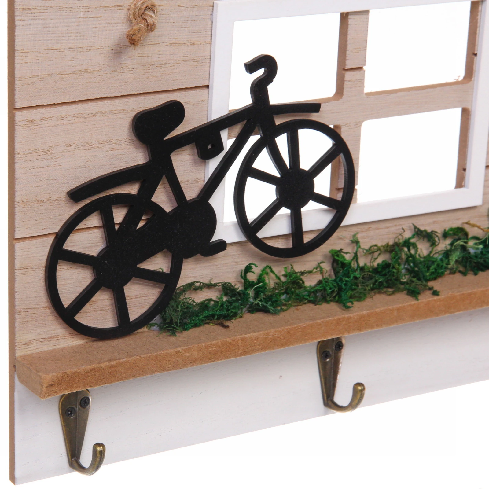 - Дополнительный элемент: декоративное окошко с белой рамой добавляет композиции глубины и завершённости, делая ключницу похожей на миниатюрный домик.