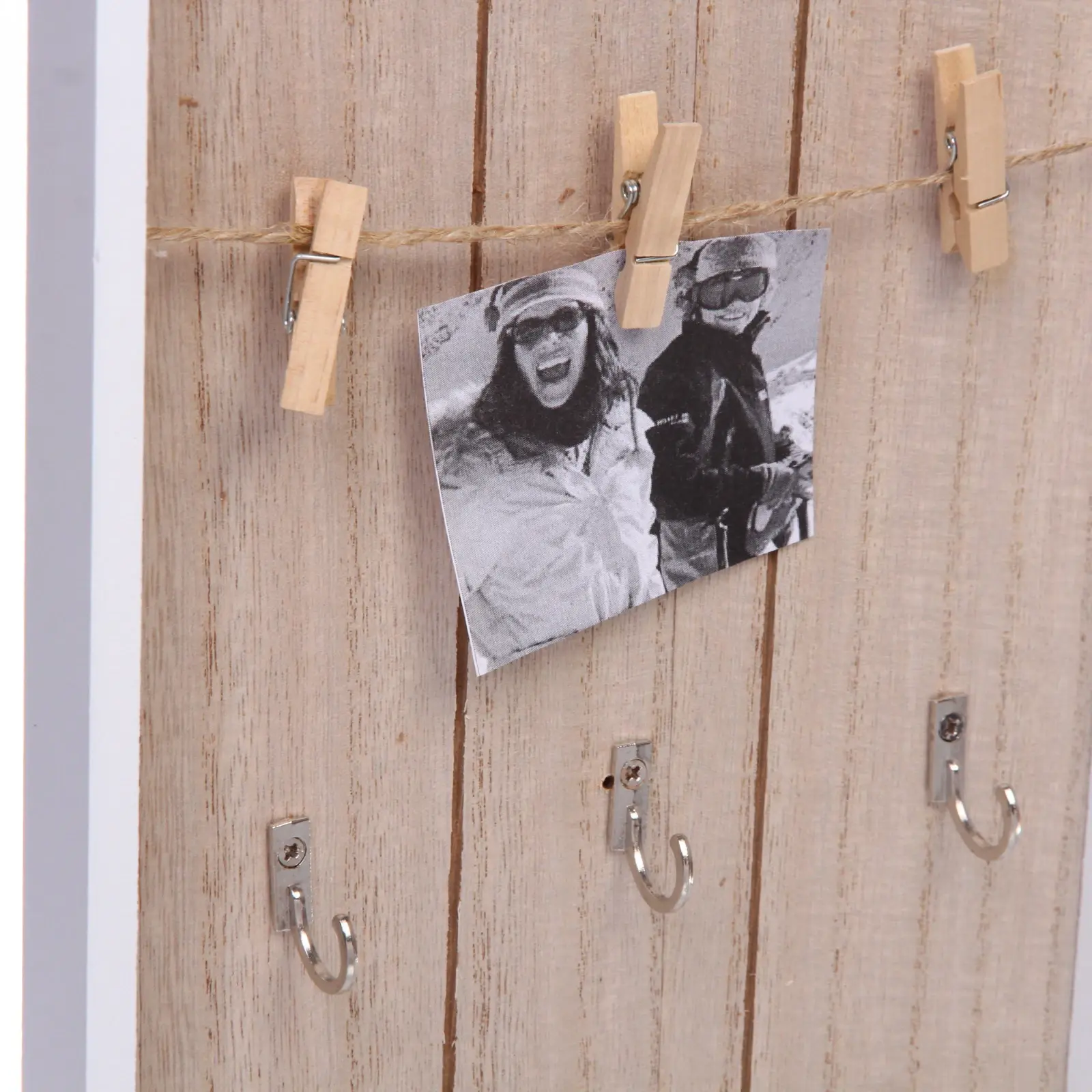 Идеально подходит для использования в прихожих, коридорах и комнатах для организации ключей, фото и заметок. Благодаря своему дизайну из имитирующего дерево материала и металлическим крючкам, изделие гармонично вписывается в любой интерьер, будь то современный или классический.