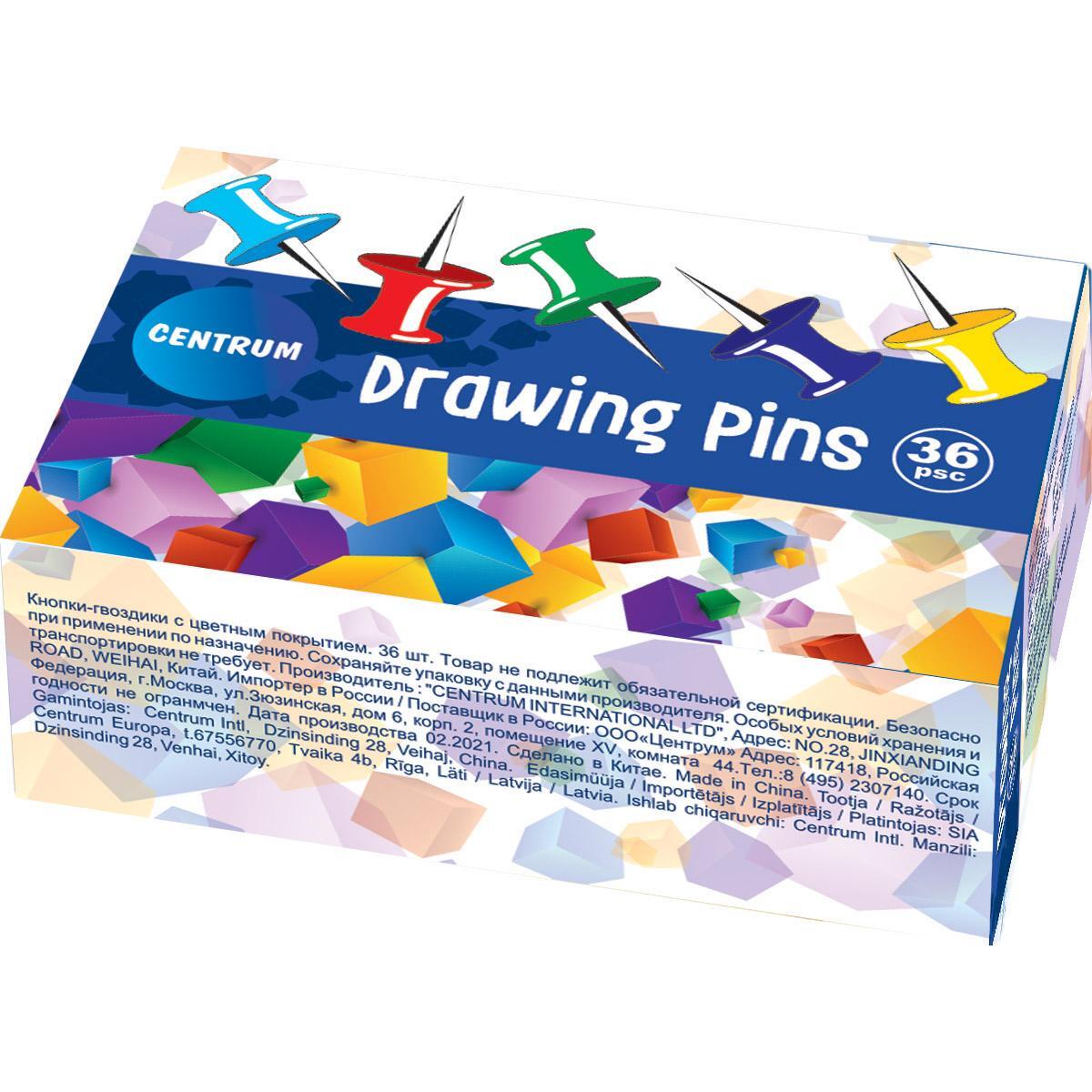 Кнопки-гвоздики цветные 'Centrum', 36 шт, металл/пластик, для крепления бумаг