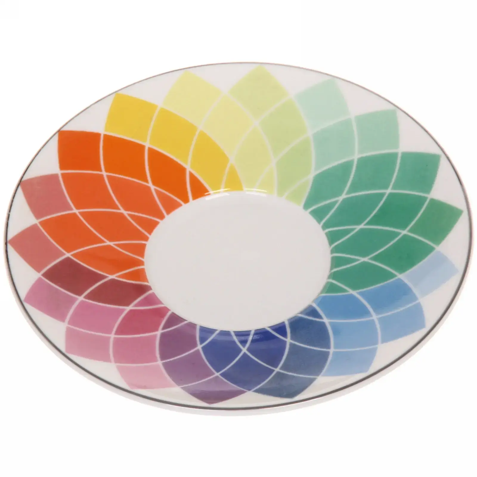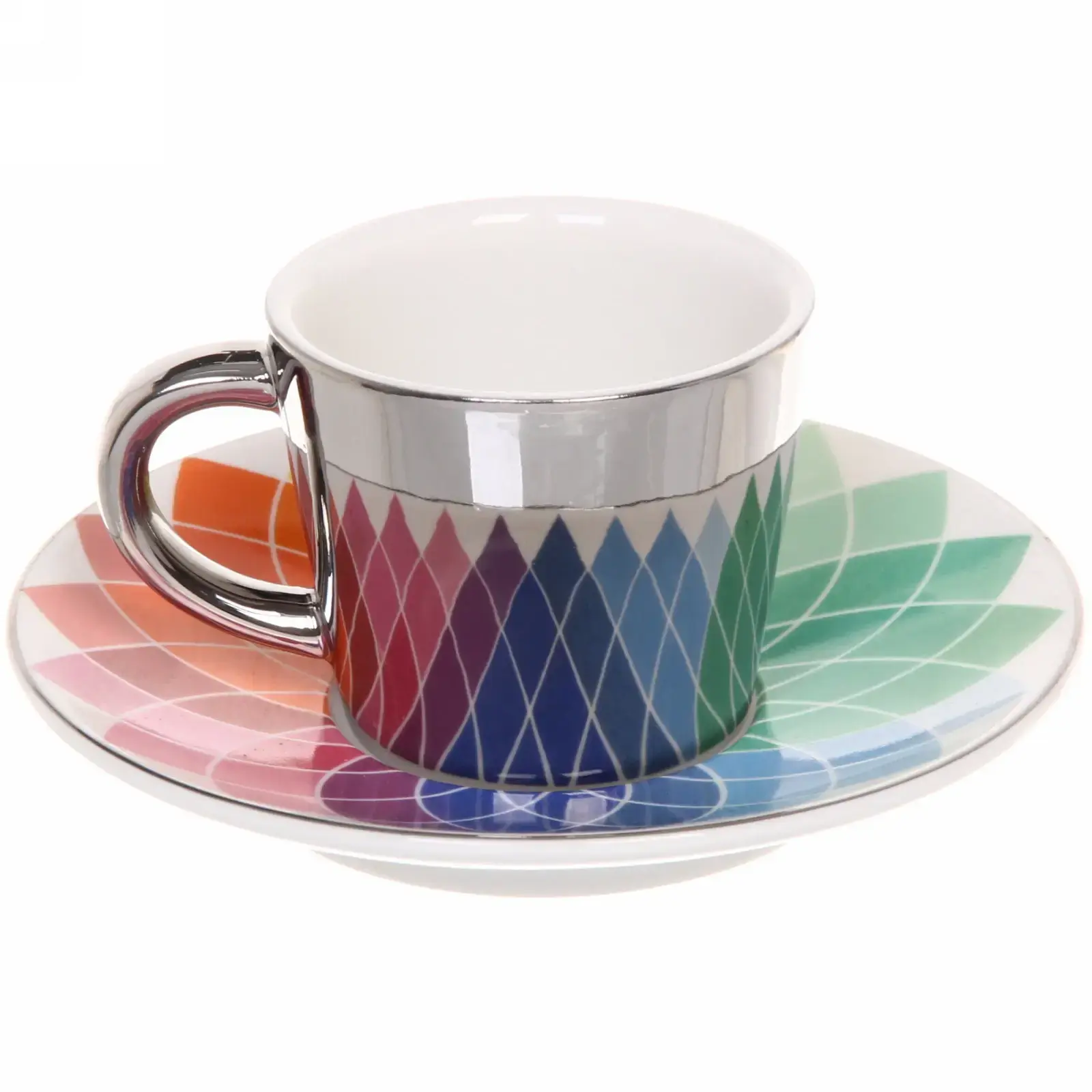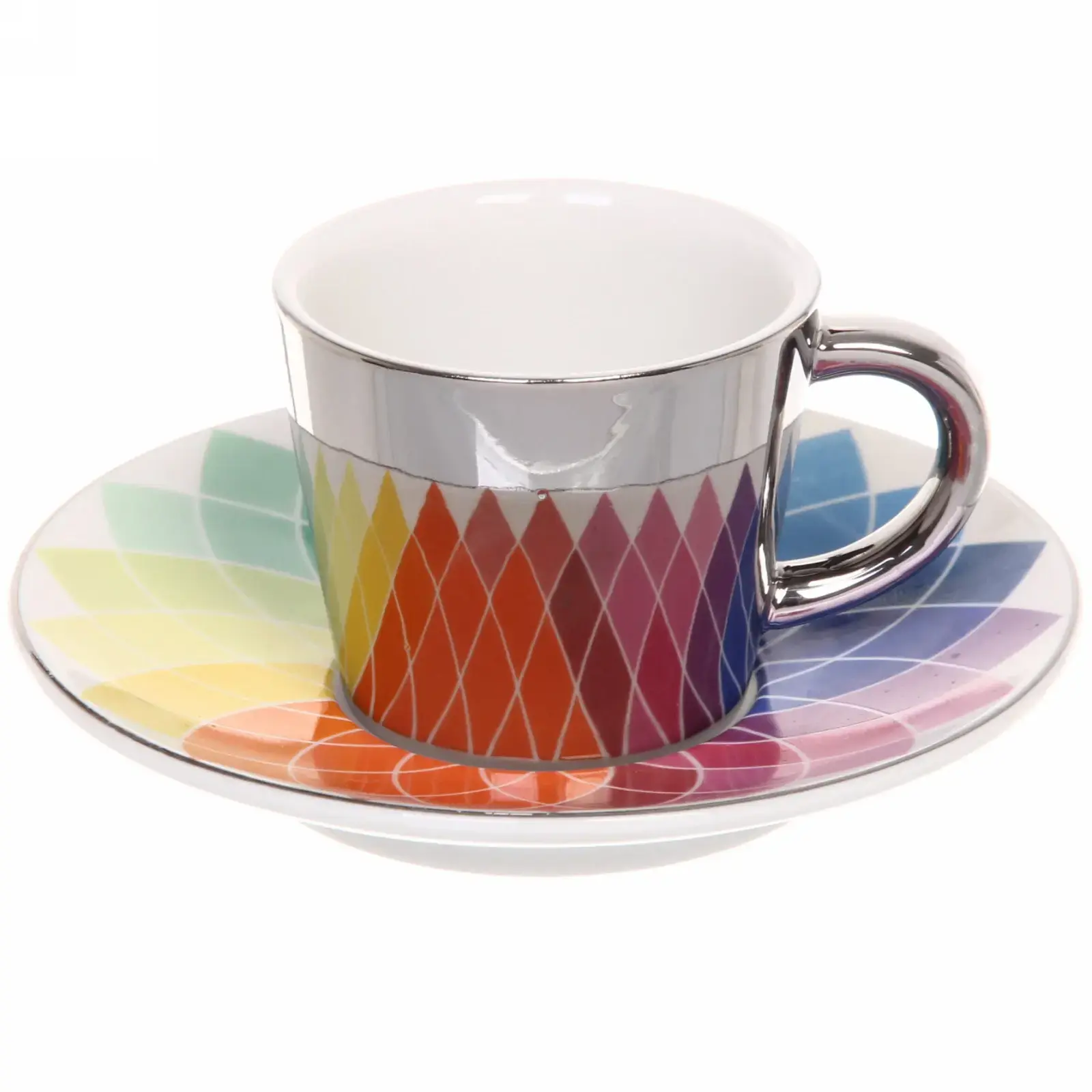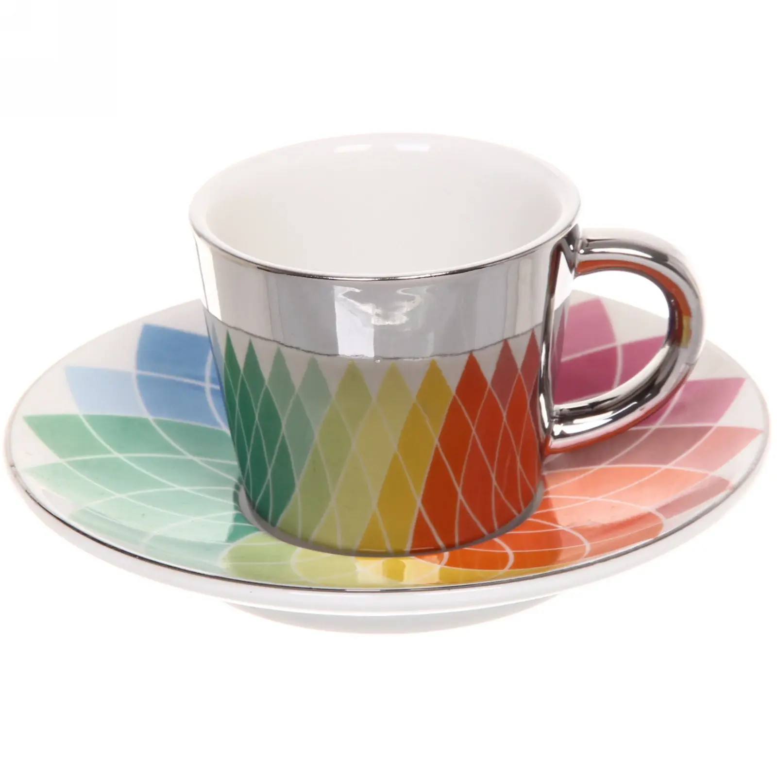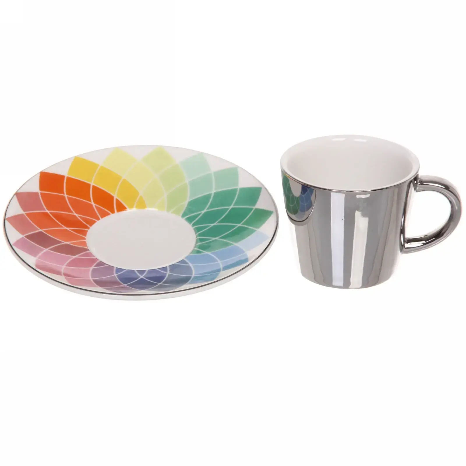 Кружка и блюдце выполнены в градиентных цветах, переходящих от фиолетового к красному, что создает эффект радуги. Металлический ободок на кружке добавляет изысканности и подчеркивает её стильный вид. Размеры кружки и блюдца стандартные, что делает их удобными для повседневного использования. Эта пара станет отличным дополнением к вашей кухонной посуде и подчеркнет ваш вкус.
