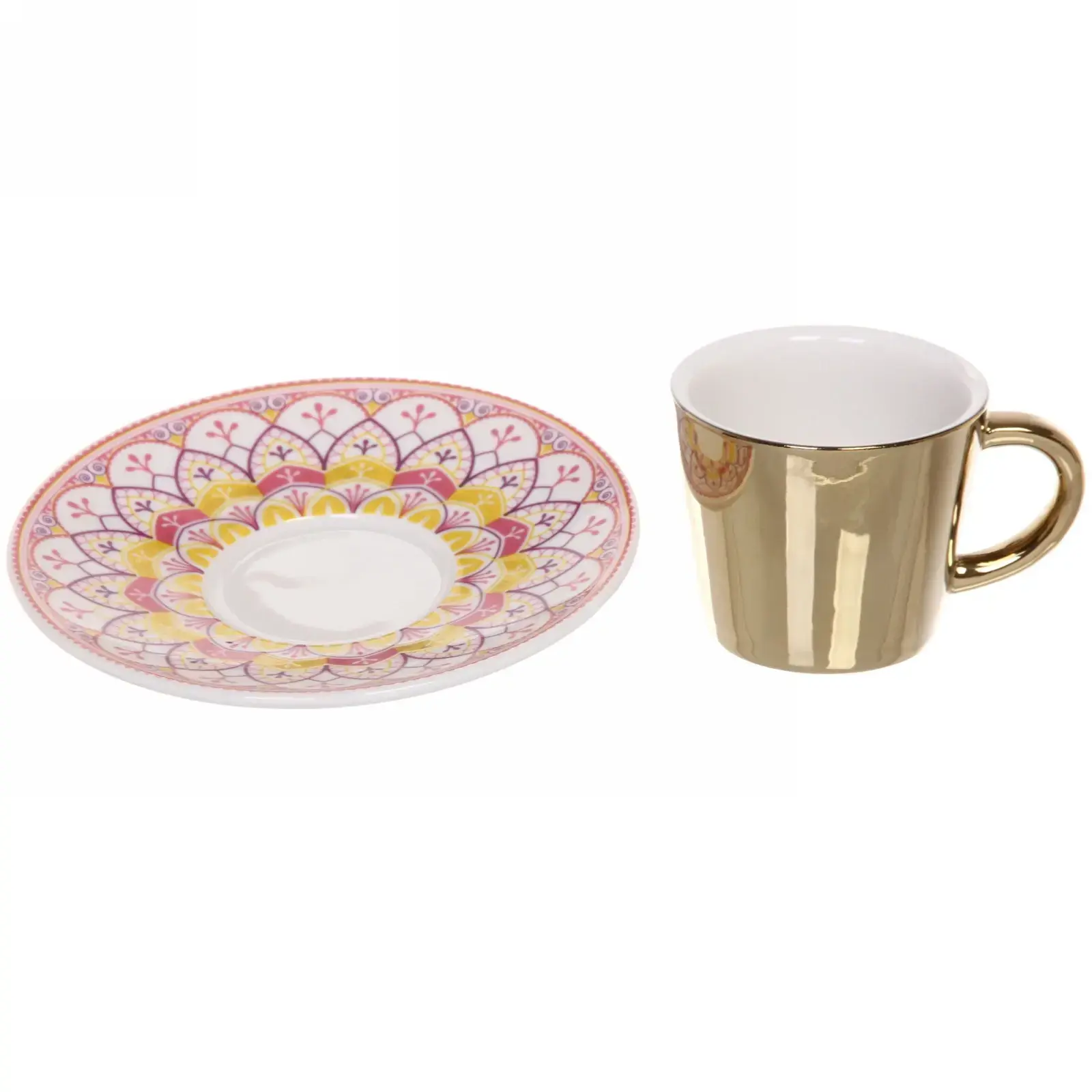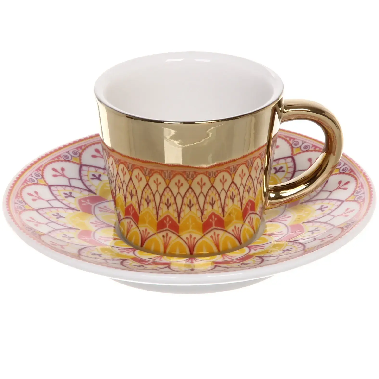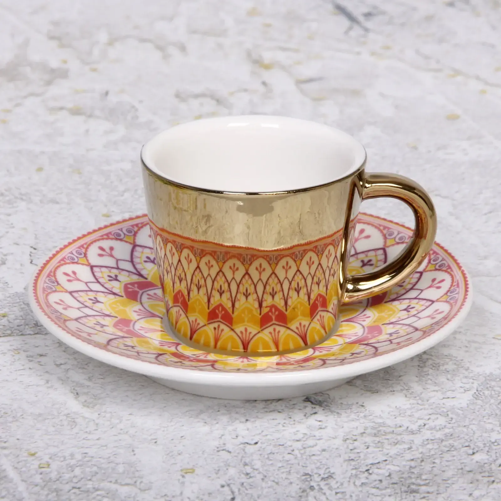 Выбирая эту кофейную пару, вы получаете не только красивый, но и практичный предмет. Керамика, из которой она изготовлена, обладает высокой прочностью и долговечностью, что гарантирует долгий срок службы. Элегантный золотистый край и яркий цветочный узор делают эту пару настоящим произведением искусства, которое украсит любой стол.