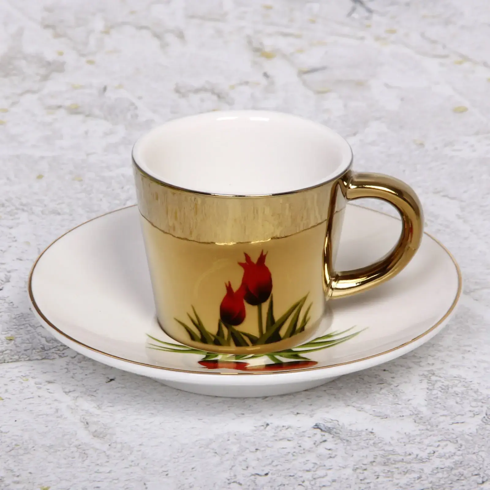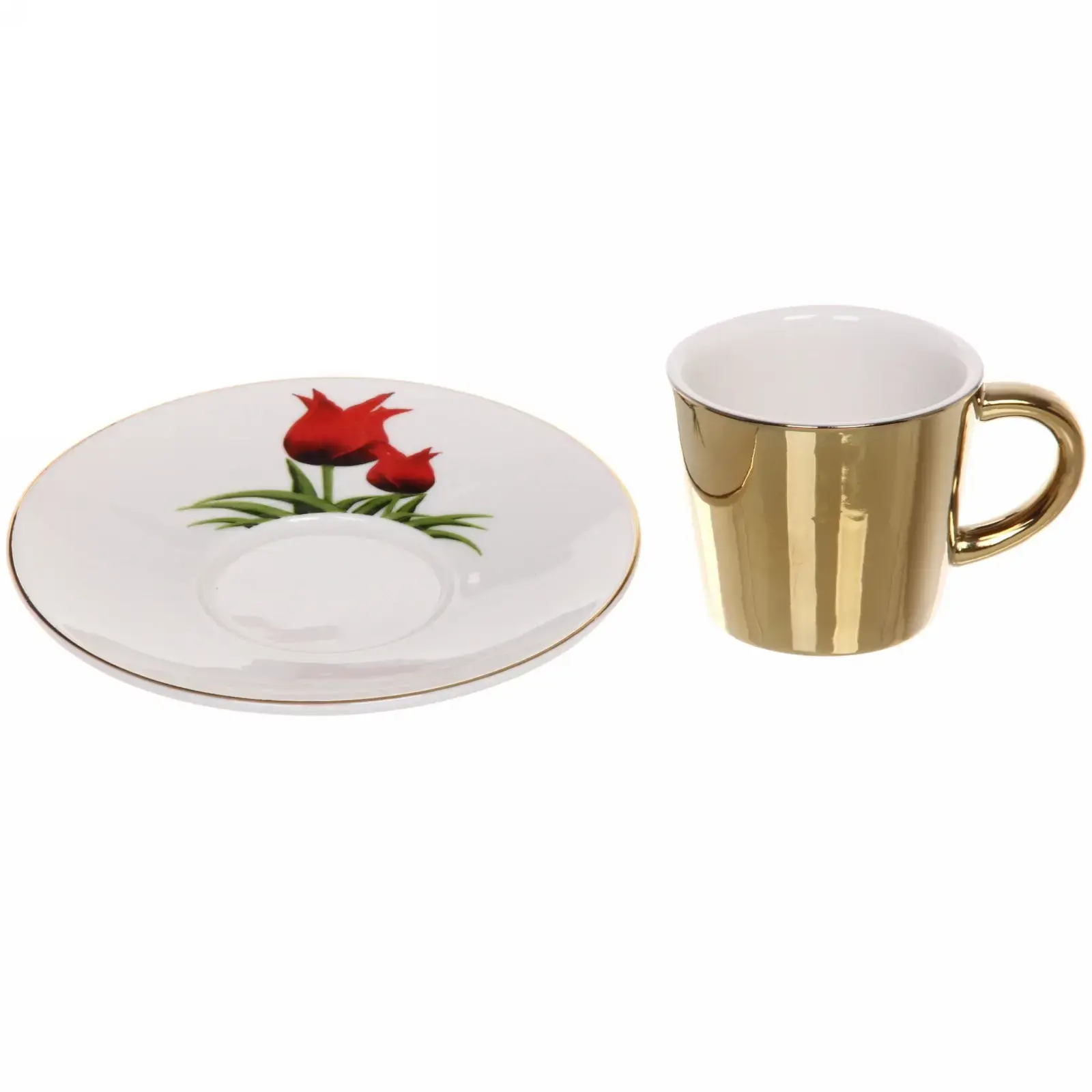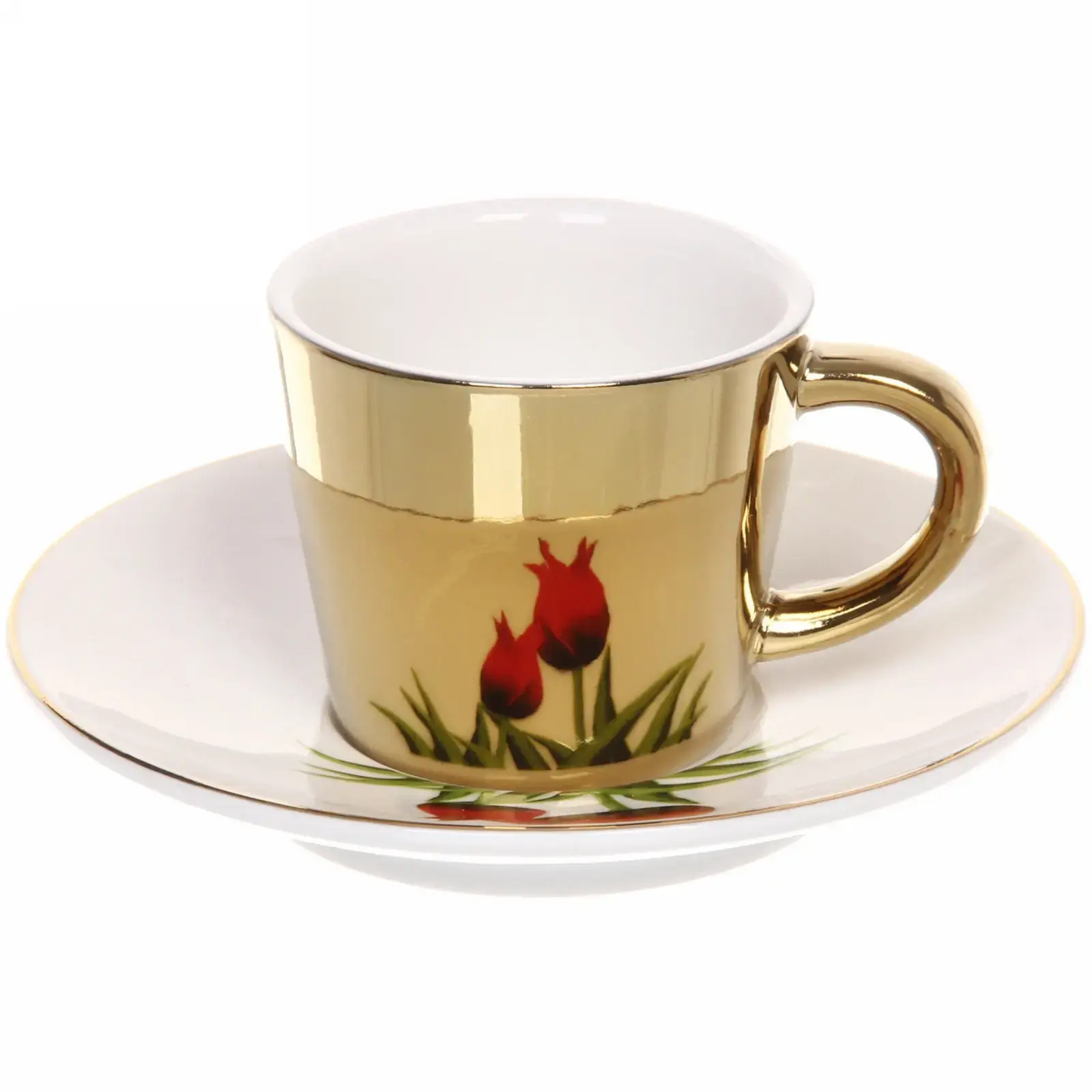 Кофейная пара «Тюльпаны», керамика, кружка 90мл с блюдцем, зеркальный дизайн, золотистая окантовка