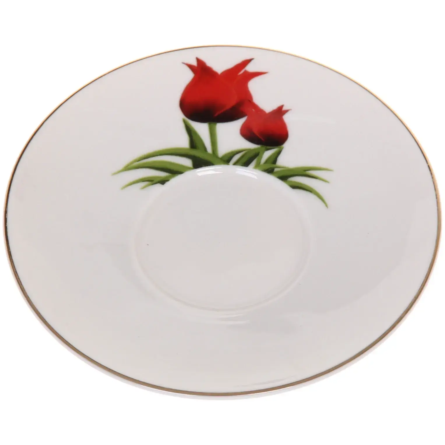 Анаморфная роспись раскрывает объёмное изображение тюльпанов только при определённом угле наклона. Золотистая окантовка по краям посуды добавляет нотку роскоши, делая набор универсальным для классического и современного интерьера.