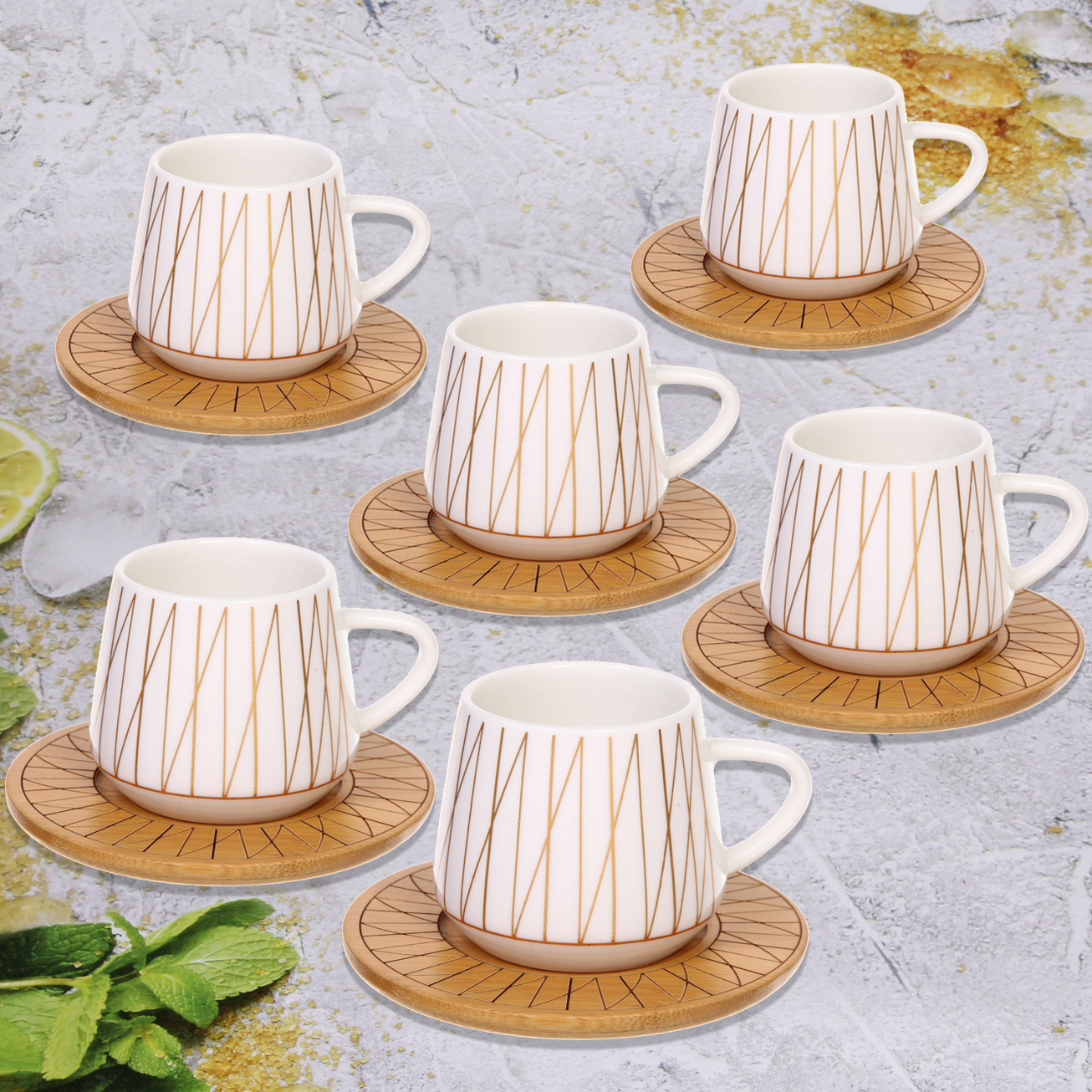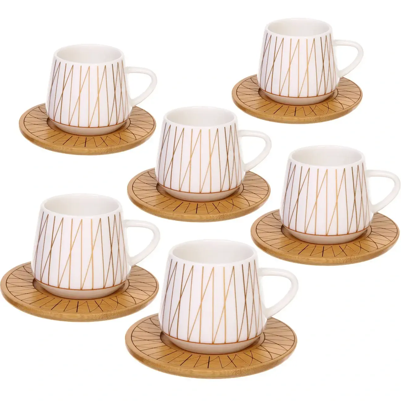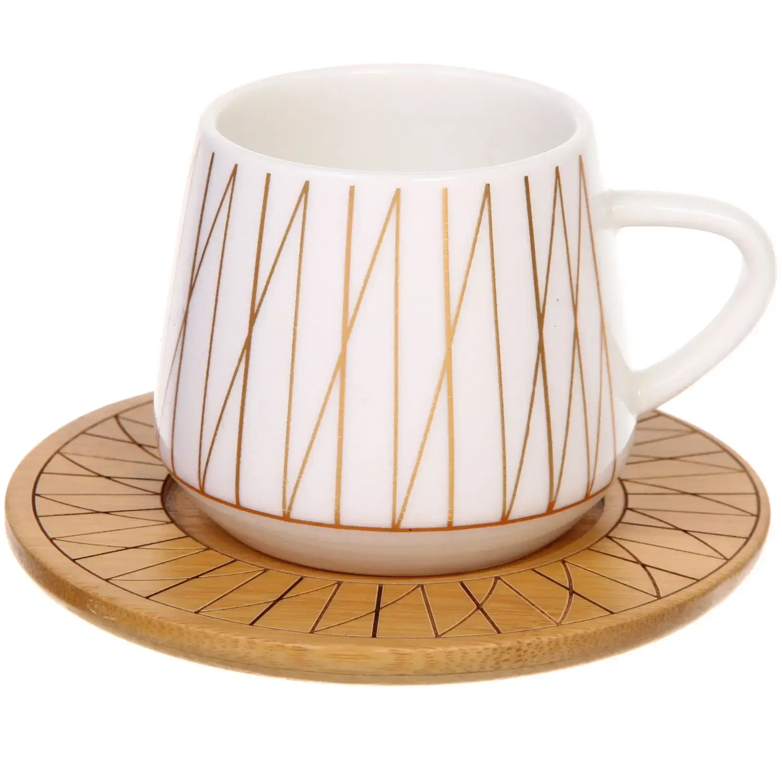 Керамические чашки сохраняют температуру напитка благодаря плотным стенкам, а деревянные блюдца не скользят по поверхности стола. Геометрический узор из золотистых линий добавляет роскоши без вычурности — такой комплект станет достойным украшением вашей кухни или оригинальным подарком.