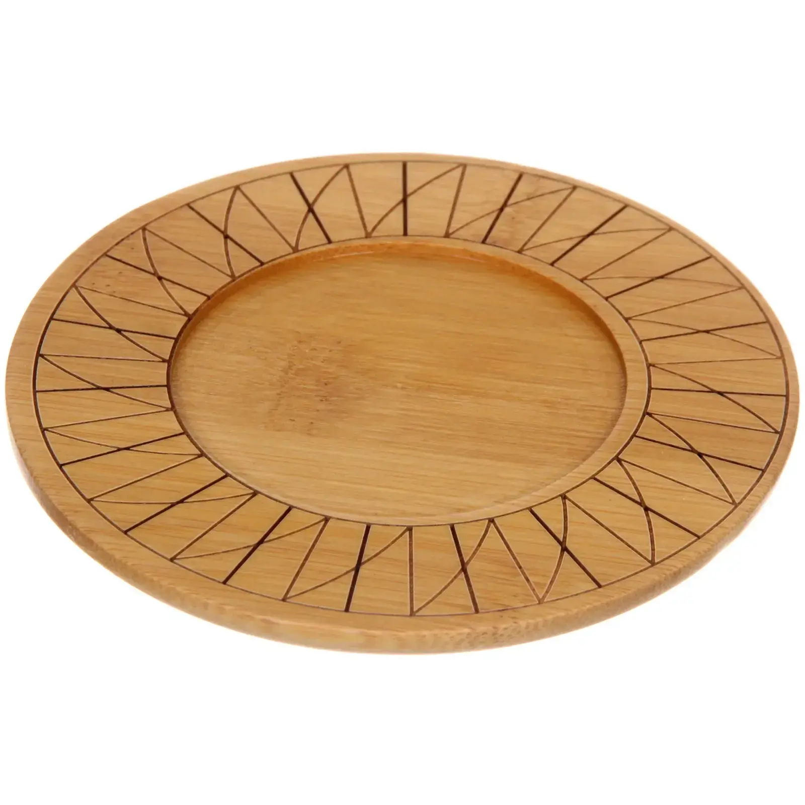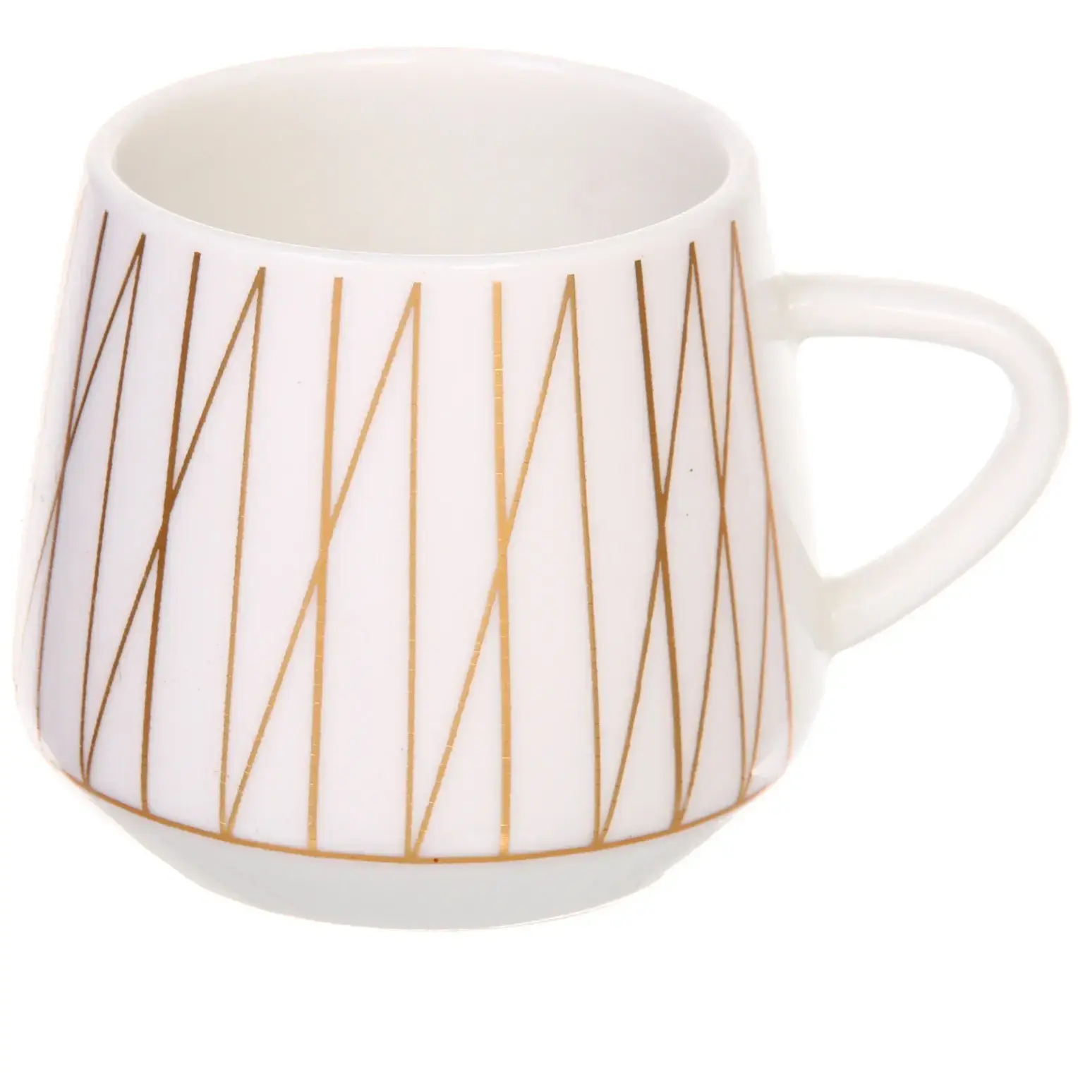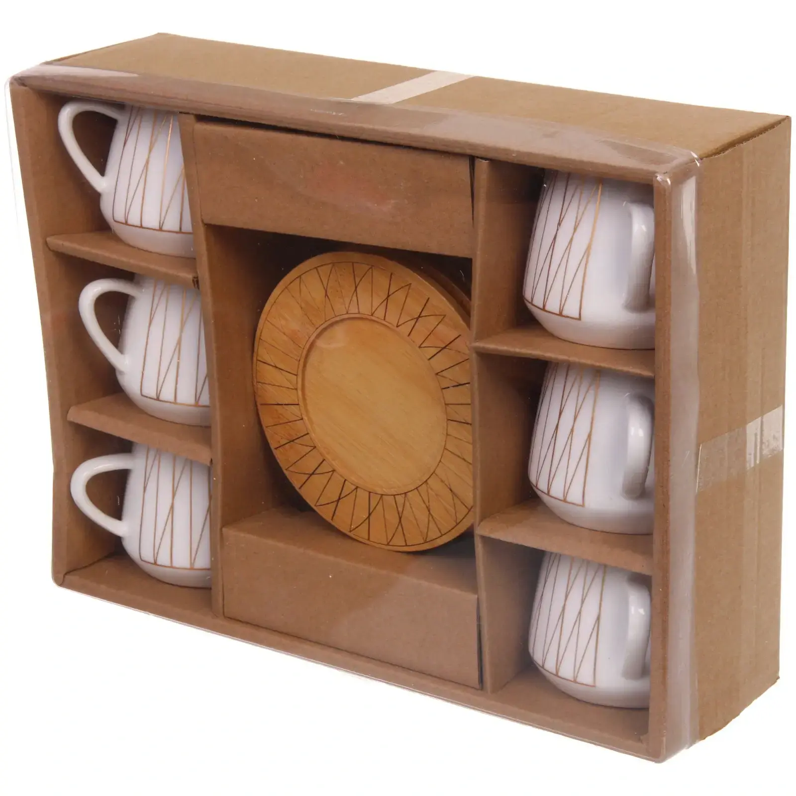 Керамические чашки сохраняют температуру напитка благодаря плотным стенкам, а деревянные блюдца не скользят по поверхности стола. Геометрический узор из золотистых линий добавляет роскоши без вычурности — такой комплект станет достойным украшением вашей кухни или оригинальным подарком.