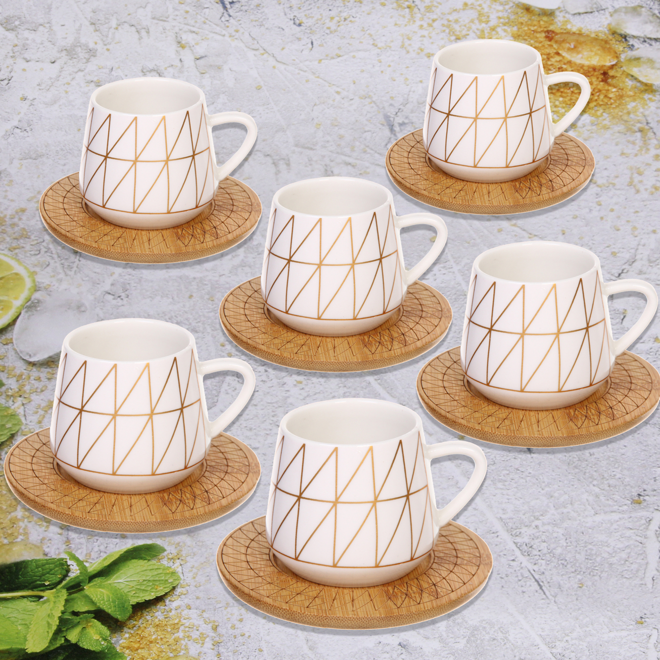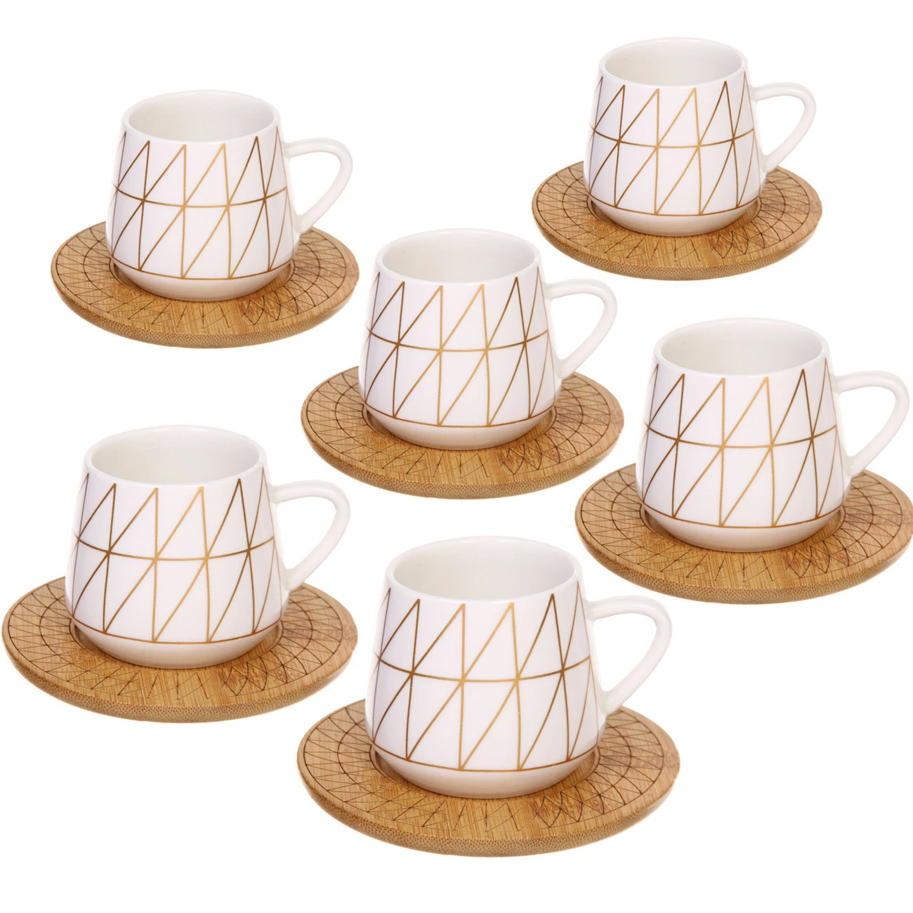 Этот кофейный набор из 12 предметов станет идеальным дополнением вашей кухни. Он сочетает в себе элегантный дизайн и практичность, что делает его отличным выбором для любителей кофе и чая. Каждая кружка объемом 90 мл выполнена из качественной керамики и украшена геометрическим узором в виде треугольников, что придаёт набору современный и стильный вид.