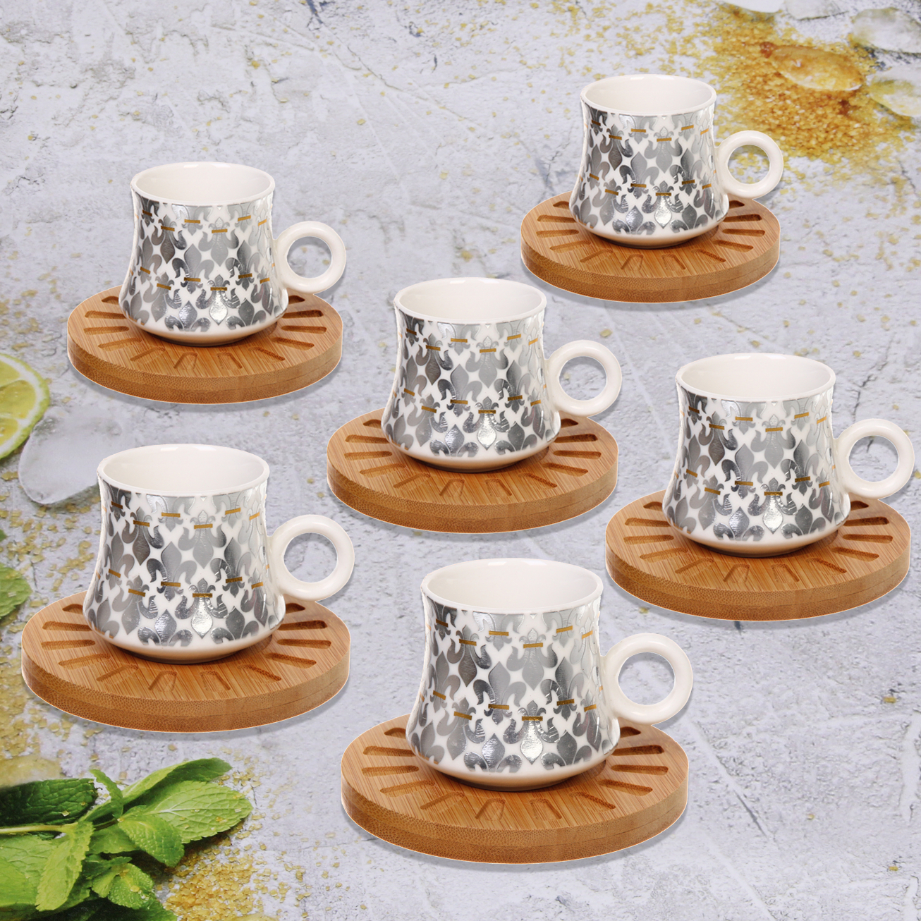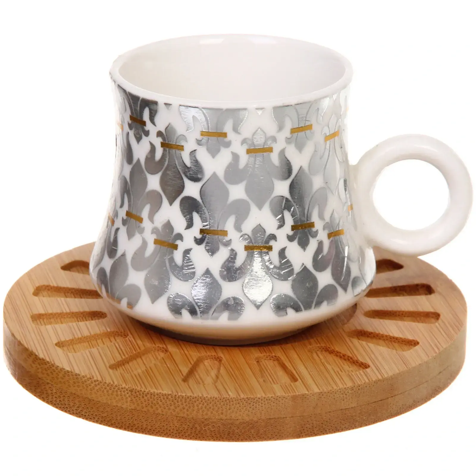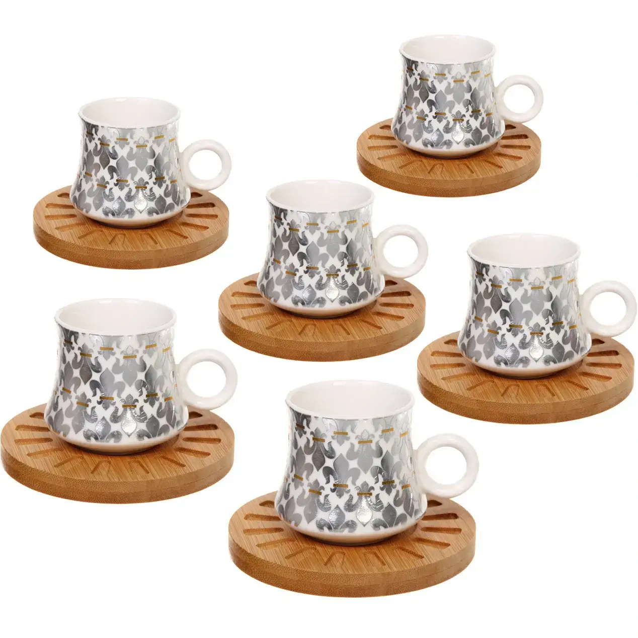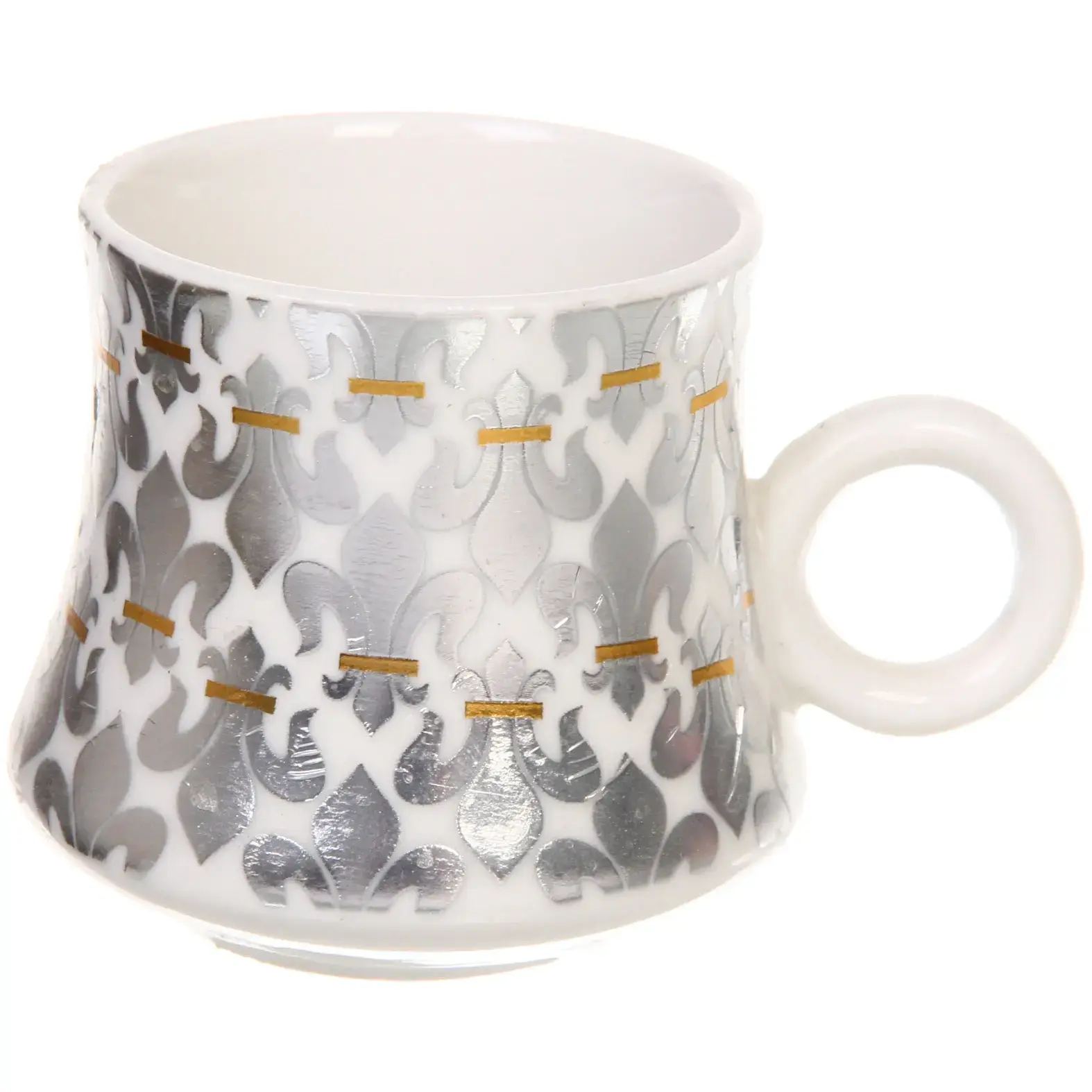 Погрузитесь в атмосферу восточной сказки с нашим кофейным набором, который станет не только функциональным, но и стильным дополнением вашей кухни. Этот набор из 12 предметов включает 6 кружек объемом 90 мл и 6 блюдец, выполненных из высококачественной керамики. Каждый элемент набора украшен изысканным серебристым узором, который придаёт ему уникальный и элегантный вид.