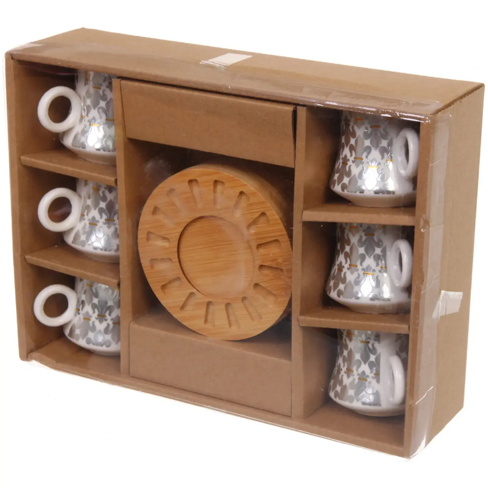 Размер кружек составляет 90 мл, что идеально подходит для подачи кофе или чая. Блюдца также выполнены из керамики и гармонично дополняют набор. Все элементы упакованы в стильную коробку, что делает его отличным вариантом для подарка. Не упустите возможность добавить этот изысканный набор в свою коллекцию кухонной посуды!