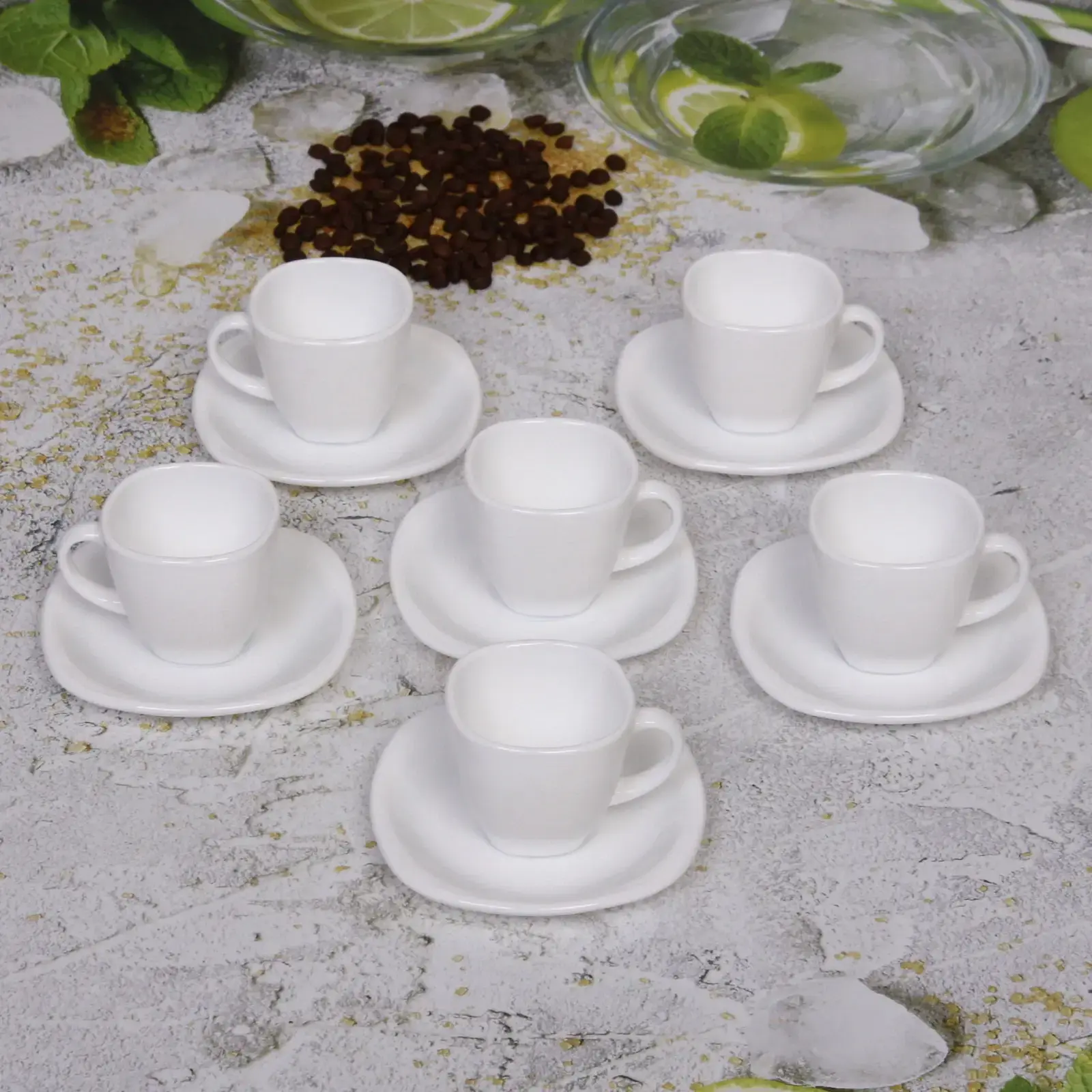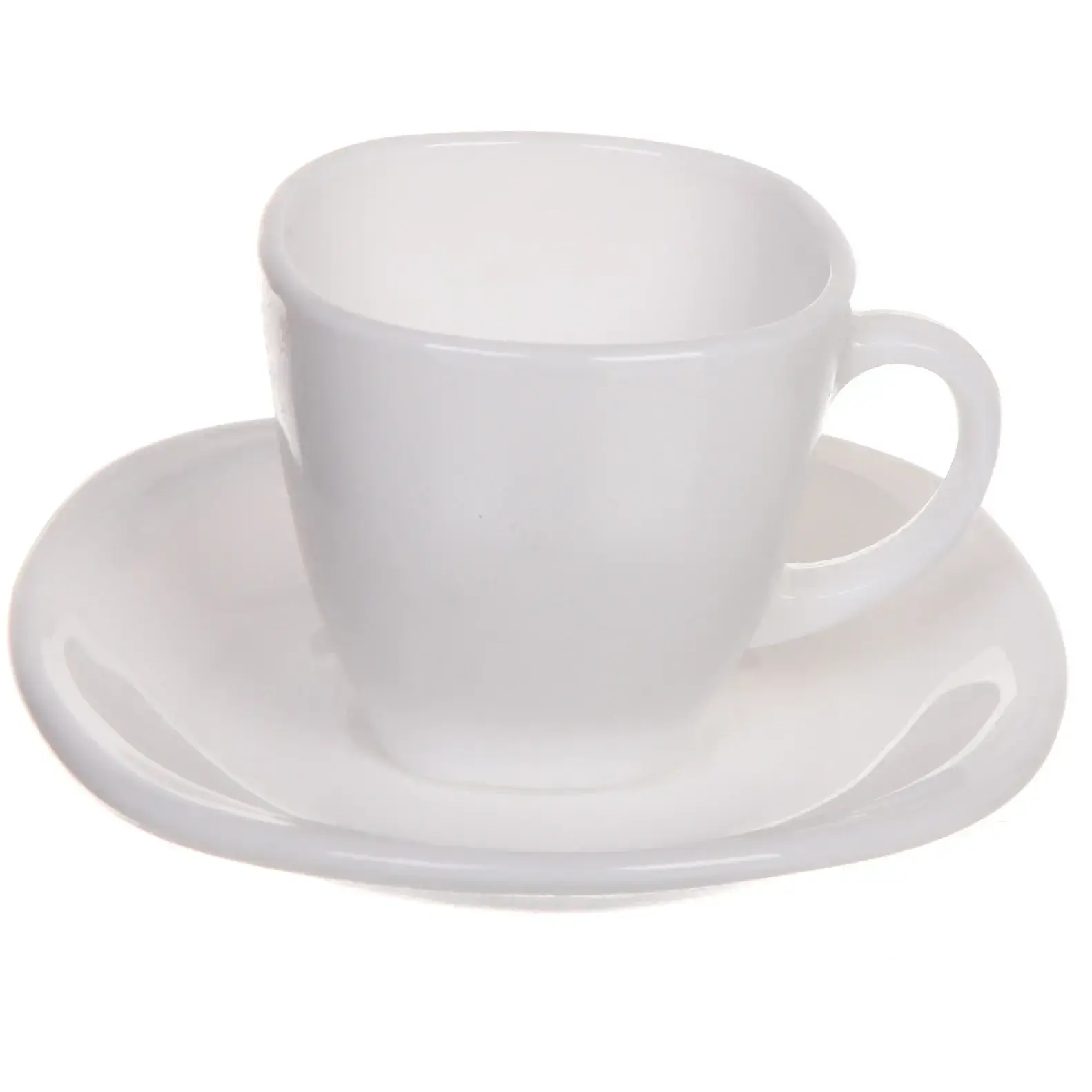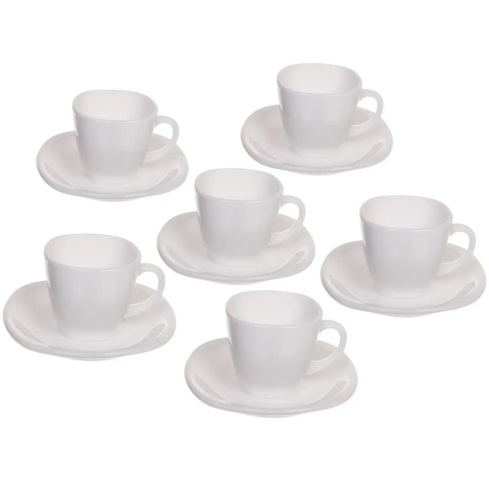 Кружки и блюдца выполнены из качественного стекла, что обеспечивает их надежность и долговечность. Белый цвет и гладкая поверхность делают набор универсальным, подходящим для любого интерьера. Размер кружек в 85 мл идеально подходит для подачи кофе или чая, а блюдца обеспечивают удобство сервировки.