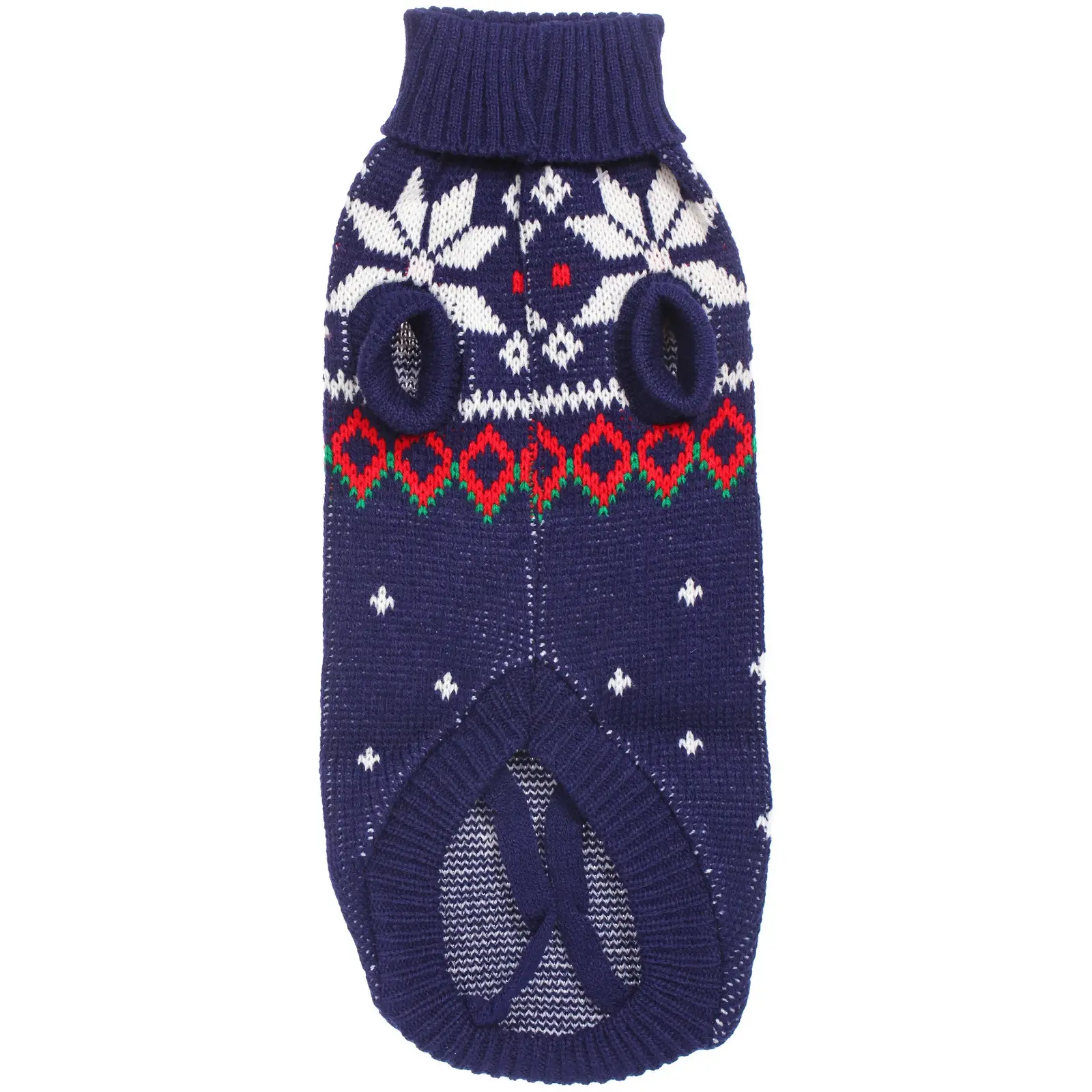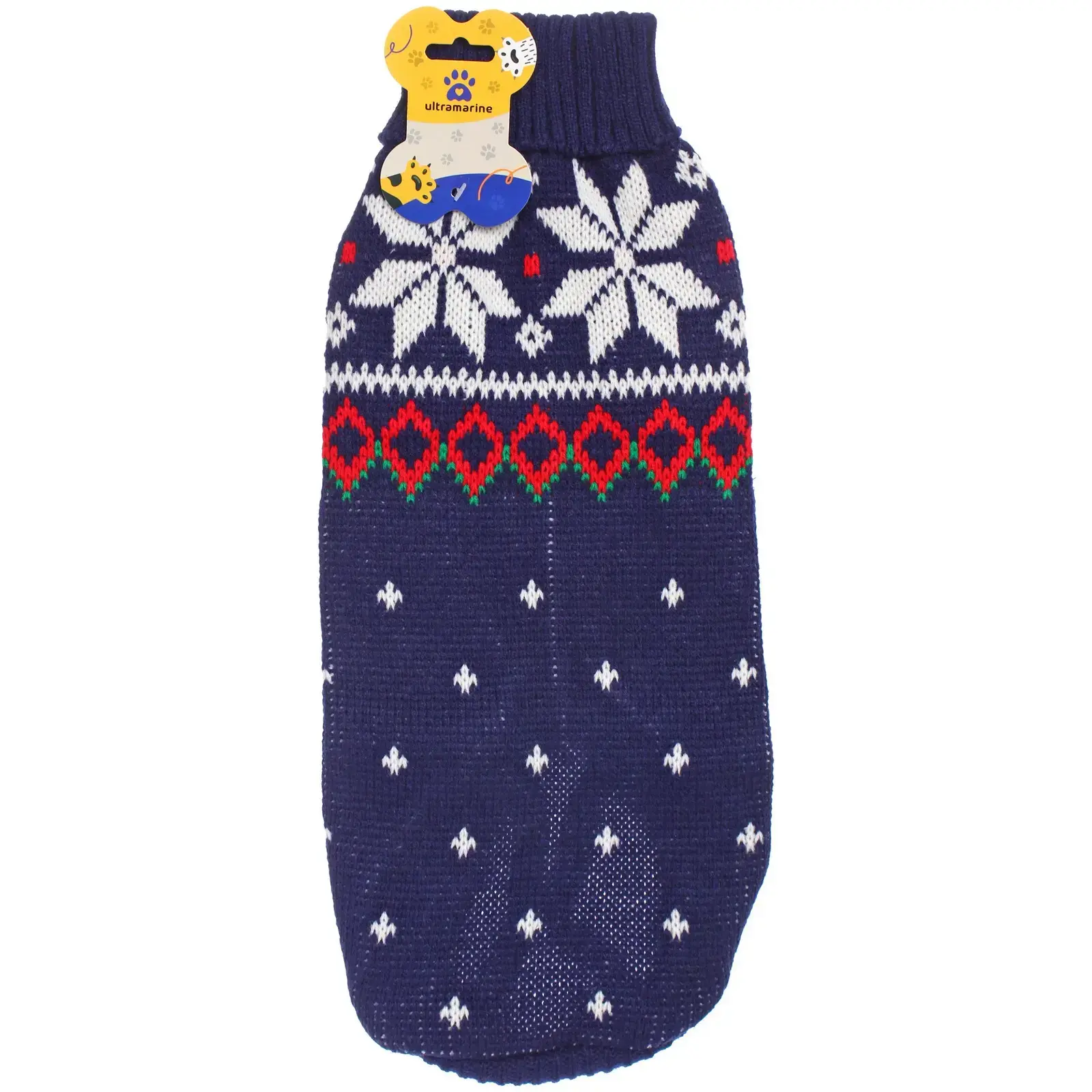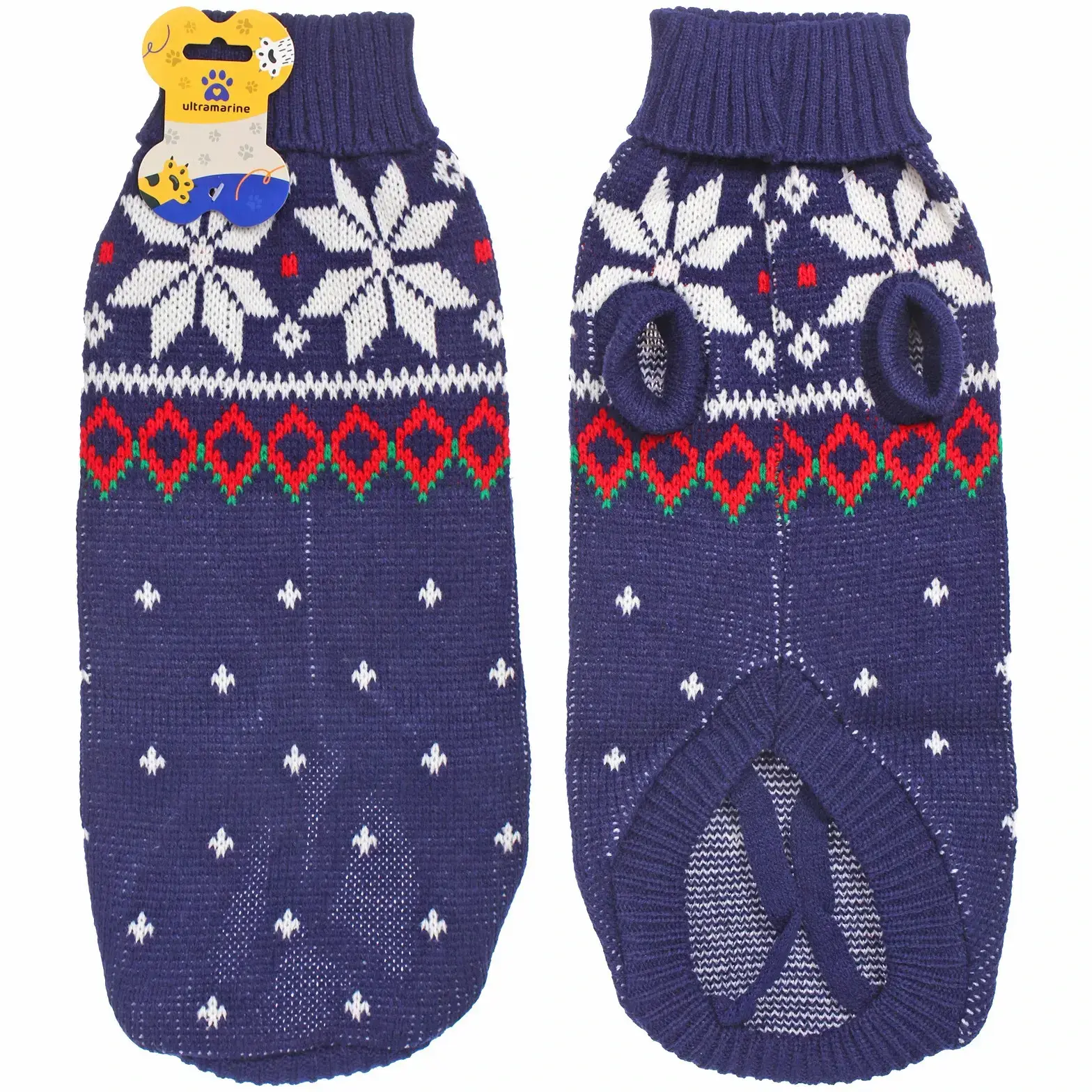 Свитер легко надевается и снимается благодаря высокому воротнику и удобным вырезам для лап. Он подходит для мелких пород собак и кошек, обеспечивая свободу движений и комфорт. Дизайн с снежинками и геометрическими узорами добавляет стильный акцент, а насыщенный синий цвет делает его универсальным для любого гардероба питомца.