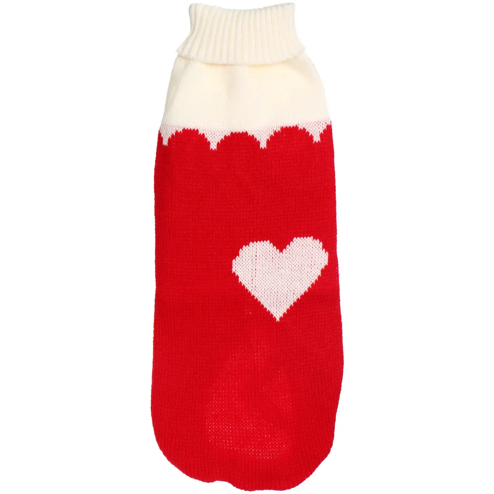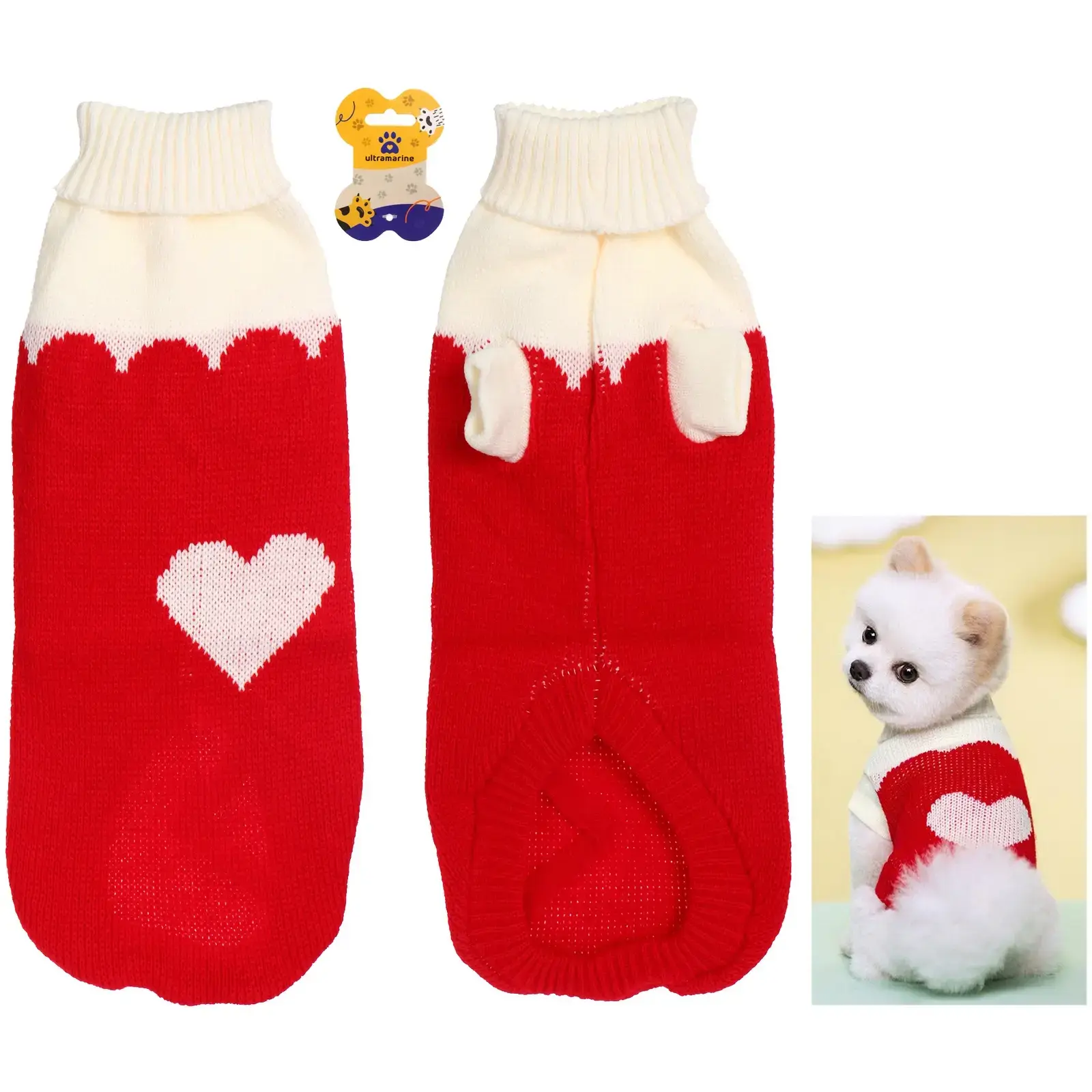 Свитер легко надевается и снимается благодаря продуманному дизайну с вырезами для лап. Он подходит для повседневной носки и прогулок на свежем воздухе. Яркий красный цвет с белым воротником и узором в виде сердца делает его стильным аксессуаром для вашего питомца.