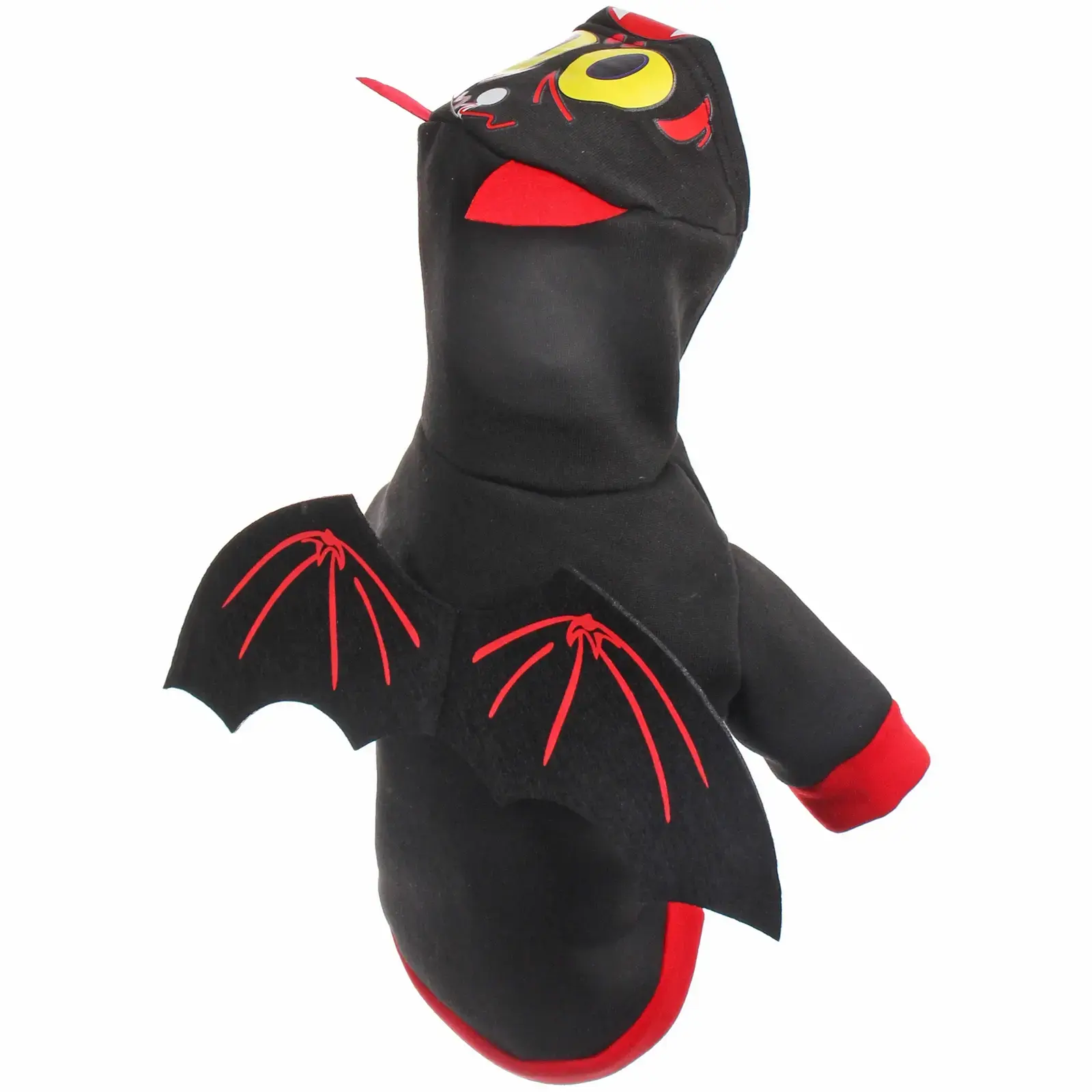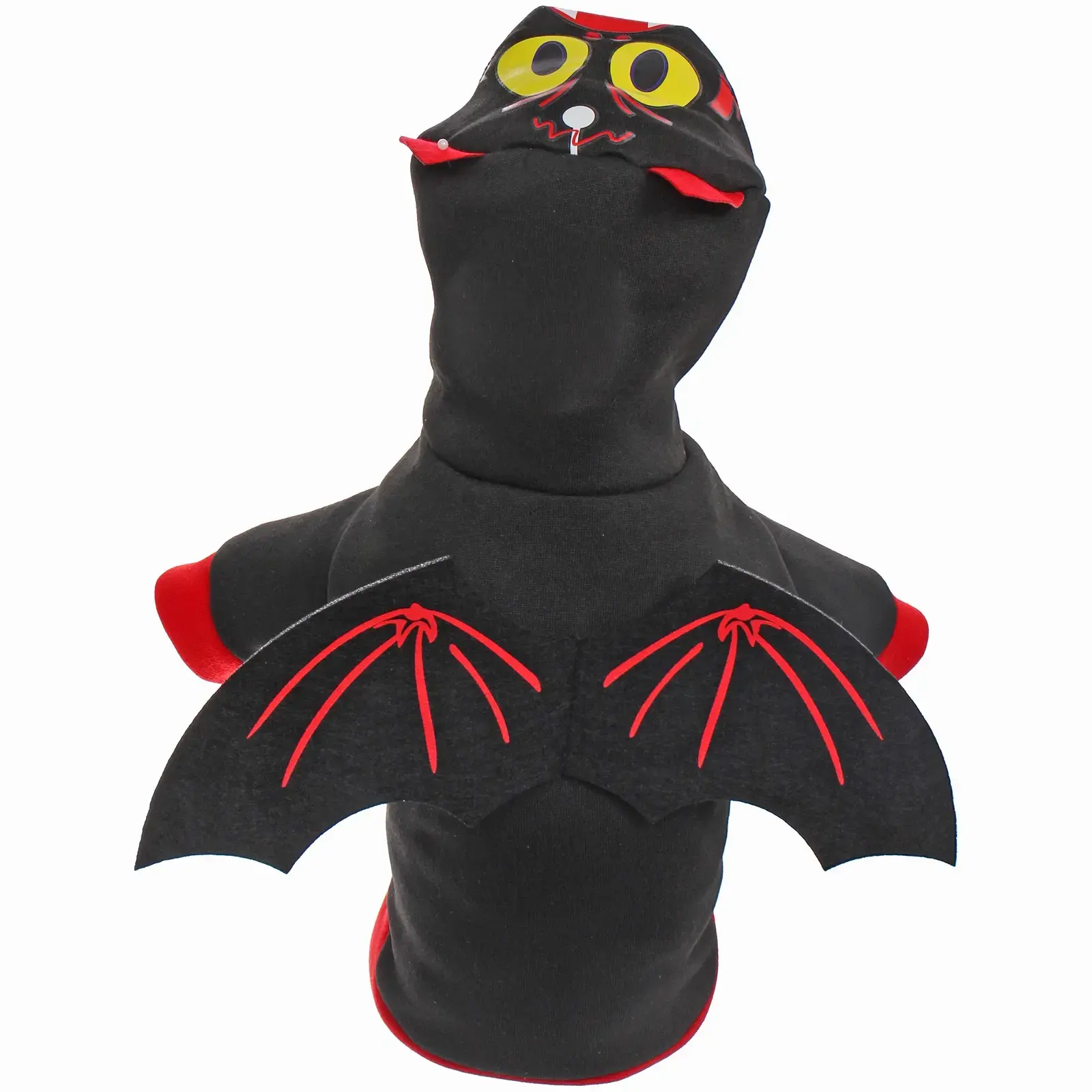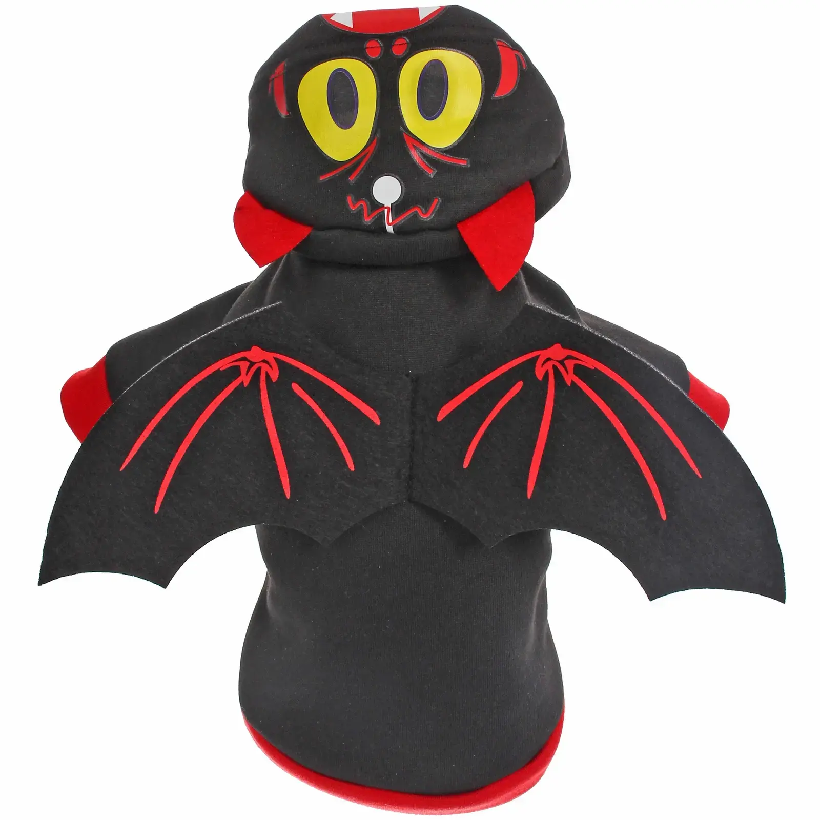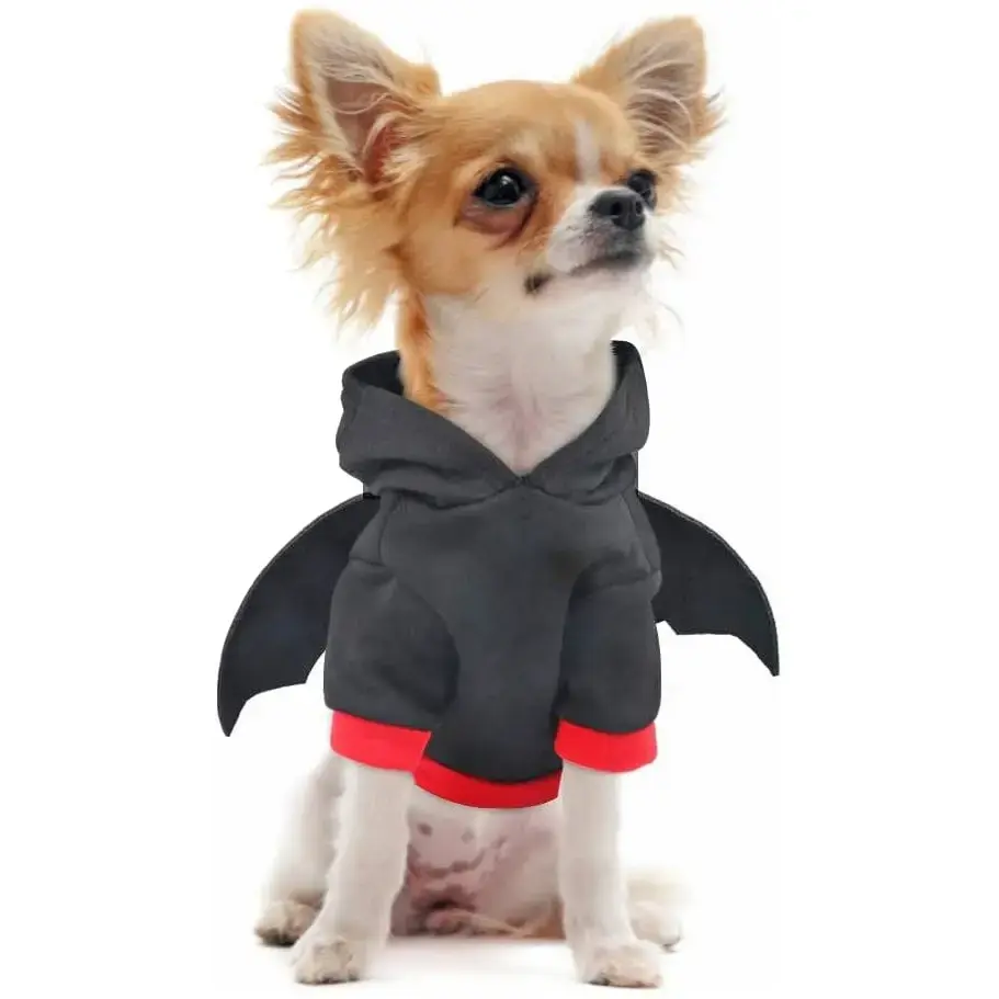 Толстовка предназначена для собак мелких пород, таких как чихуахуа и йоркширский терьер. Она легко надевается и снимается благодаря удобному дизайну с капюшоном. Капюшон оформлен в виде головы летучей мыши, что добавляет оригинальности и делает ваш питомец центром внимания на прогулке или на празднике.
