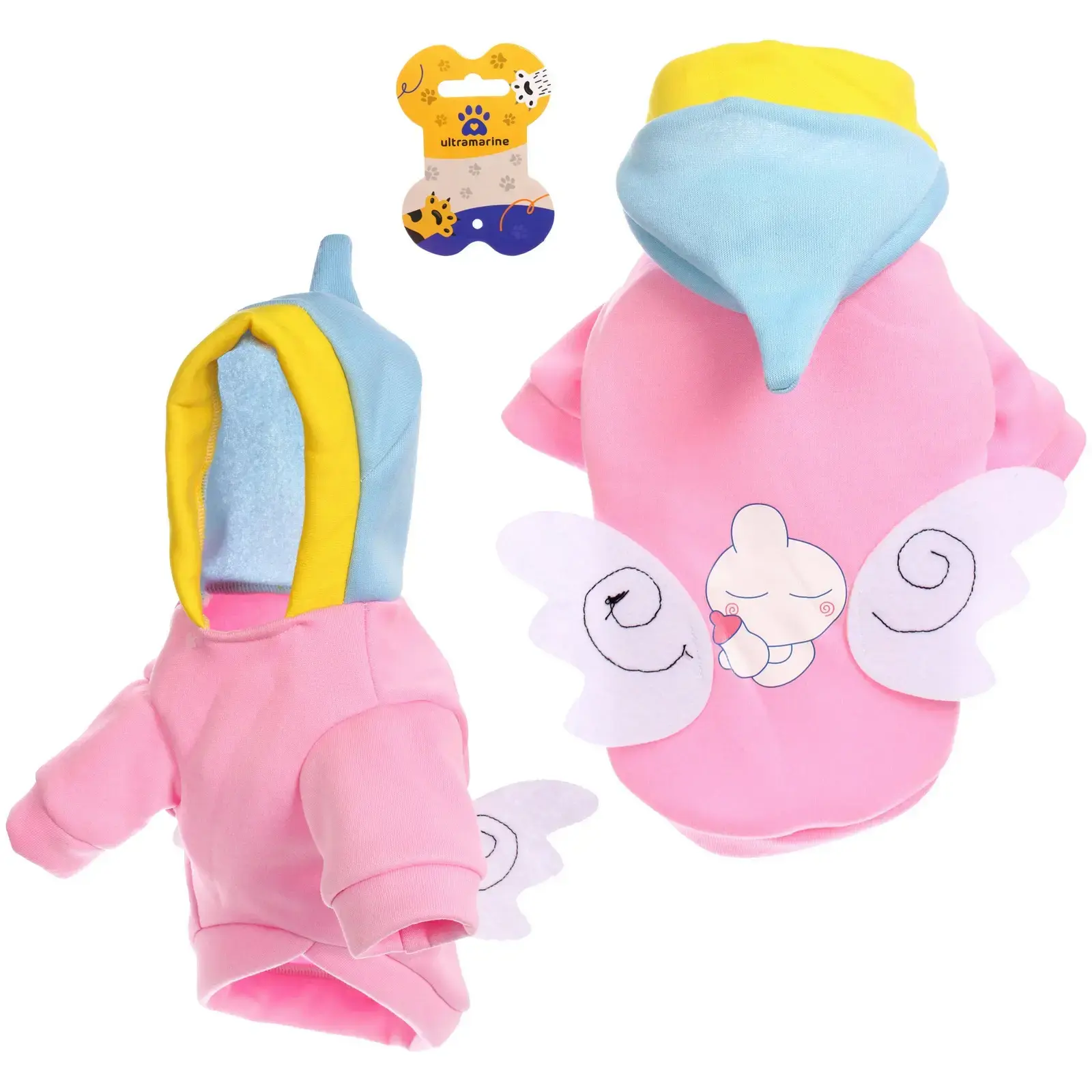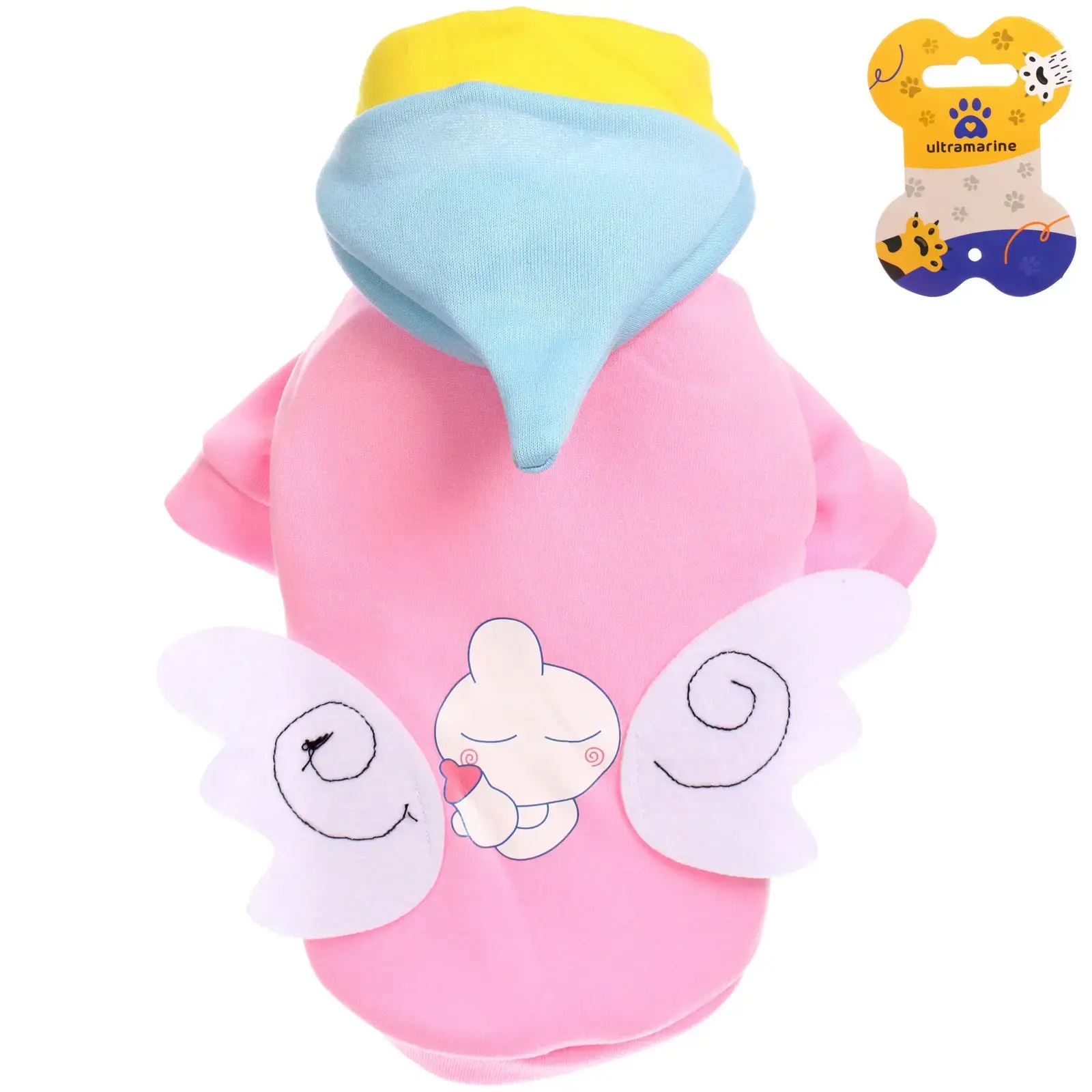 Толстовка предназначена для мелких пород собак и легко надевается через голову. Капюшон с милым дизайном добавляет игривости образу, а аппликация в виде крыльев на спине придаёт наряду уникальность. Этот наряд отлично подходит для прогулок на свежем воздухе, а также для домашних мероприятий, где ваш питомец будет в центре внимания.