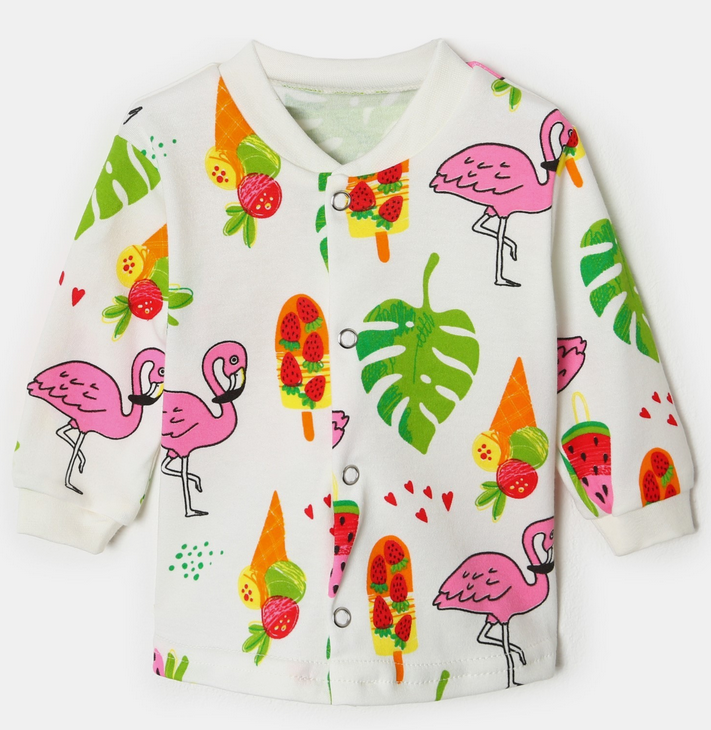 Мягкая 100% хлопковая кофточка подарит вашему ребенку ощущение нежности и свободы движений, а яркие принты с фламинго, фруктами и листочками сделают каждый день радостным приключением.