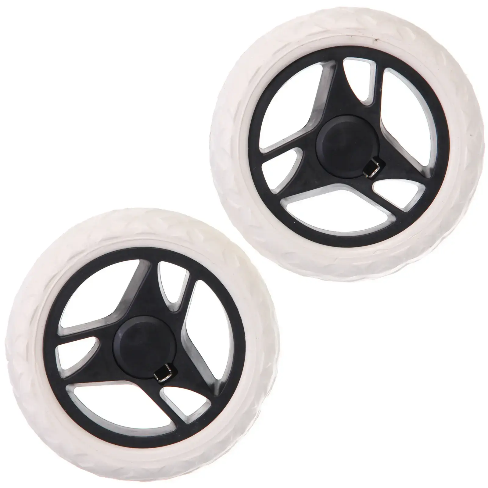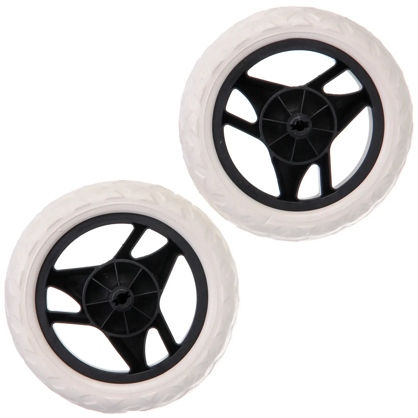Каждое колесо имеет диаметр 17 см и ширину 3,3 см, что делает их универсальными для большинства моделей. Черные пластиковые диски с трёхспицевой конструкцией обеспечивают дополнительную прочность и надежность. Эти колеса станут отличным выбором для тех, кто ценит качество и комфорт в передвижении.