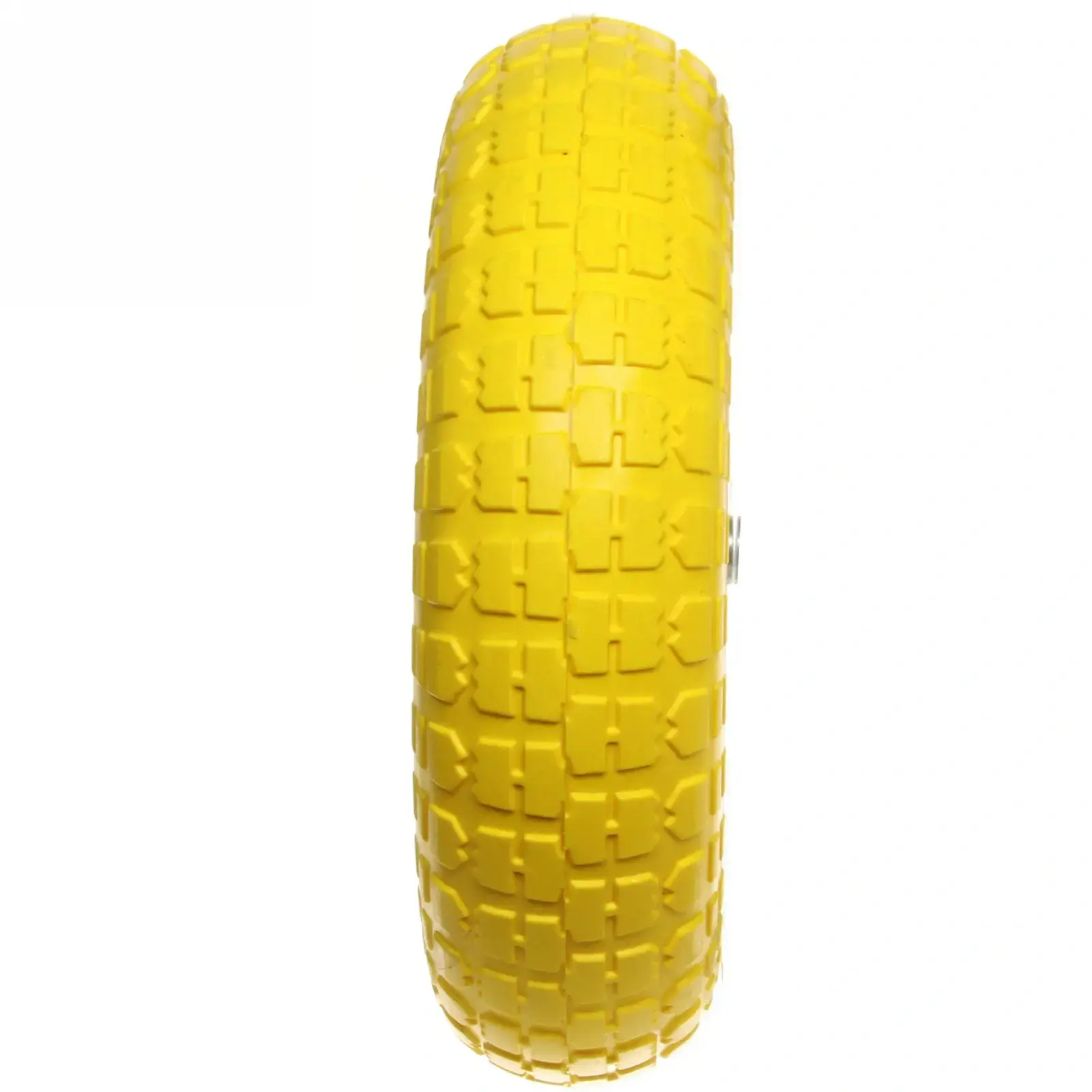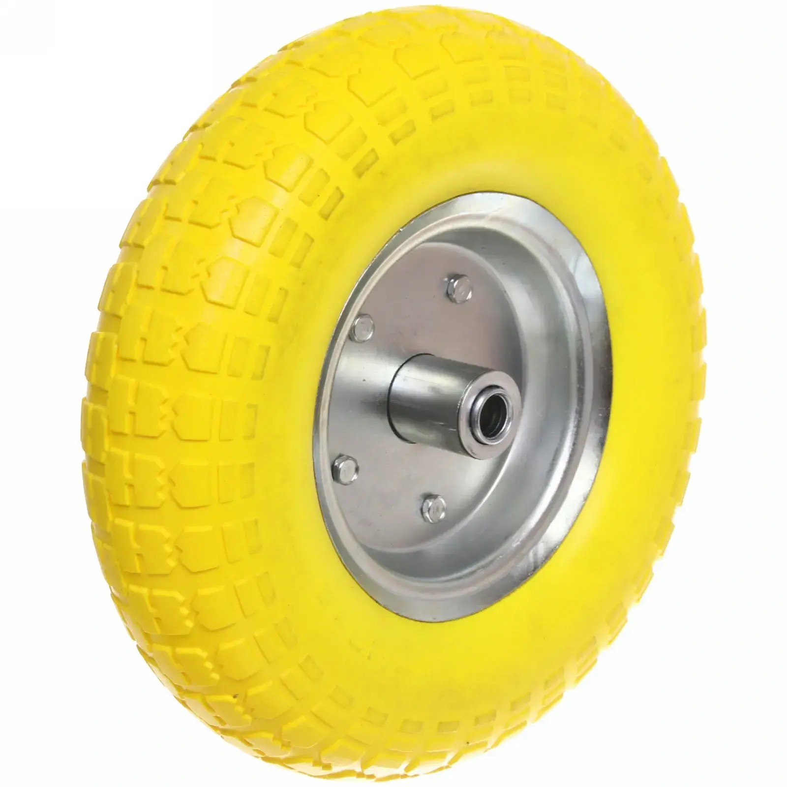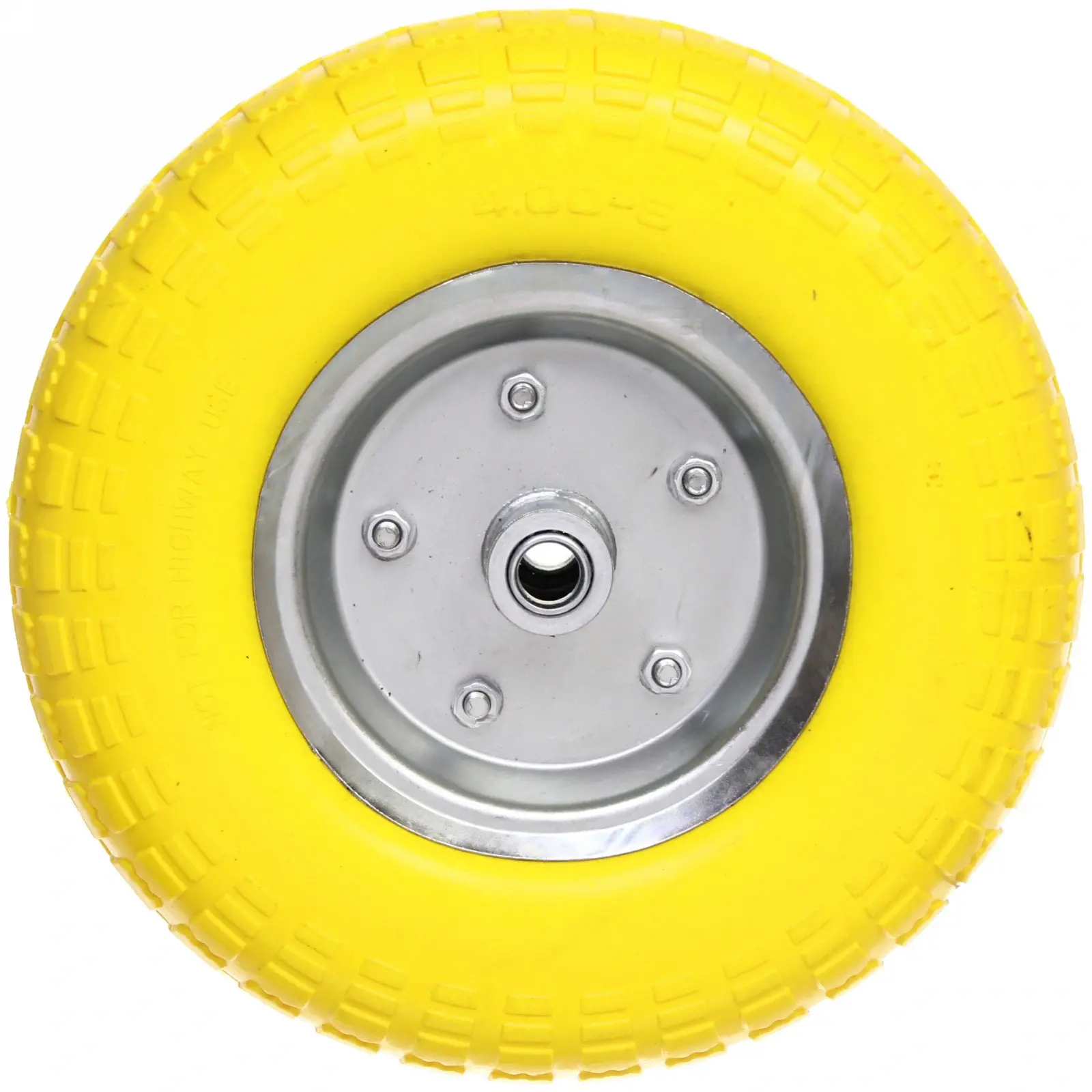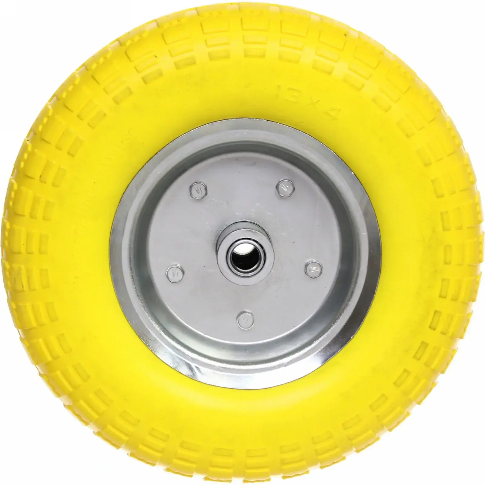 Размеры колеса: 13 дюймов в диаметре и 4 дюйма в ширине. Материал: вспененный полиуретан, который обеспечивает отличное сцепление и долговечность. Цвет колеса — ярко-желтый, что делает его заметным и стильным дополнением к вашей тачке.