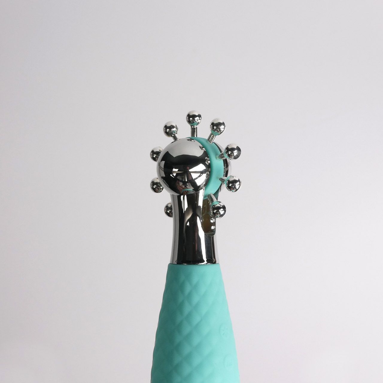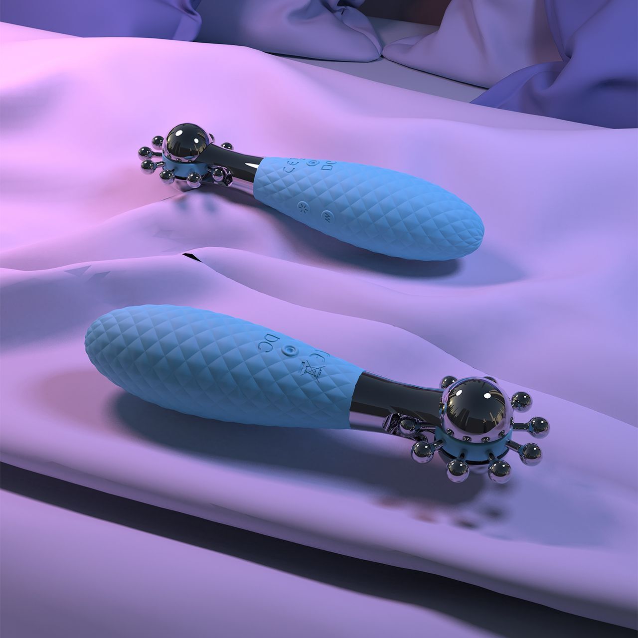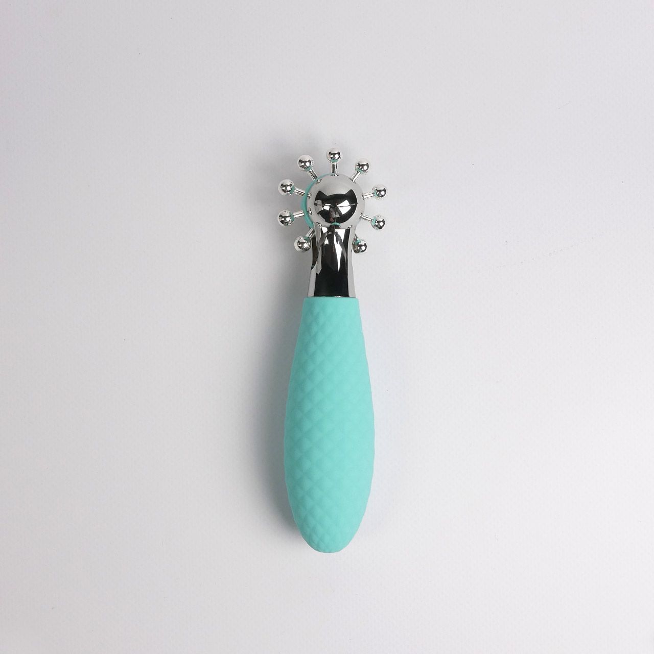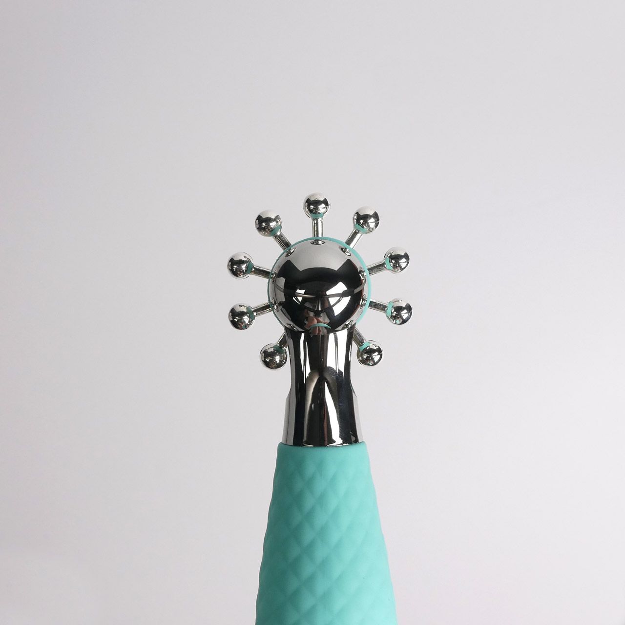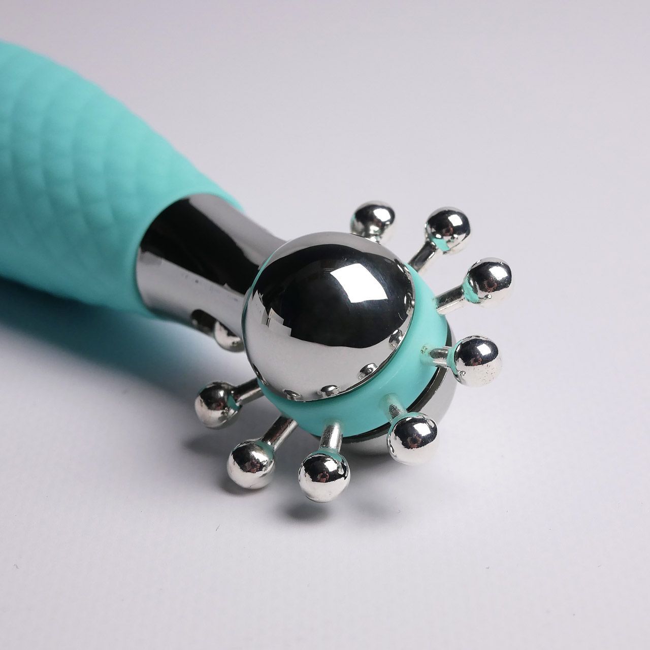 Эргономичная ручка с текстурированным покрытием обеспечивает надежный хват. Металлическая головка диаметром около 4 см дополнена вращающимися элементами для интенсивной стимуляции. Общая длина устройства составляет примерно 18 см.