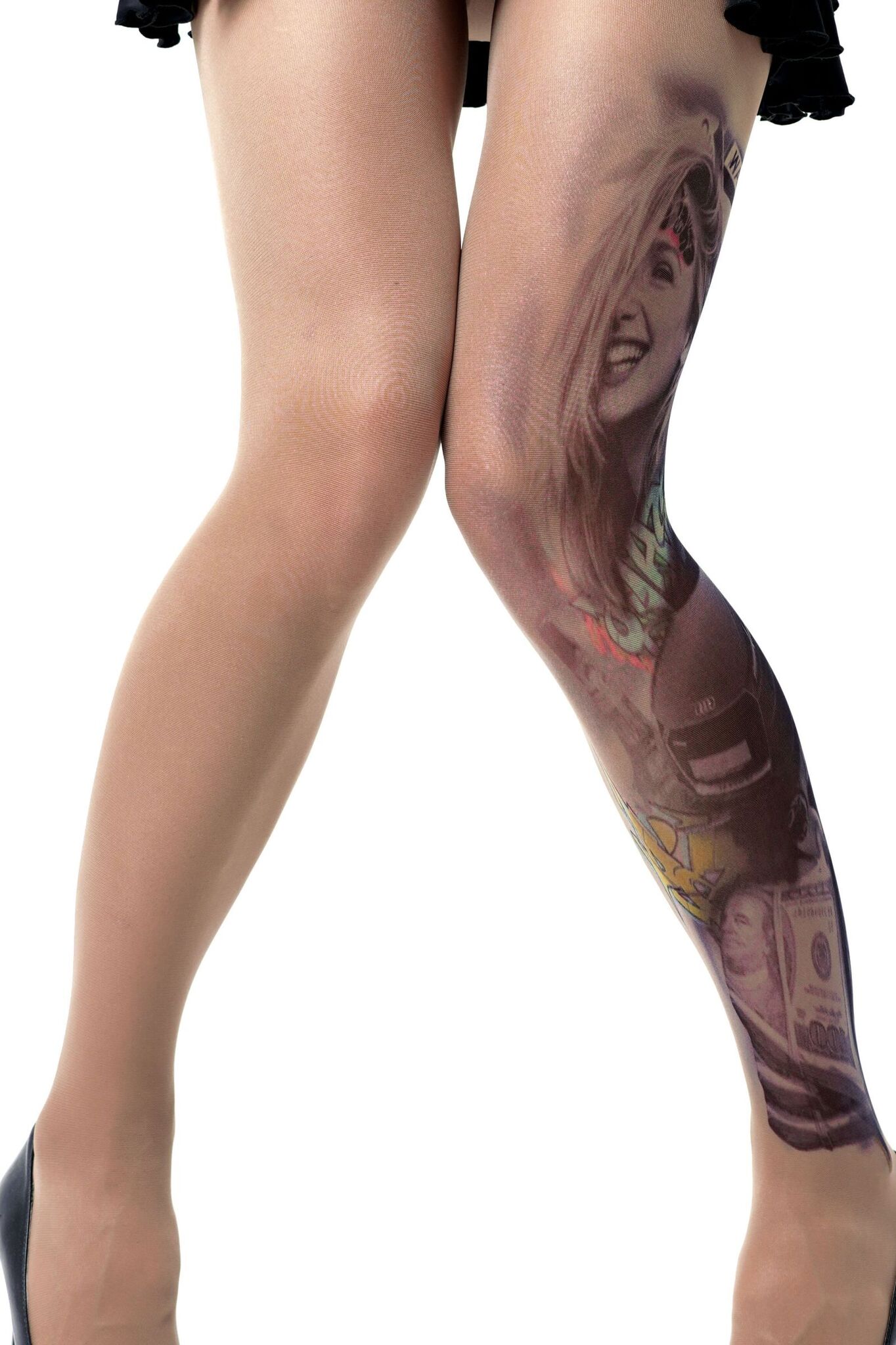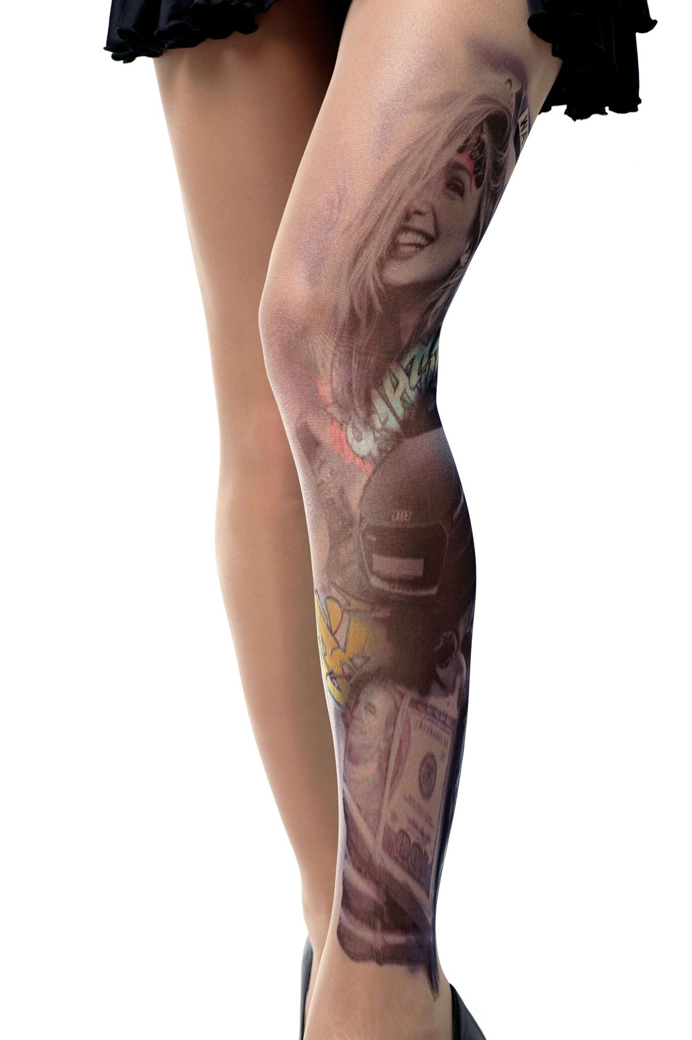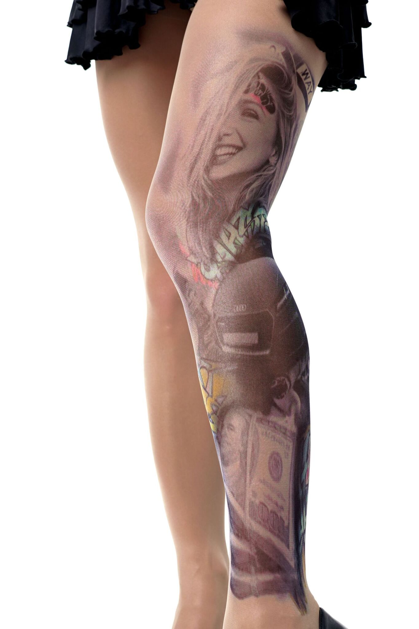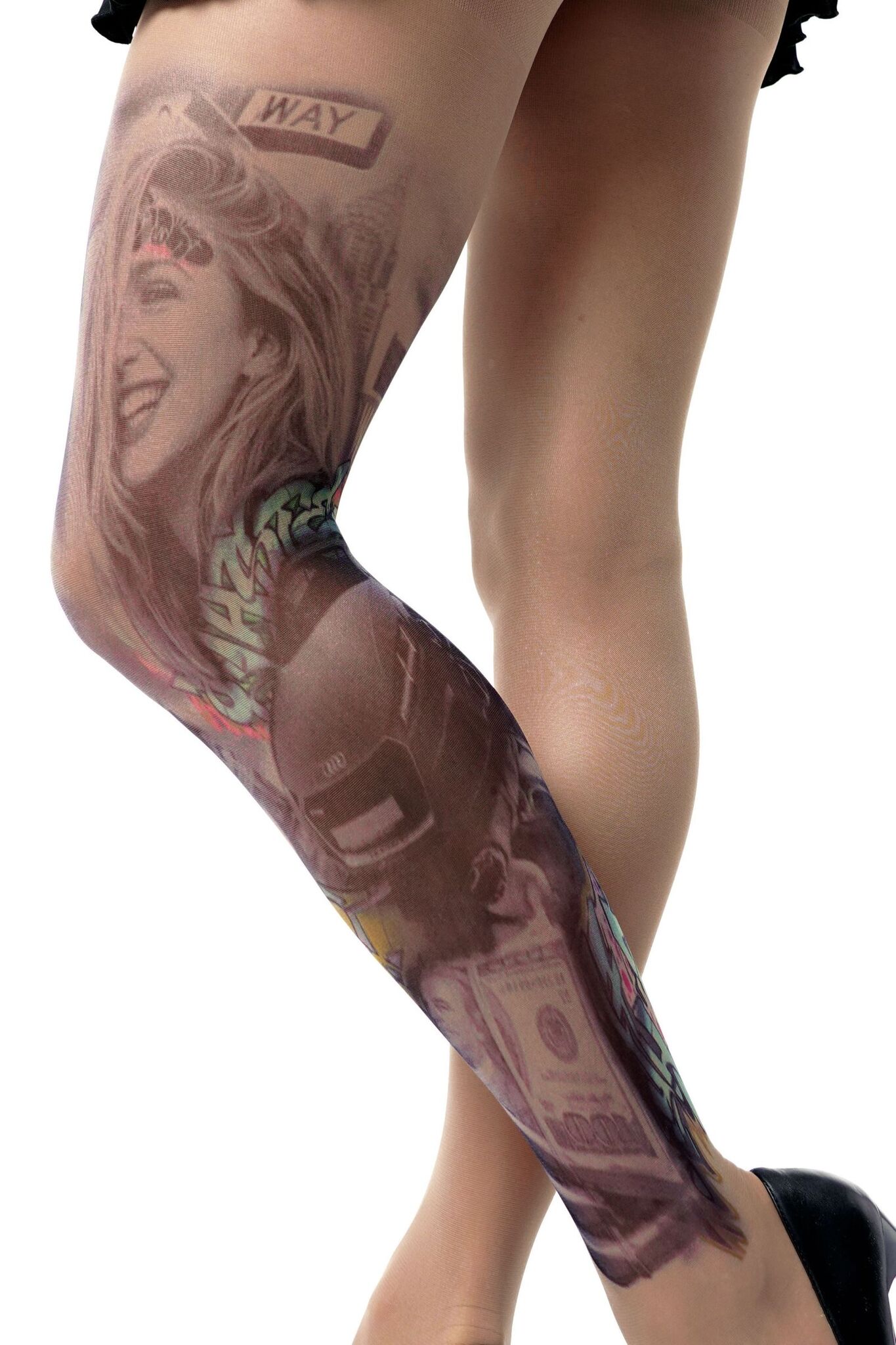 Эксклюзивные колготки с художественным принтом станут вашим секретным оружием для создания дерзкого лука. Уникальный дизайн в стиле уличного граффити с элементами тату превратит обычный наряд в модный арт-объект.