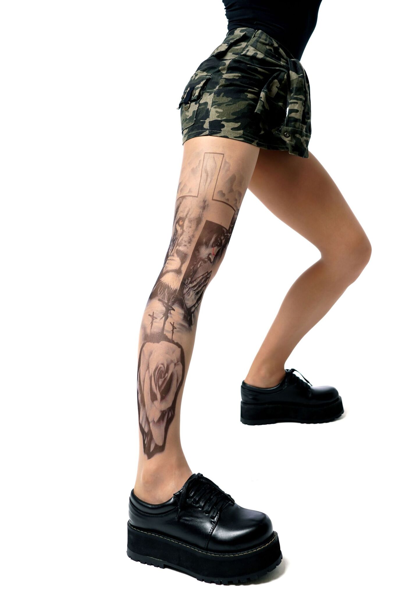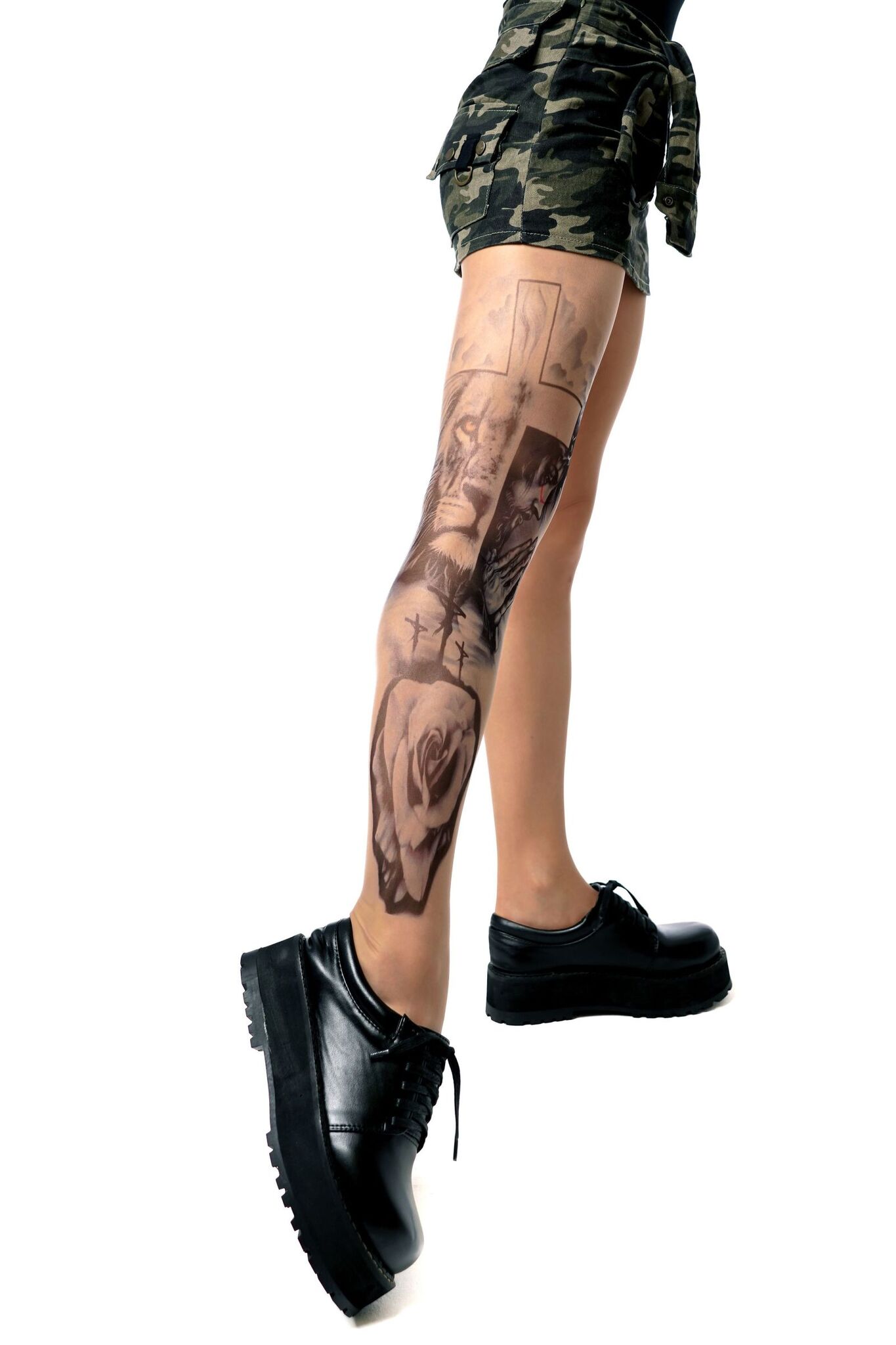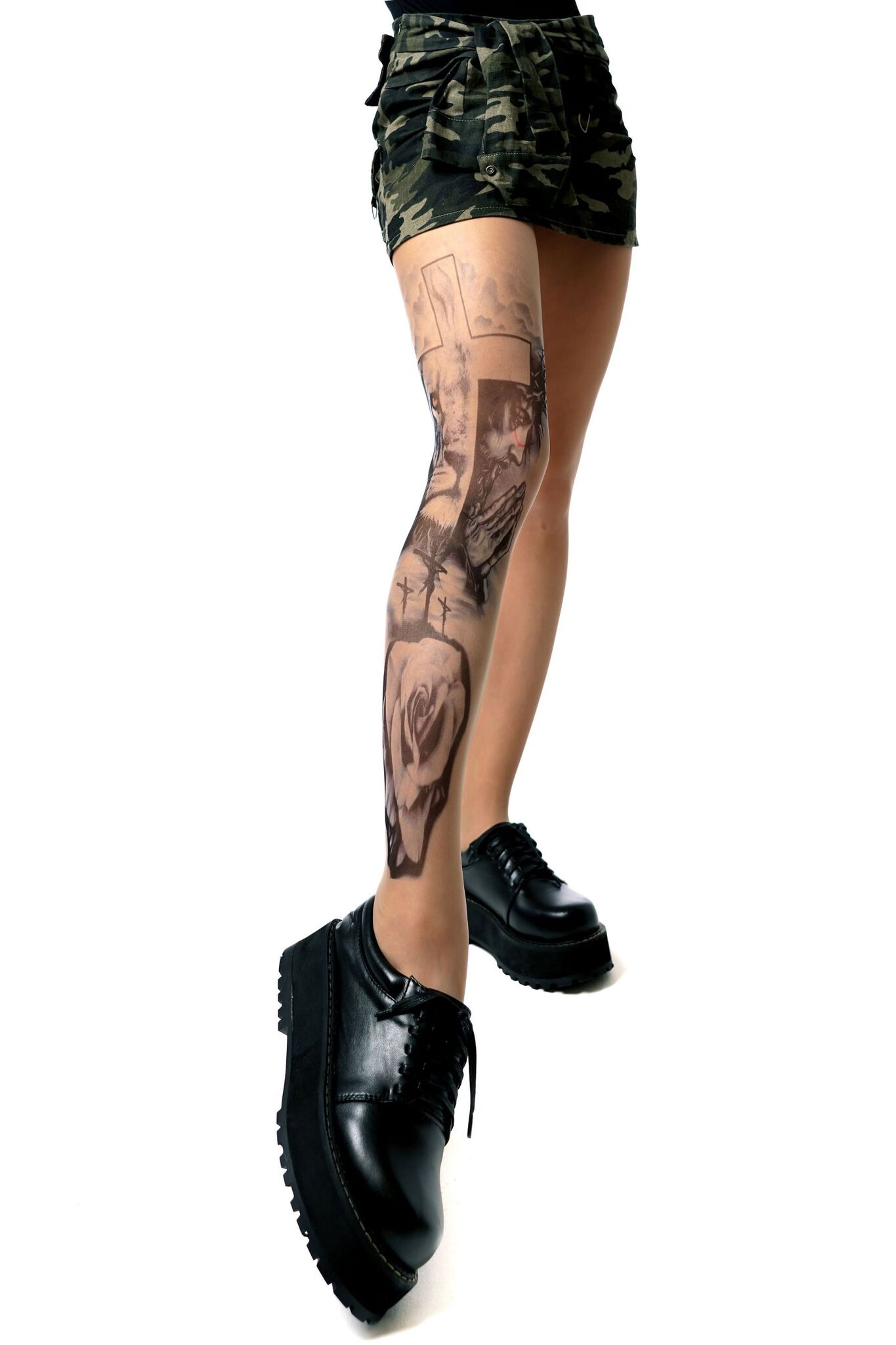 Уникальный принт с религиозной символикой на правой ножке создаёт эффектный акцент, подчёркивая индивидуальность владелицы. Устойчивое нанесение сохраняет чёткость линий даже после многократных стирок.