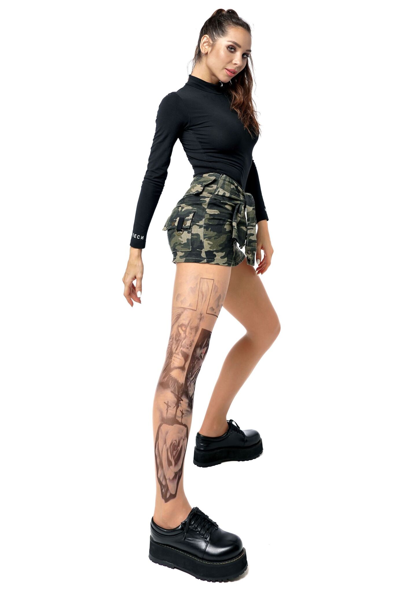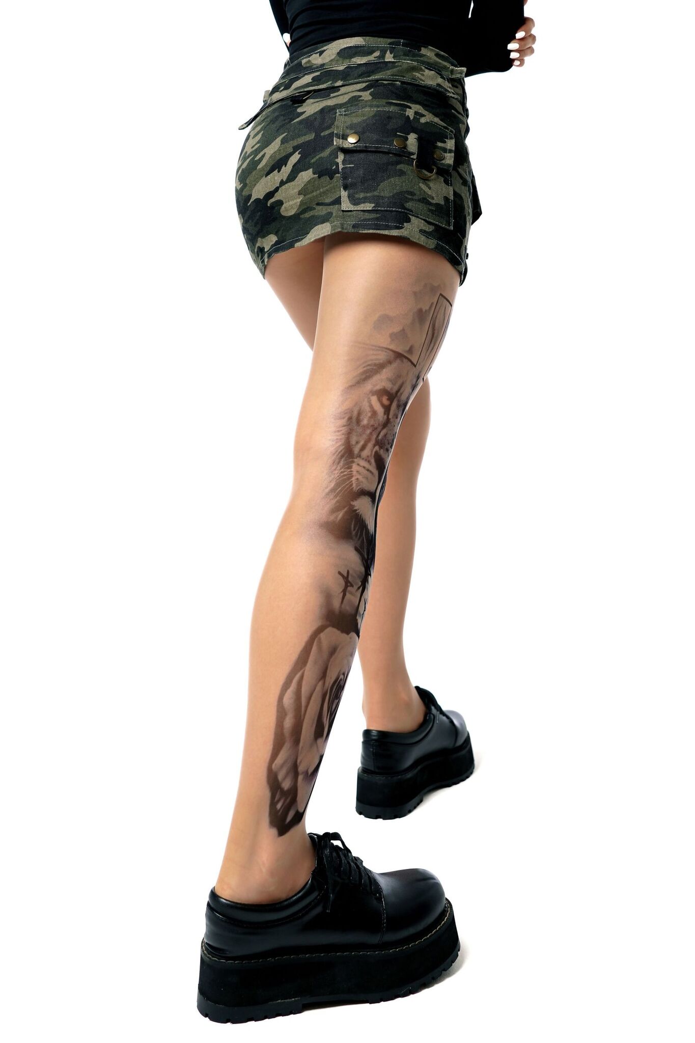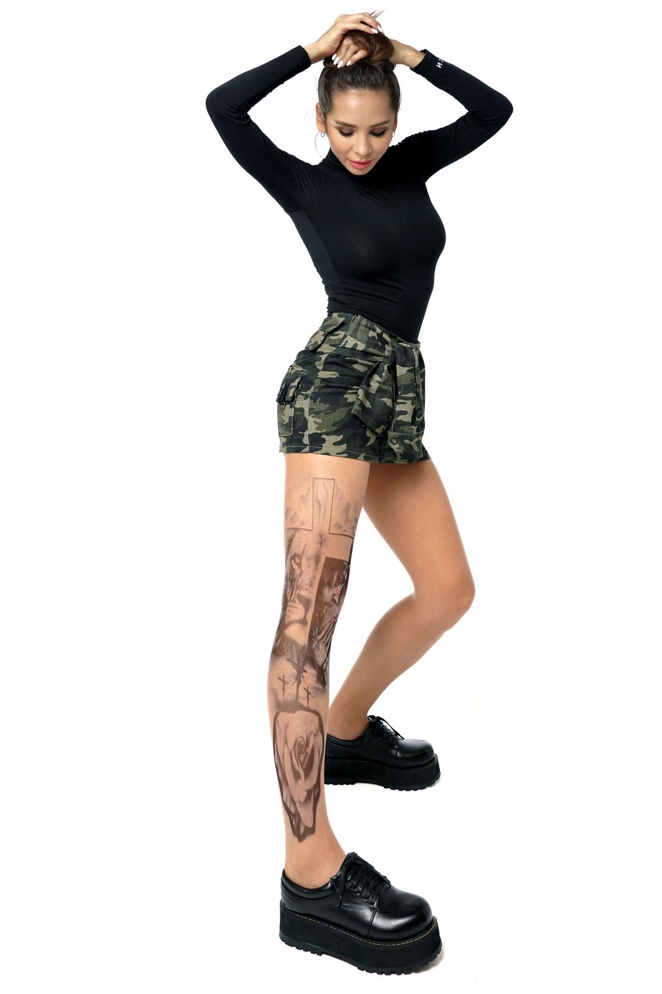 Уникальный принт с религиозной символикой на правой ножке создаёт эффектный акцент, подчёркивая индивидуальность владелицы. Устойчивое нанесение сохраняет чёткость линий даже после многократных стирок.