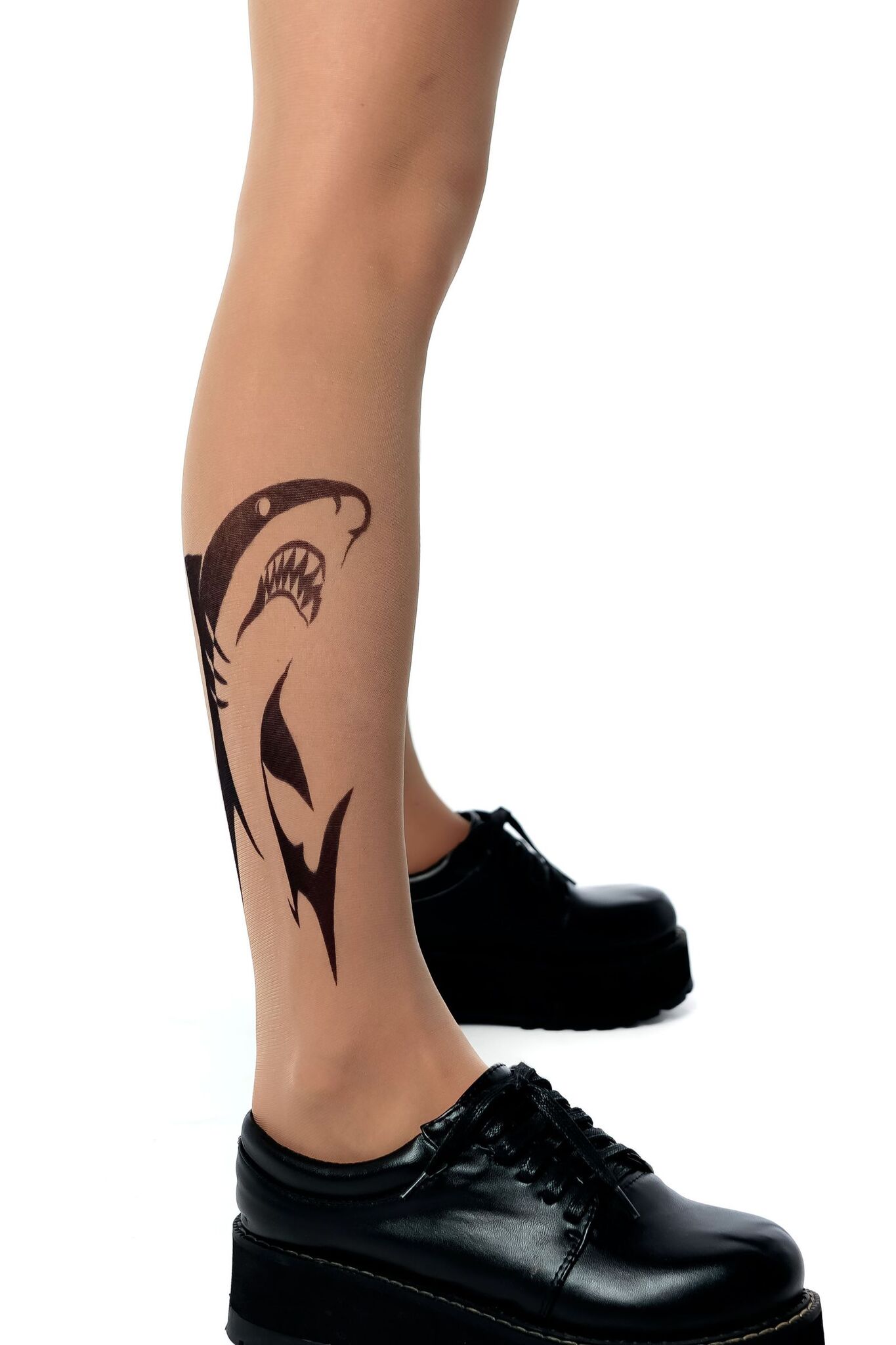 Эти колготки с эффектом татуировки в виде акулы на правой ноге станут вашим секретным оружием в создании запоминающегося образа. Смелый дизайн сочетается с практичностью и комфортом.