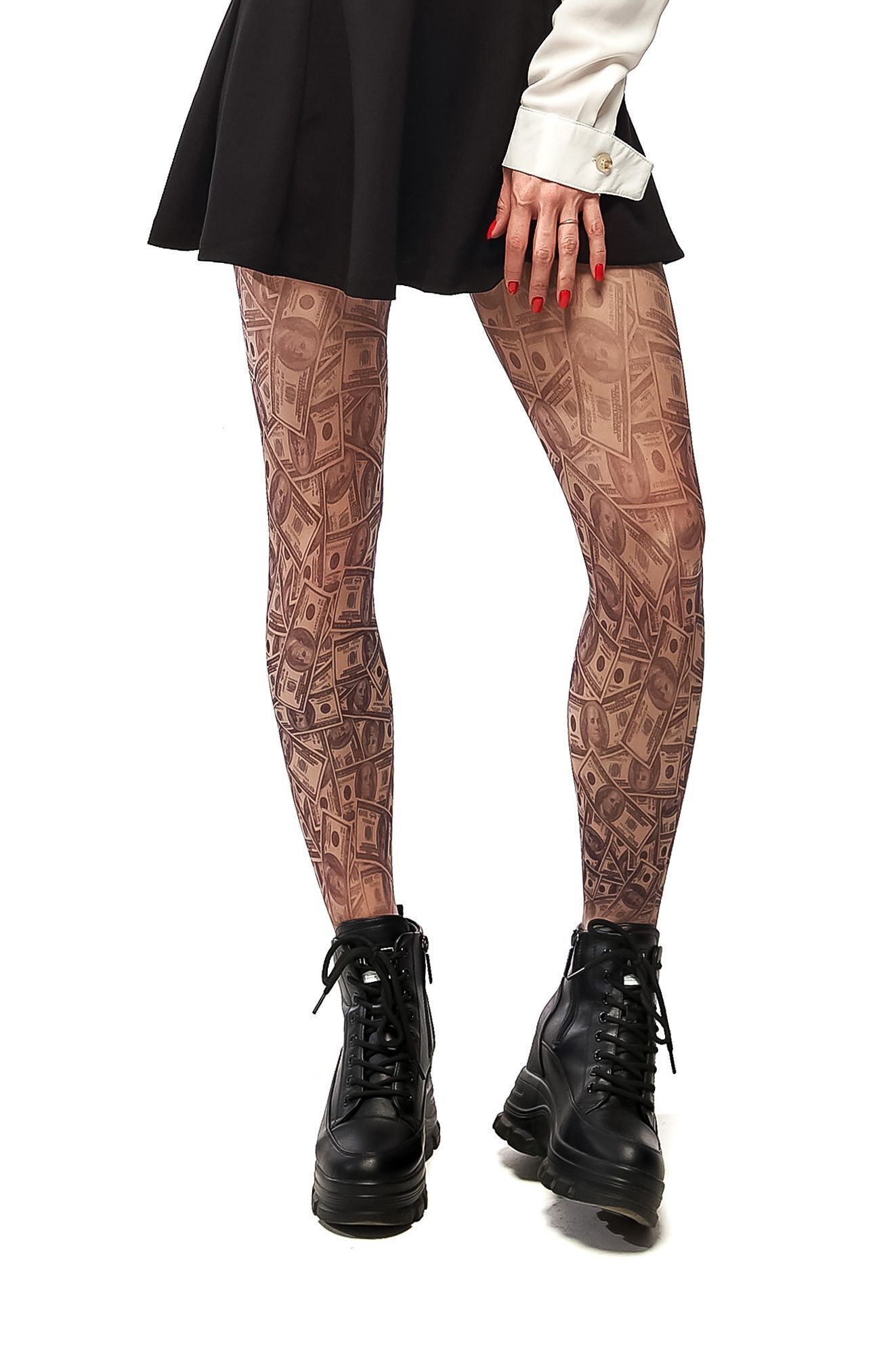 Погрузитесь в мир моды и самовыражения с нашими колготками с принтом в виде денежных купюр. Эти колготки не только привлекают внимание, но и обеспечивают комфорт и надежность в носке. Принт не стирается и не выгорает со временем, что делает их идеальным выбором для повседневного использования.