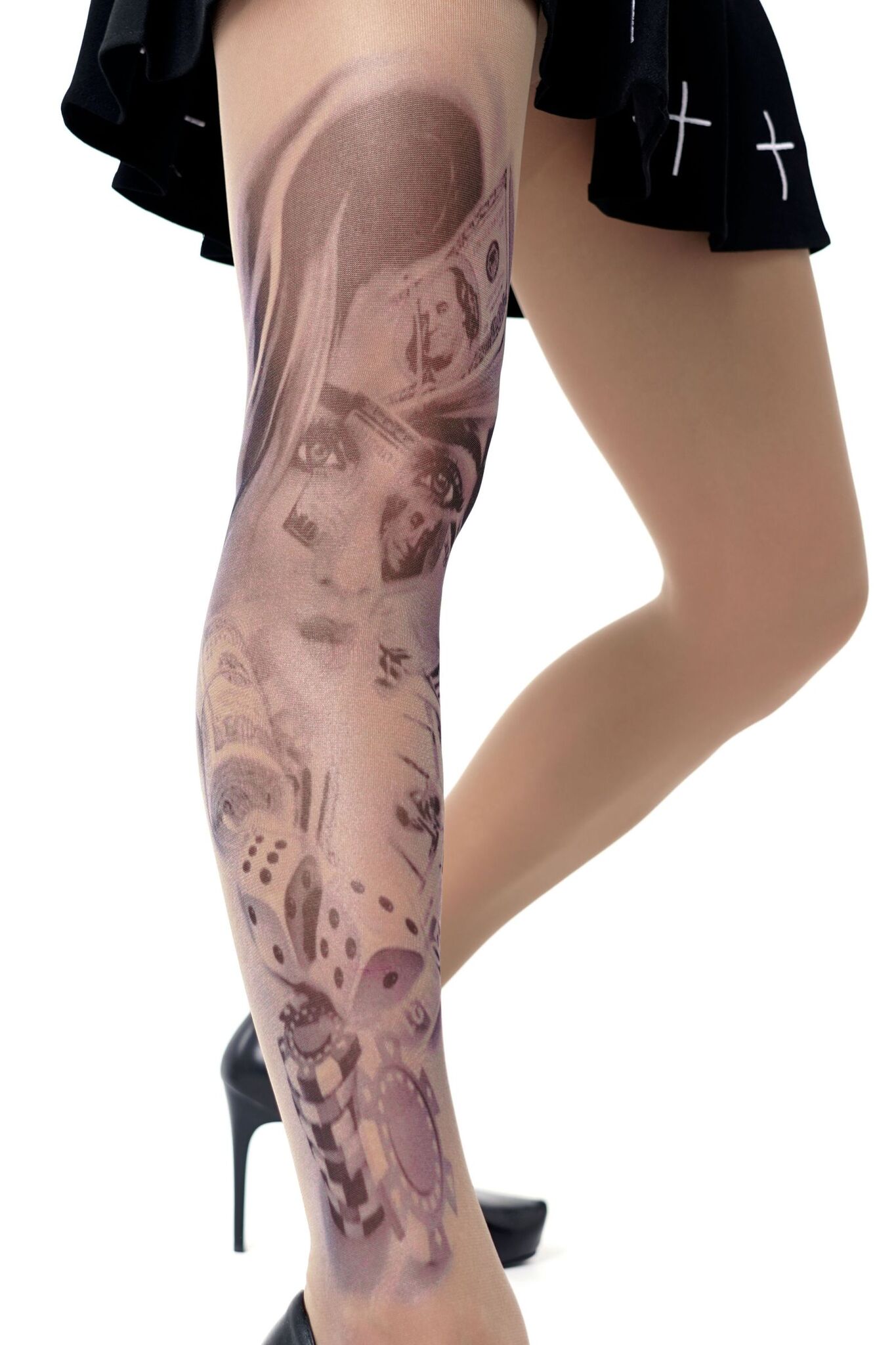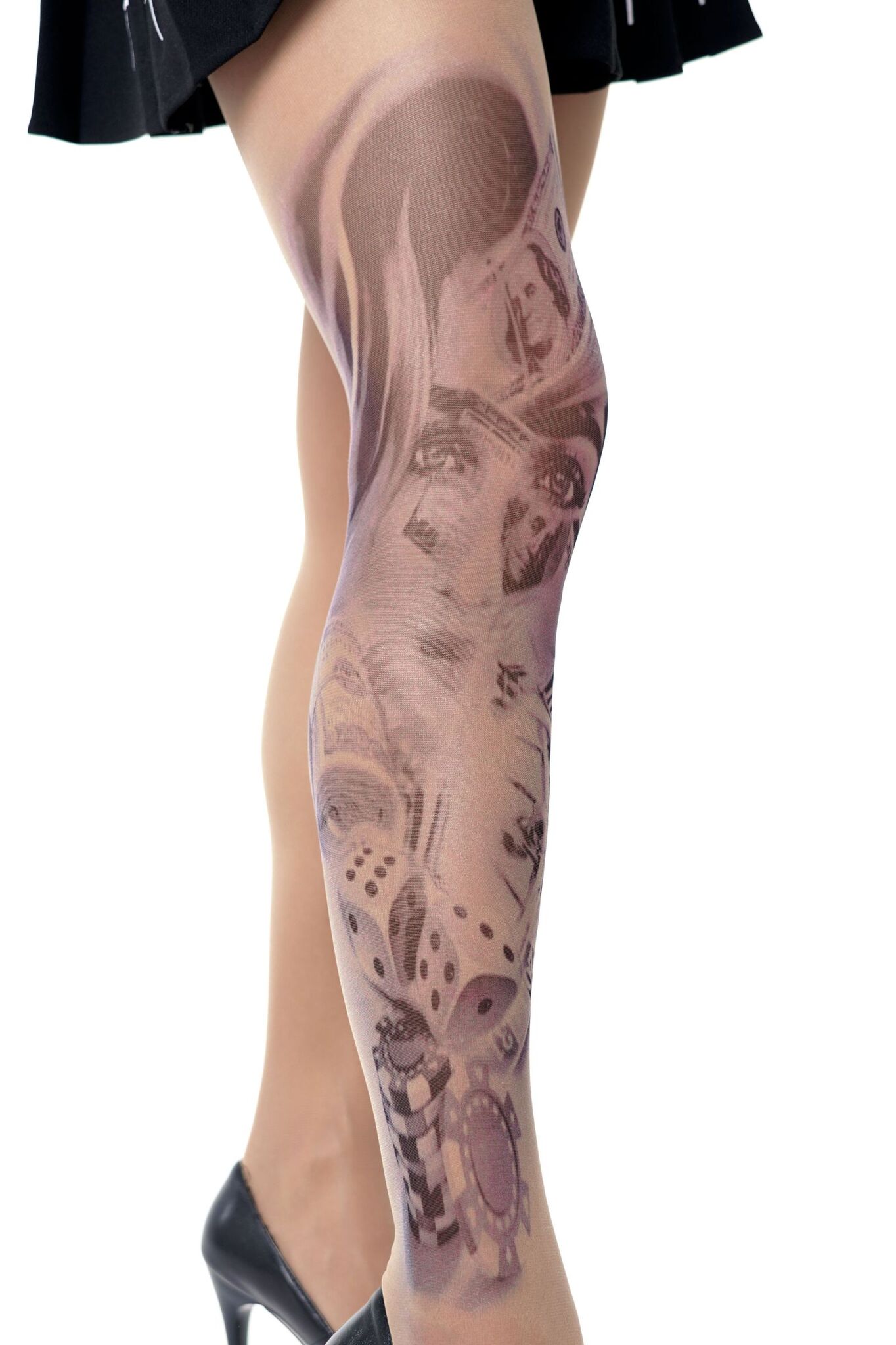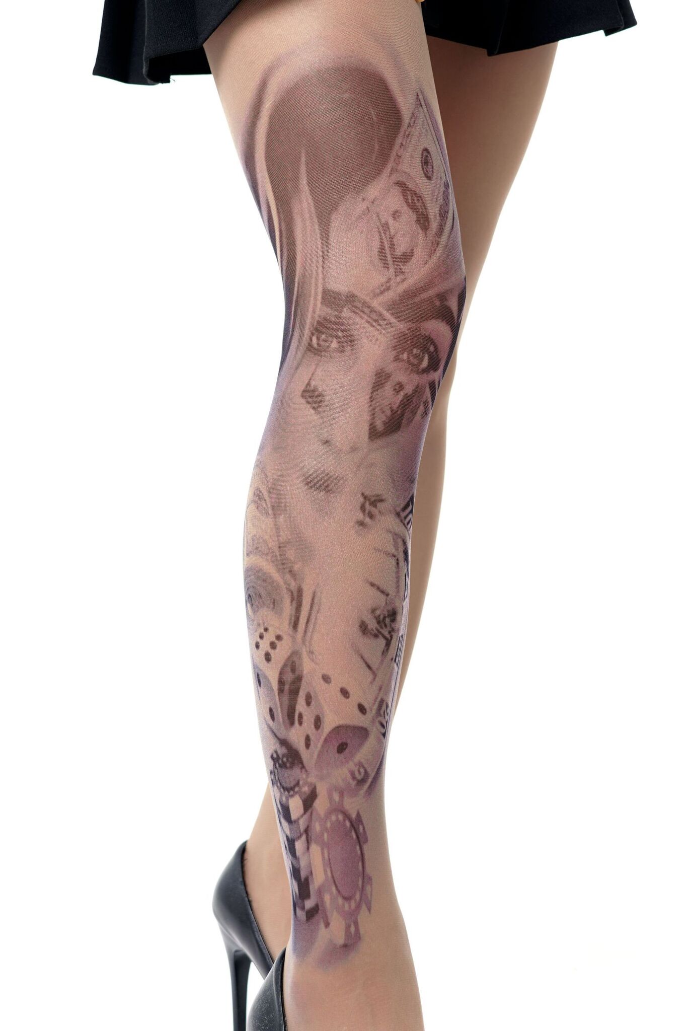 Сделайте ваш образ запоминающимся с колготками, создающими эффект татуировки. Смелый принт с изображением девушки и азартных символов подчеркнет вашу индивидуальность.