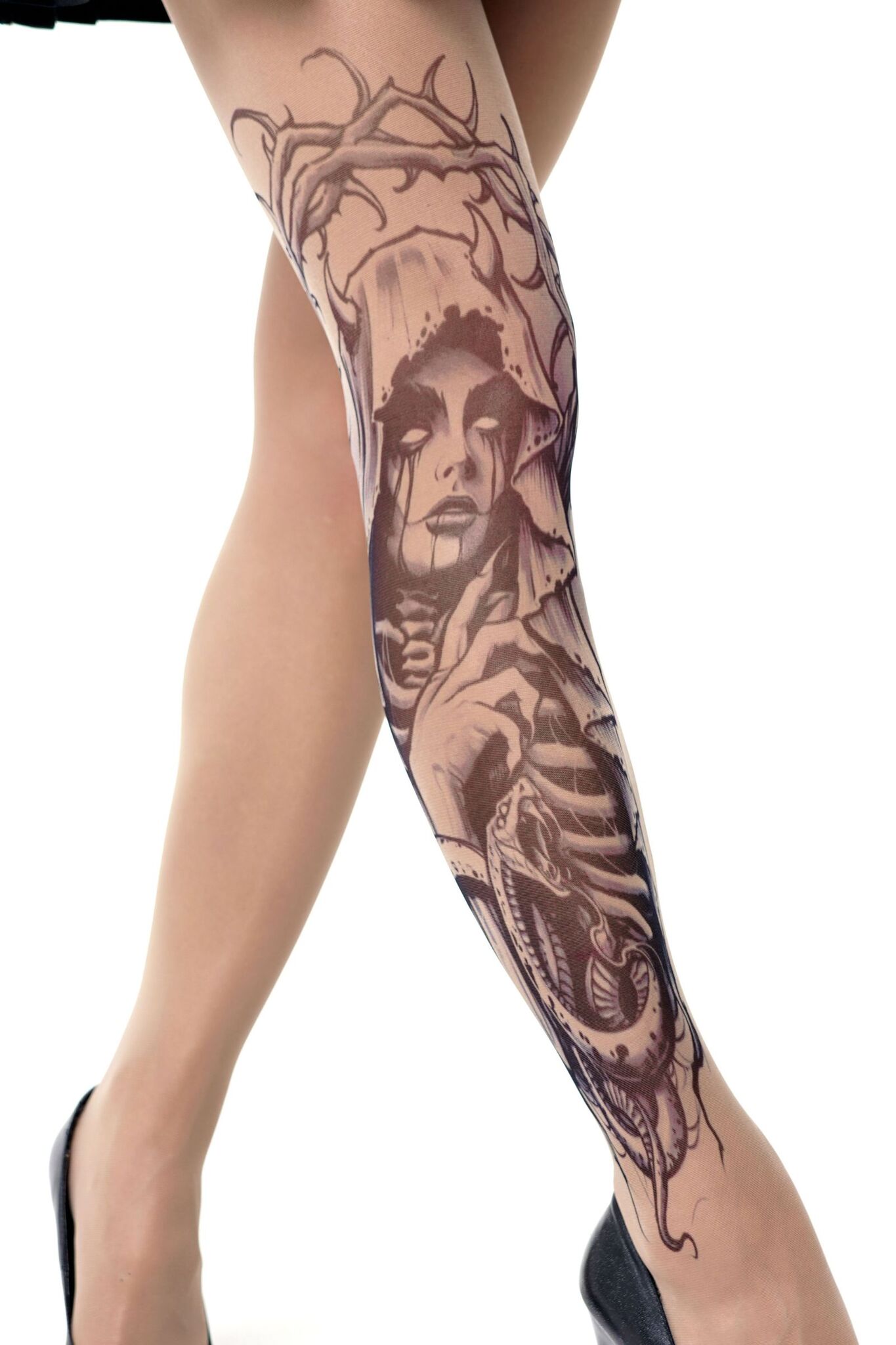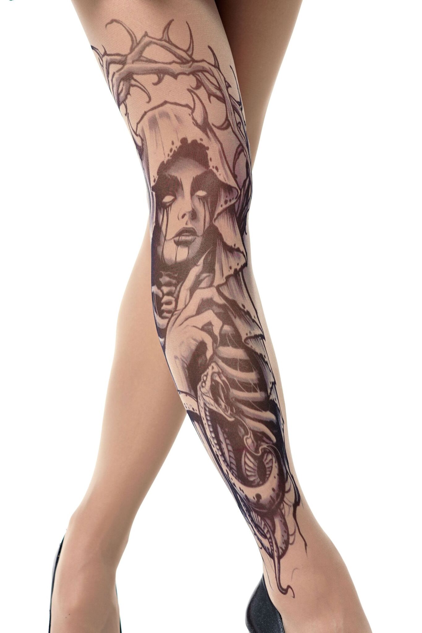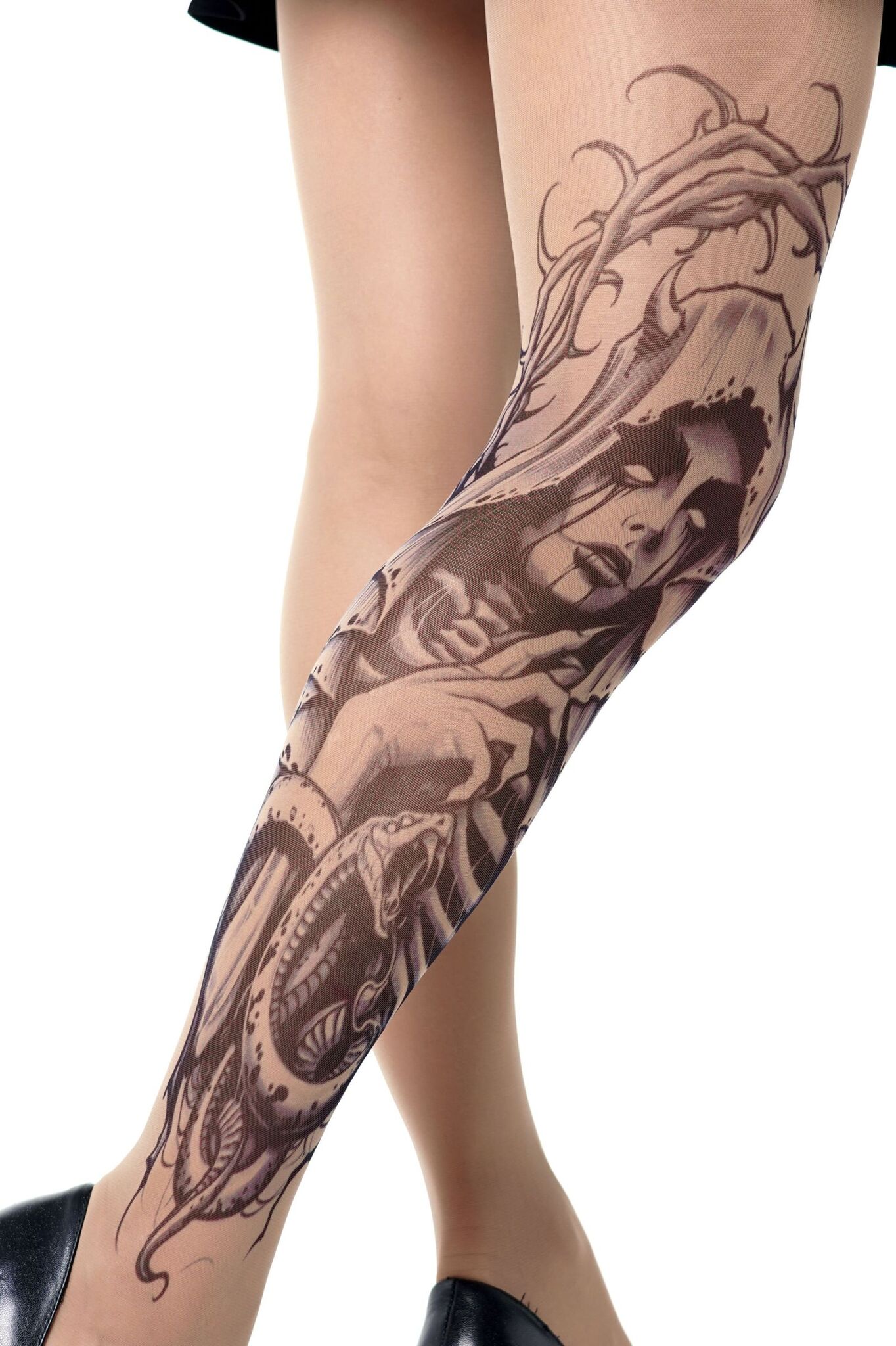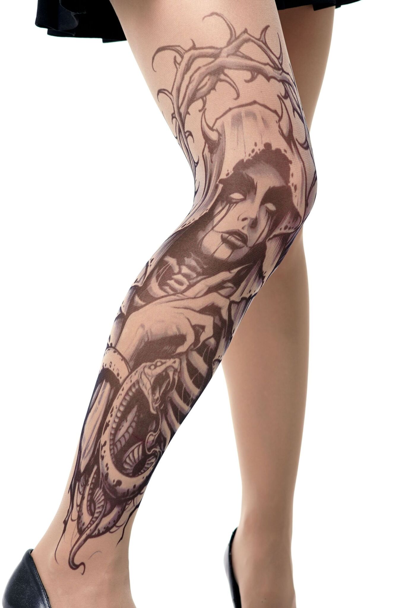 Выразите свою индивидуальность с колготками, создающими эффект татуировки. Принт 'демоница со змеёй' привлекает внимание и подчеркивает вашу уникальность.