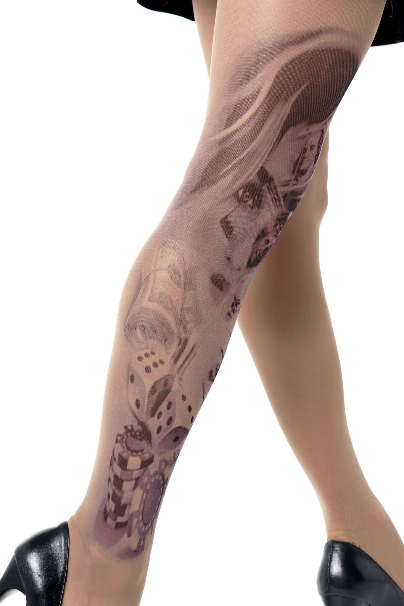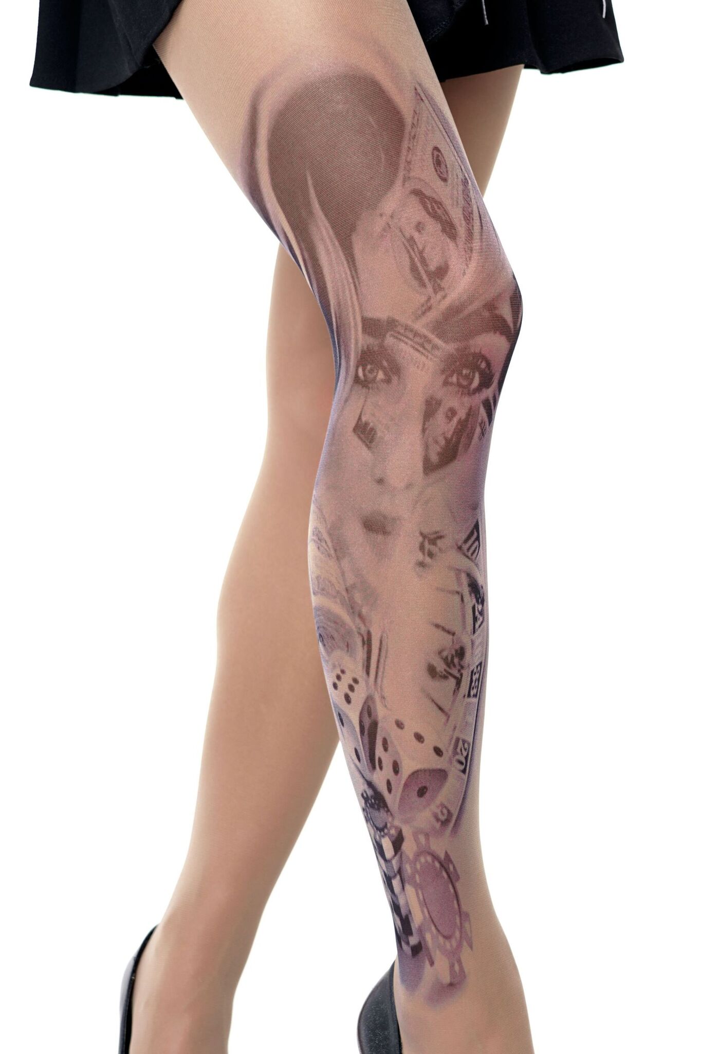 Эти колготки с эффектом татуировки создают дерзкий и запоминающийся образ, который не оставит вас незамеченной. Благодаря стильному принту с элементами казино и портретом девушки вы легко дополните вечерний или коктейльный образ.