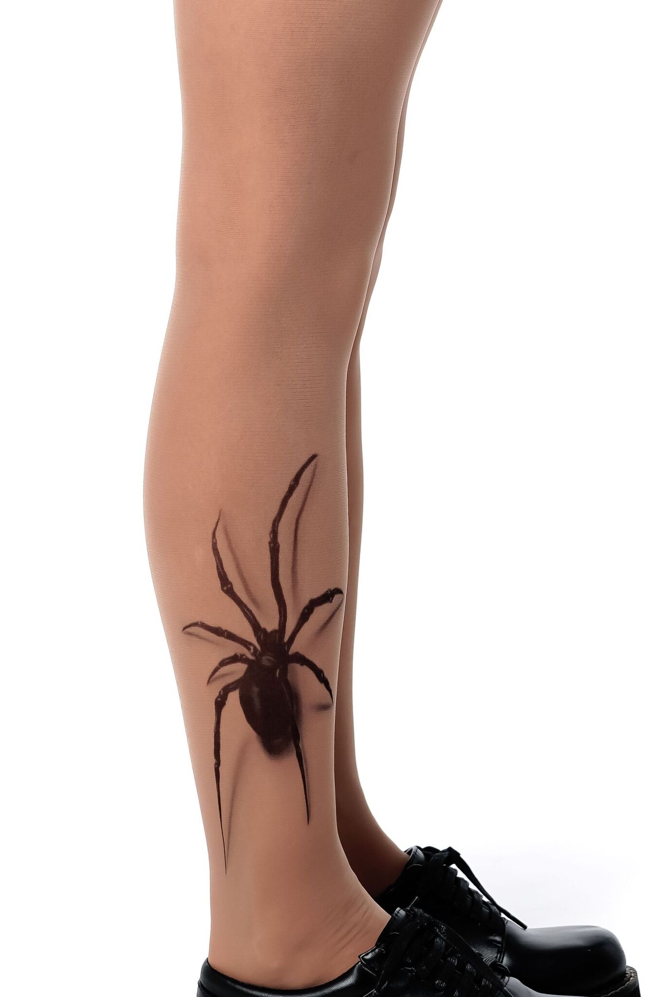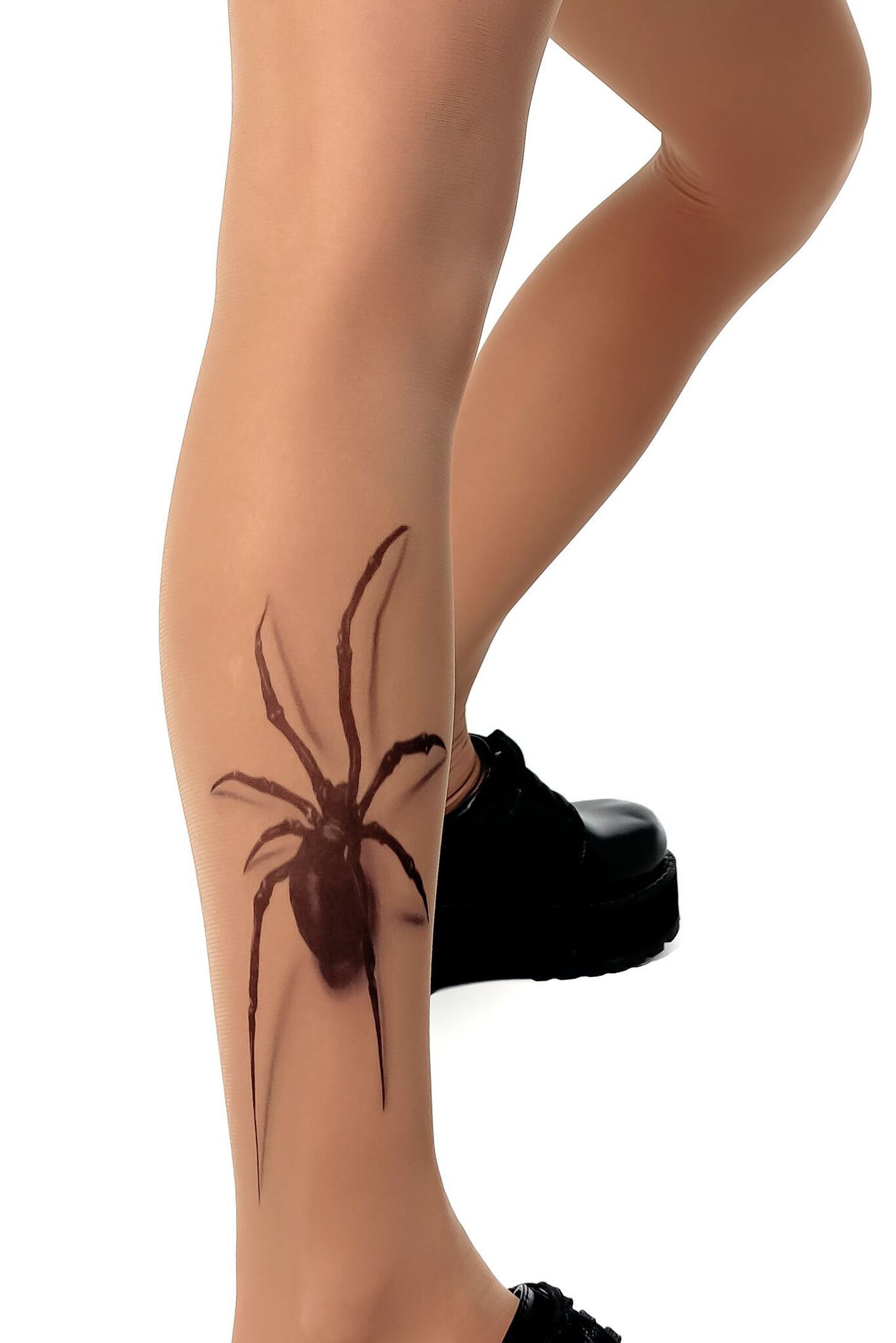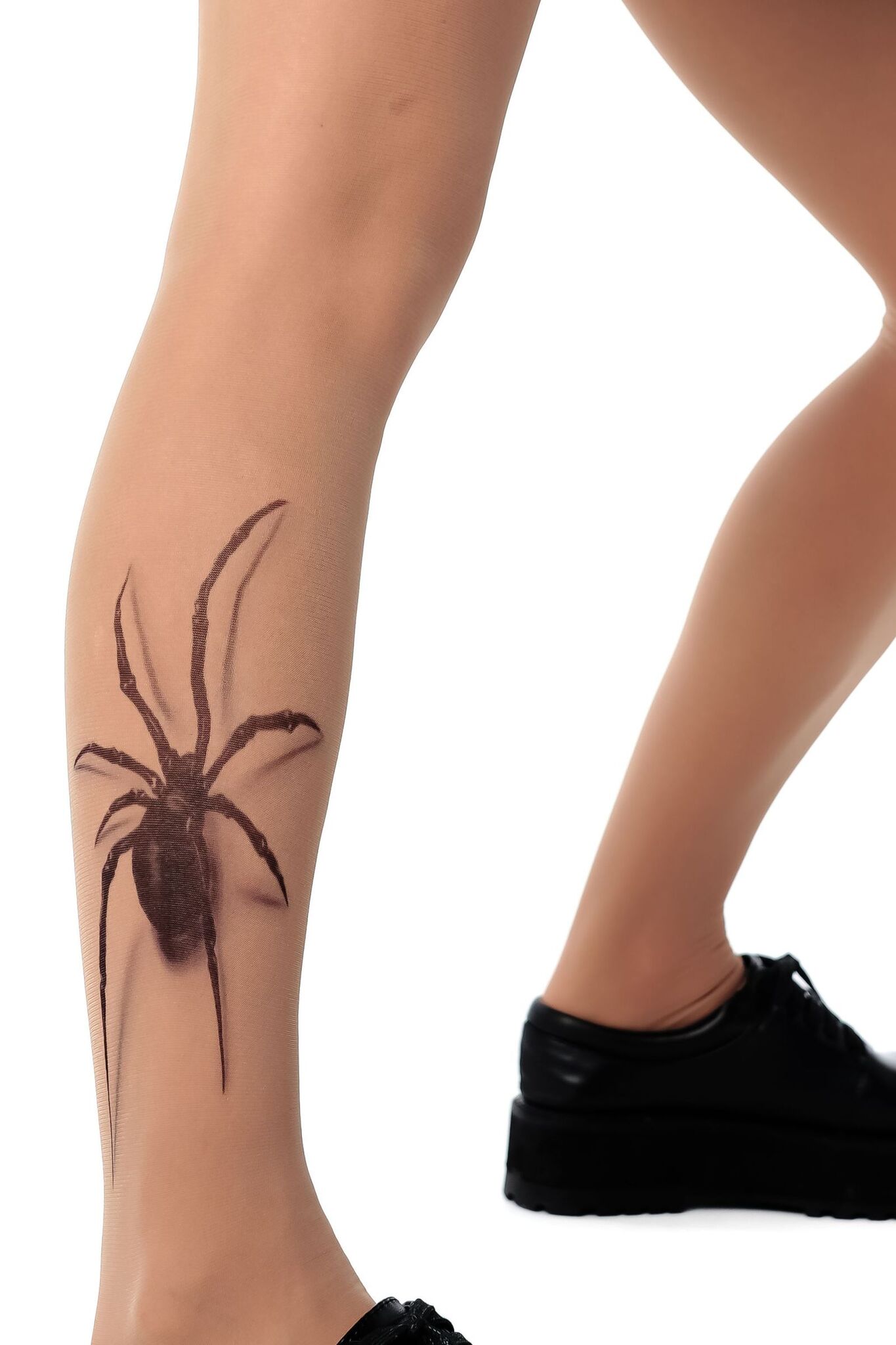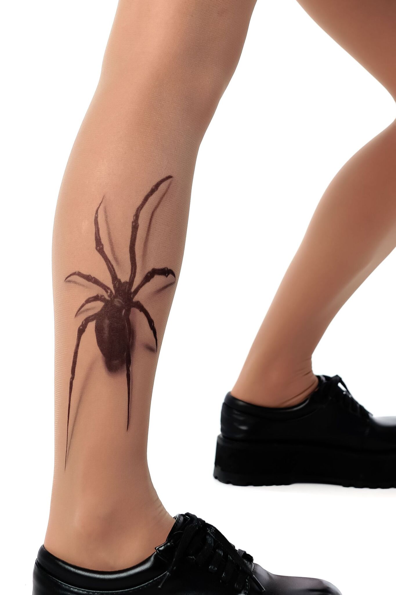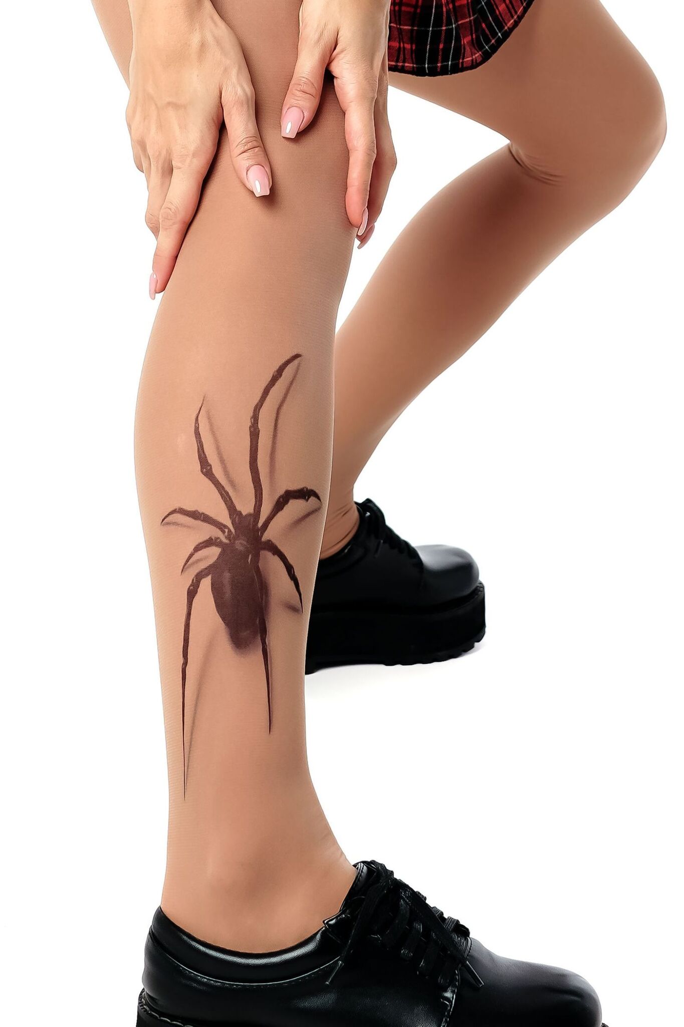 Хотите выделиться из толпы и подчеркнуть свою индивидуальность? Колготки с эффектом татуировки в виде реалистичного паука на правой ноге станут идеальным выбором для создания смелого и запоминающегося образа.