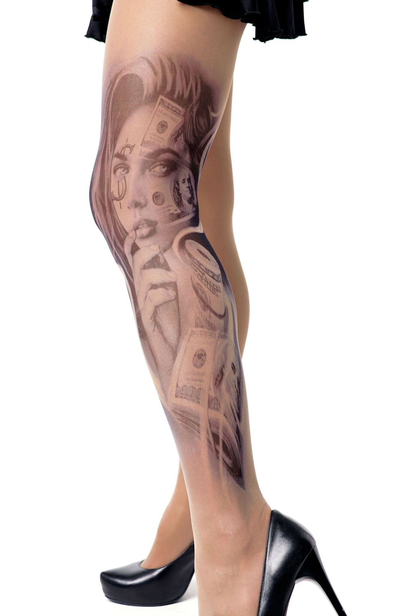 Погрузитесь в мир моды и самовыражения с нашими колготками с эффектом тату. Эти колготки не только подчеркнут вашу индивидуальность, но и добавят изюминку в любой наряд. Принт в виде женского лица в окружении купюр создает уникальный стиль, который привлечет внимание и вызовет восхищение.
