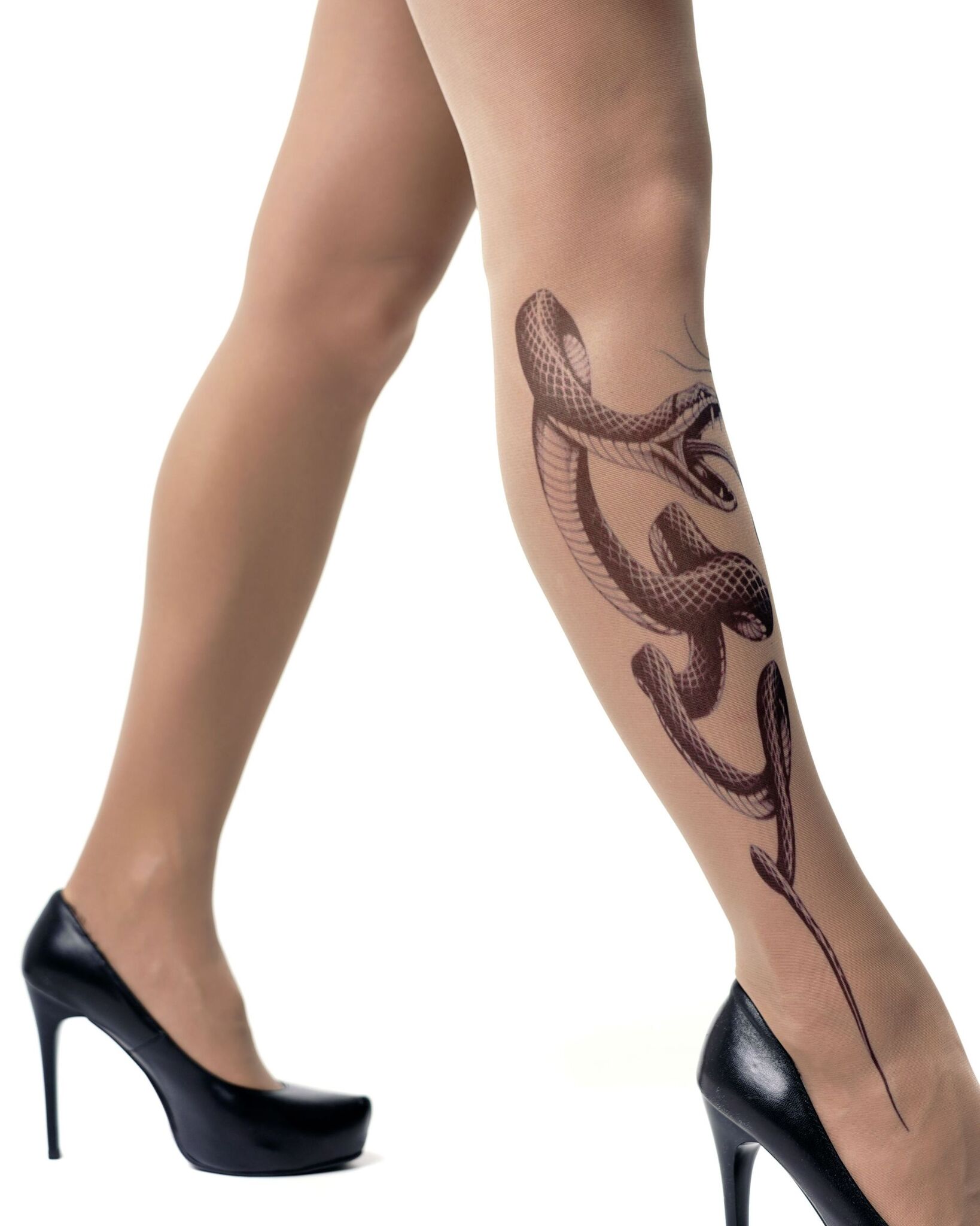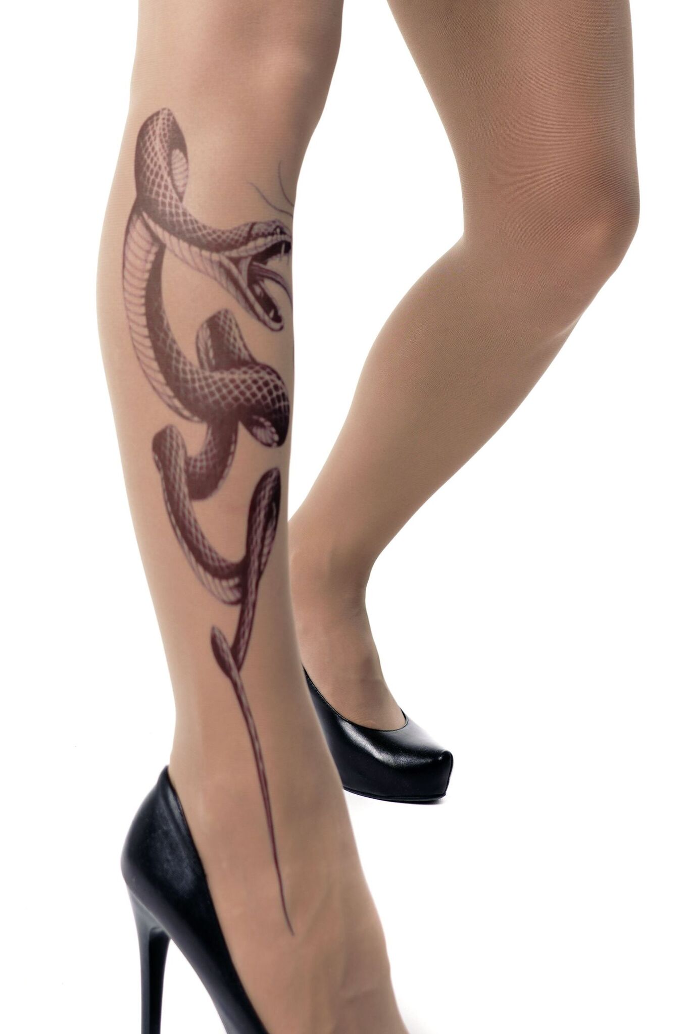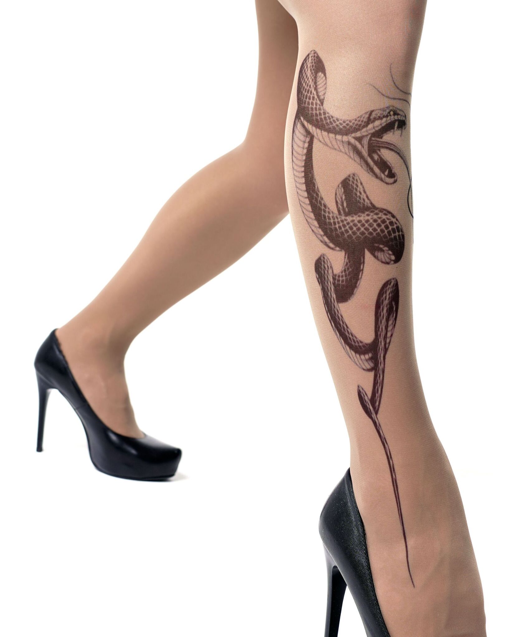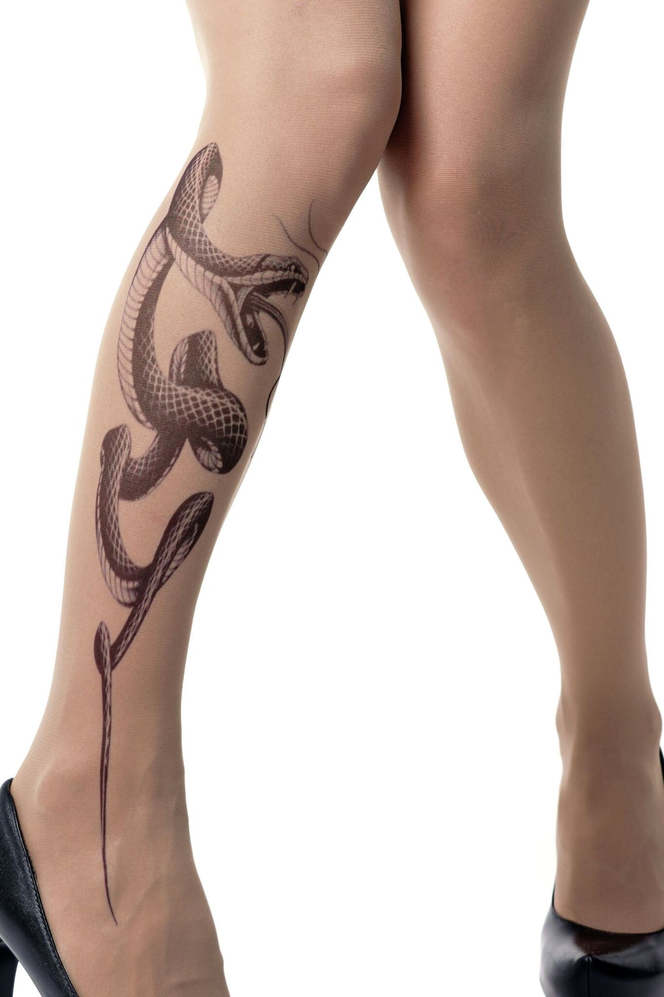 Колготки с эффектом татуировки в виде змеи создают дерзкий и запоминающийся образ. Принт не стирается даже после многократных стирок.