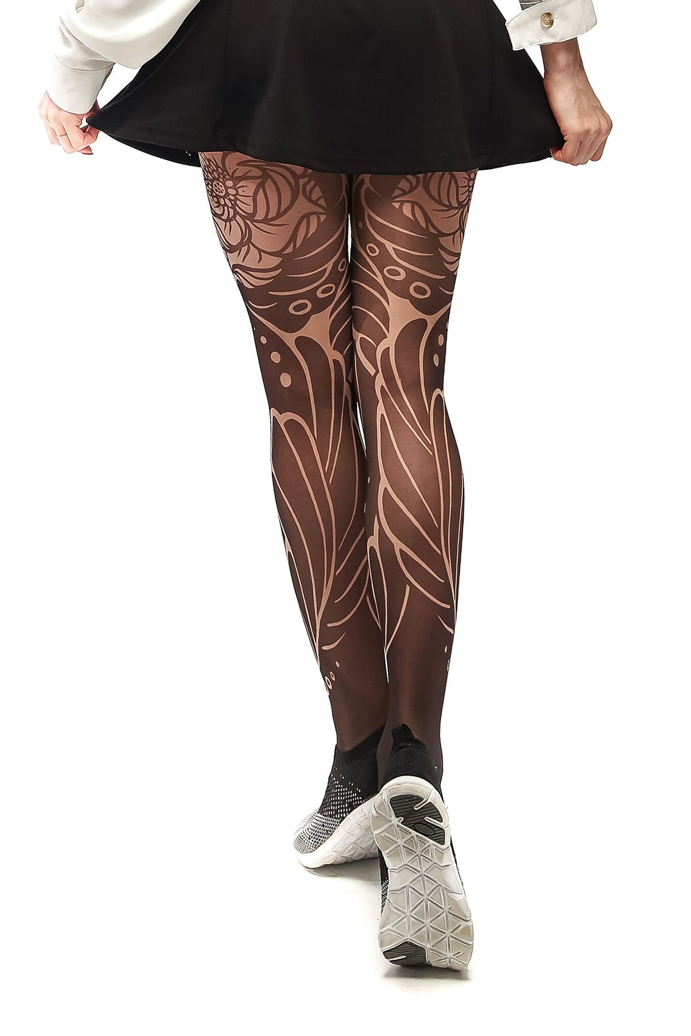 Колготки универсальны и сочетаются как с повседневной, так и с вечерней одеждой. Они особенно эффектно смотрятся с короткими платьями, юбками и туфлями. Спортивные кроссовки также создают модный контраст.