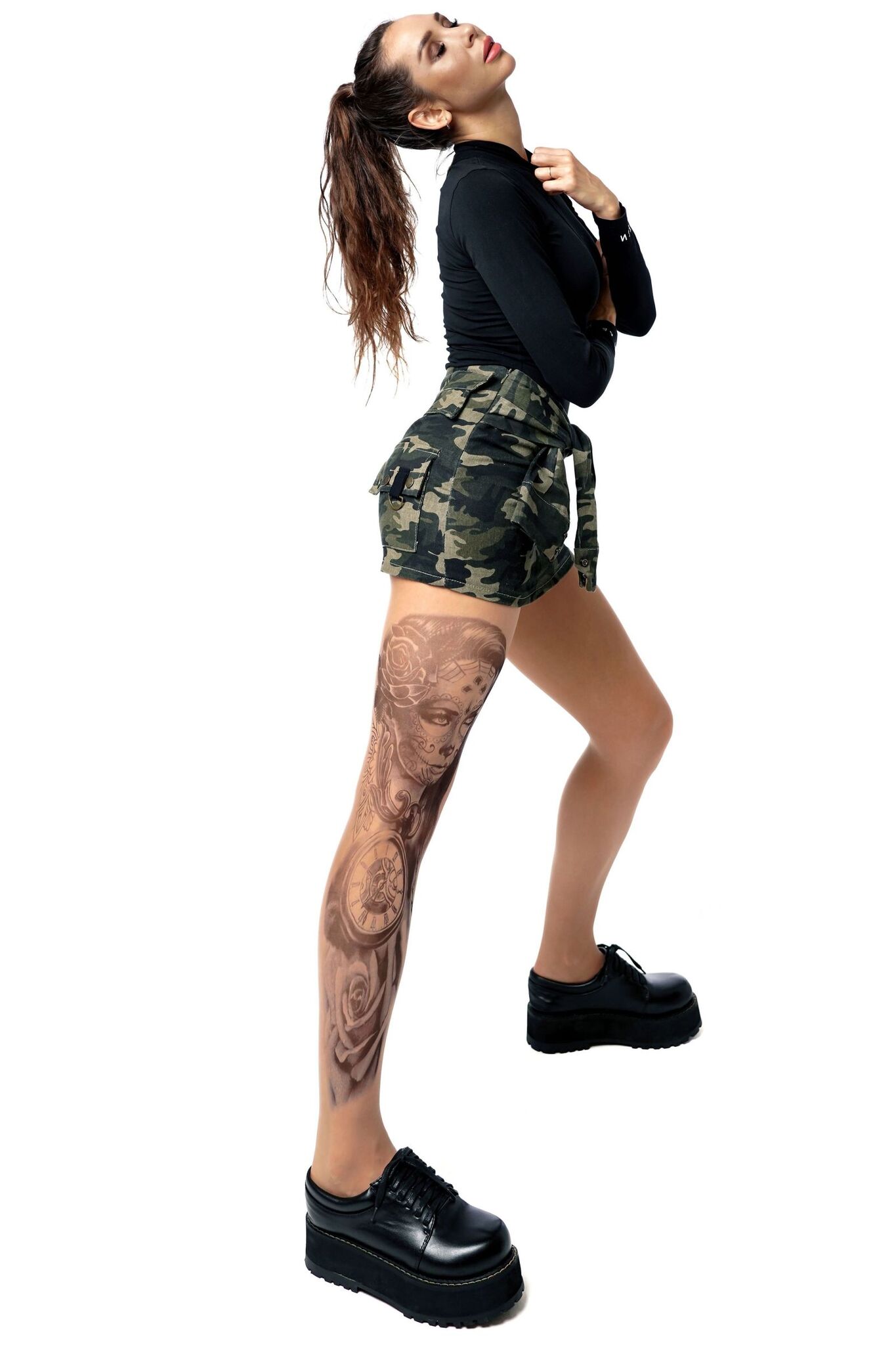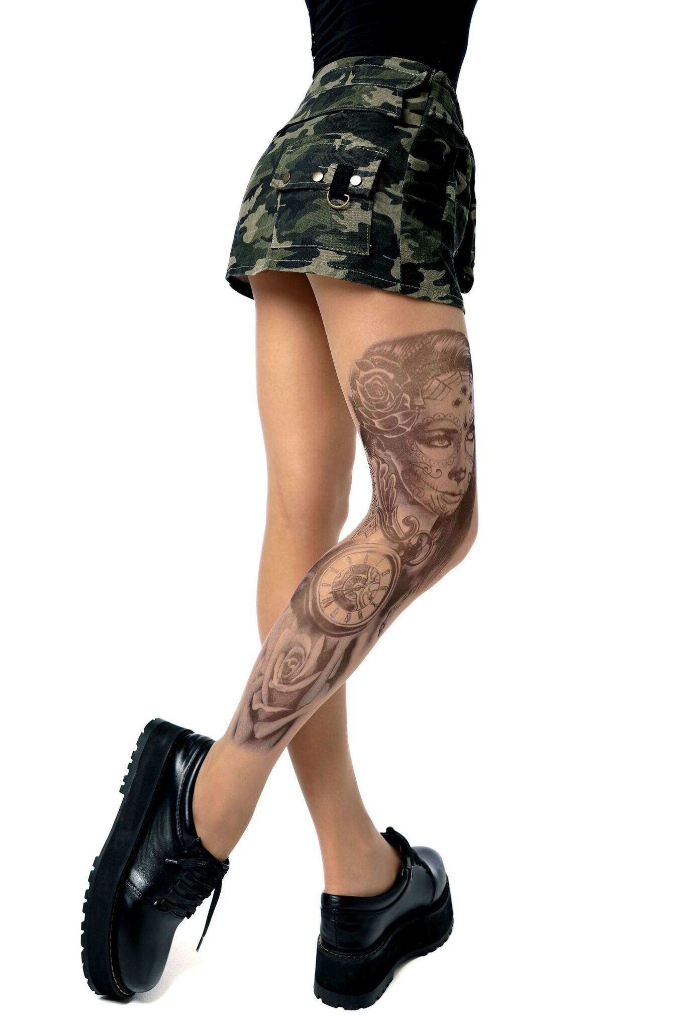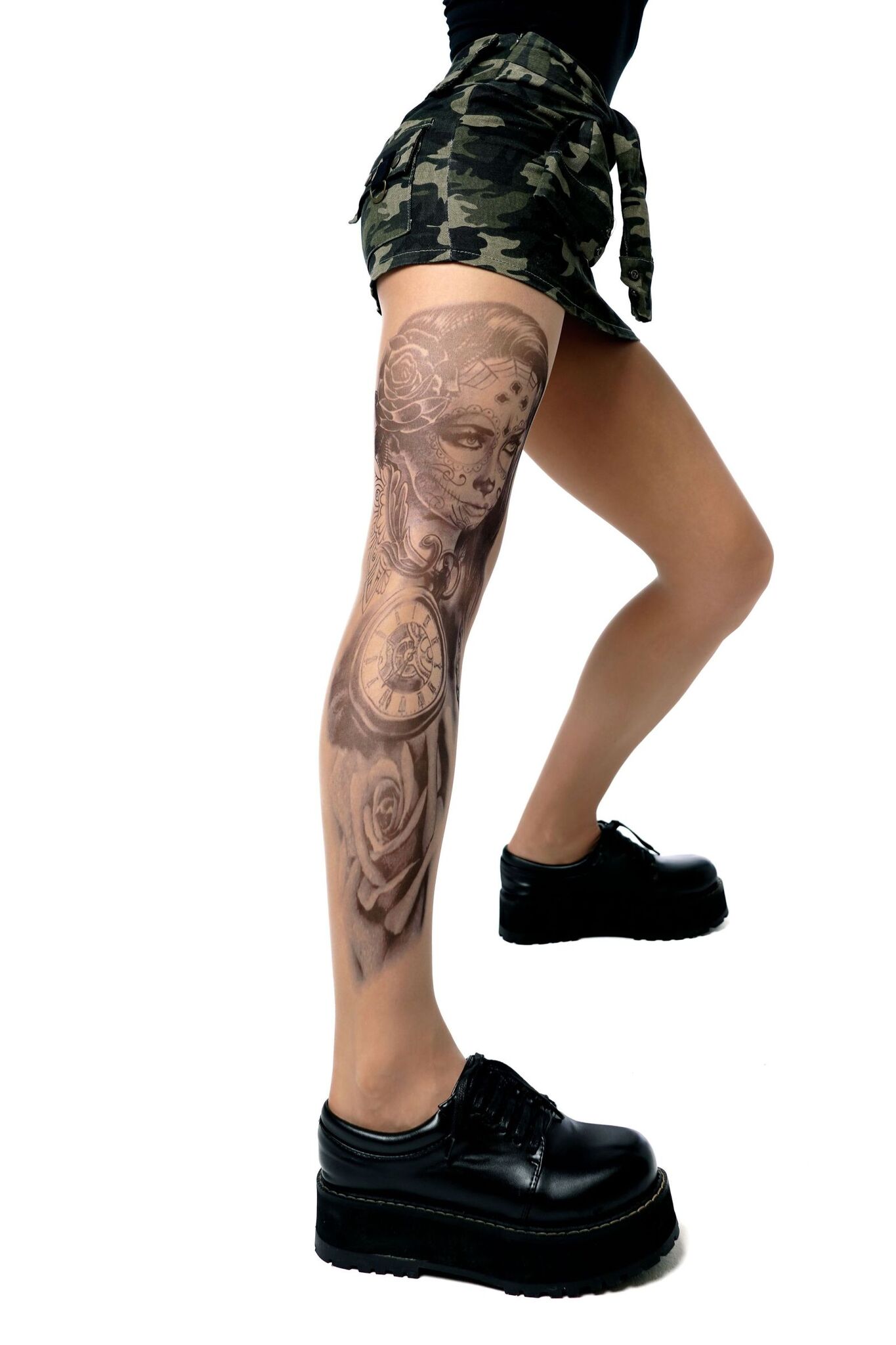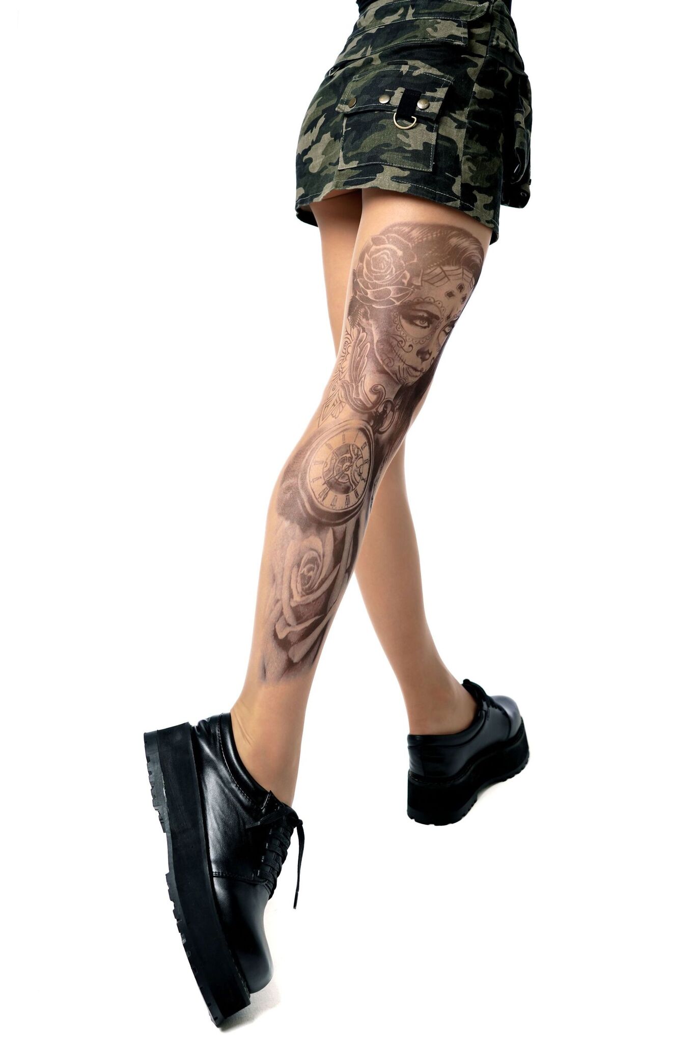 Погрузитесь в мир стиля и самовыражения с колготками с эффектом тату 'Калавера'. Эти колготки не только добавят изюминку в ваш образ, но и обеспечат комфорт на протяжении всего дня. Принт с изображением девушки с макияжем калавера на левой ножке станет ярким акцентом, который привлечет внимание и подчеркнет вашу индивидуальность.