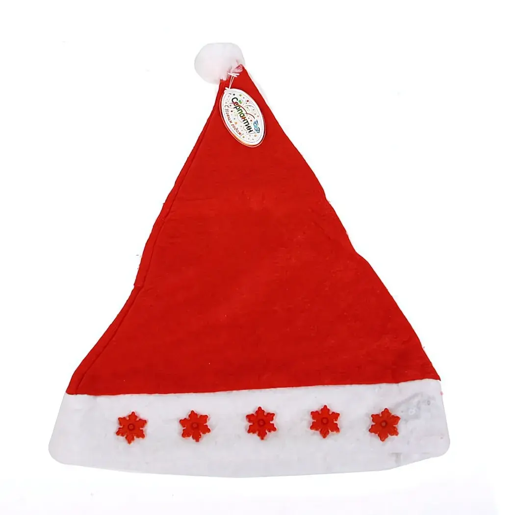 Размер колпака составляет 28*39 см, что делает его универсальным для ношения. Красный цвет с белым отворотом и пушистым помпоном создают классический новогодний образ. Этот колпак станет не только стильным аксессуаром, но и отличным способом поднять настроение в зимние праздники.