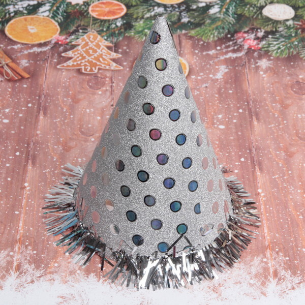 Размер колпака составляет 20 см в высоту, что делает его стандартным для праздничных аксессуаров. Серебристый цвет с голографическими точками и объемной отделкой из синтетической нити придаст вашему образу особый шарм. Не упустите возможность сделать ваш праздник ярче и веселее с колпаком «Блеск»!