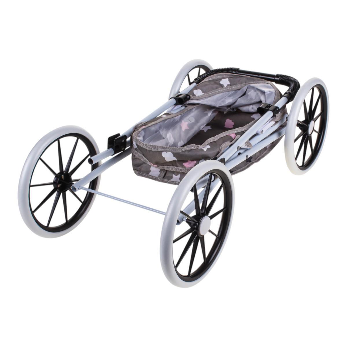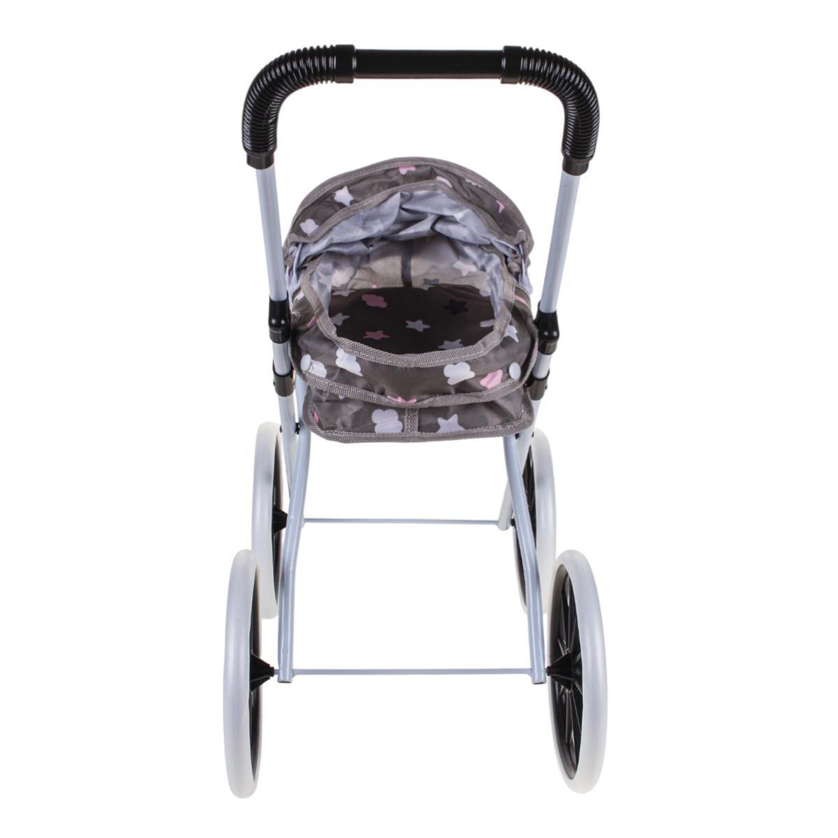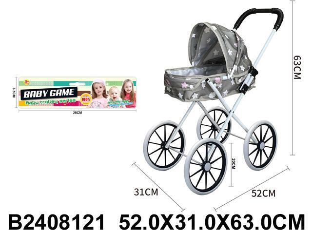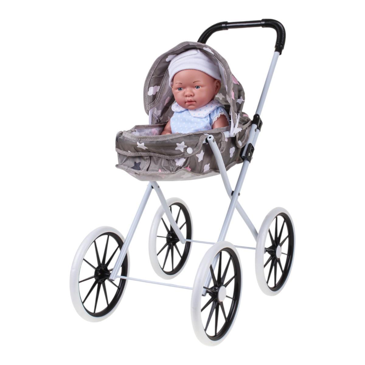 Коляска подходит для игр с куклами и мягкими игрушками среднего размера. Высота конструкции — 63 см, что удобно для детей дошкольного возраста. Большие колёса диаметром около 20 см обеспечивают хорошую устойчивость, а мягкая тканевая люлька с капюшоном позволит "укрыть" игрушку во время прогулки. Отгружается один товар, цвет определяется случайным образом.