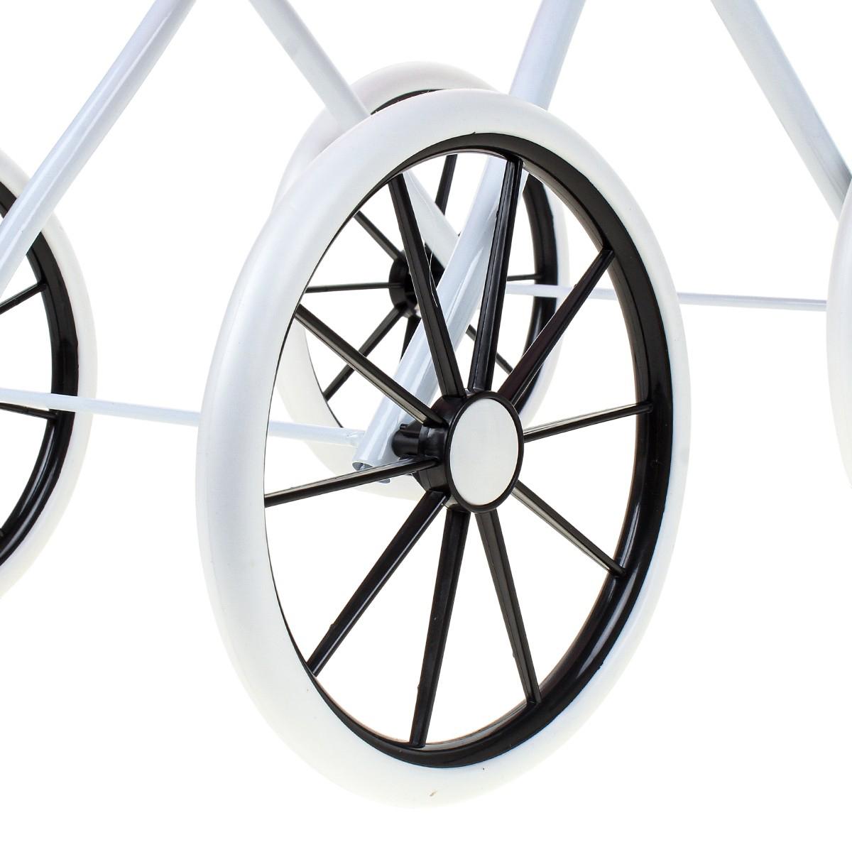 Конструкция включает пластиковые крупные колеса диаметром около 31 см, устойчивую металлическую раму серебристого цвета, яркую тканевую корзину с декоративным рисунком, ручку с накладкой, предотвращающей скольжение. Размеры в разложенном виде — 63 x 52 x 31 см, что делает её подходящей для кукл до 40 см. Она отлично сочетает функциональность и привлекательный дизайн, где каждая деталь способствует комфортной игре и развитию моторики.