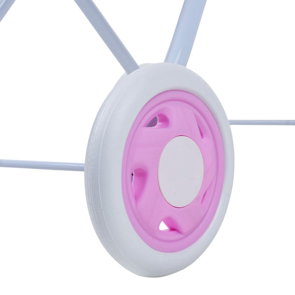 - Розовые колеса диаметром около 10-12 см обеспечивают плавный ход, не шумят и не царапают поверхности.