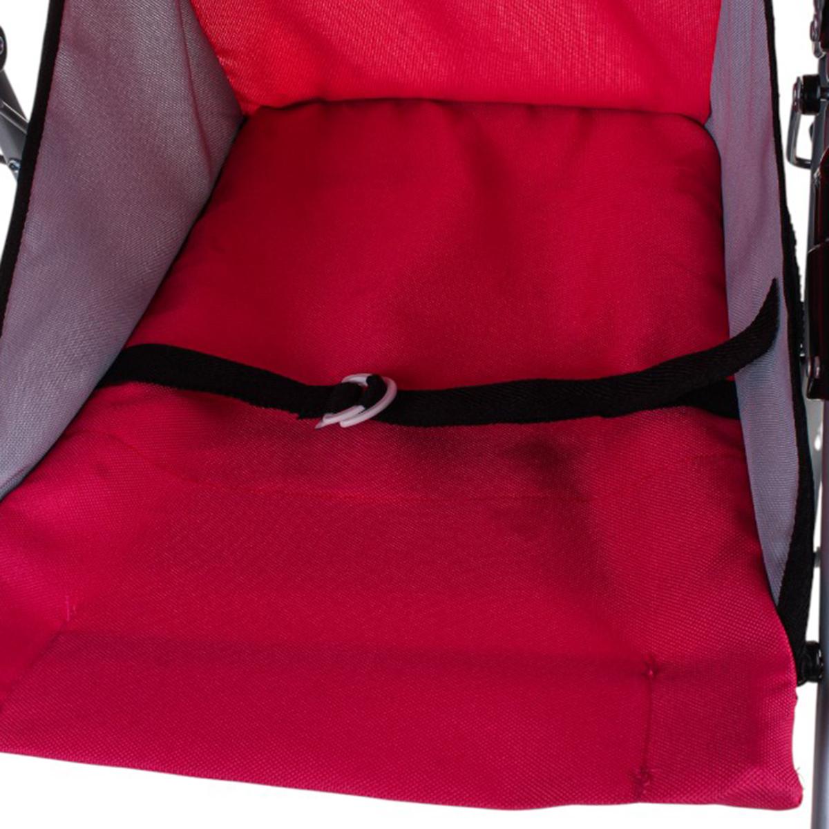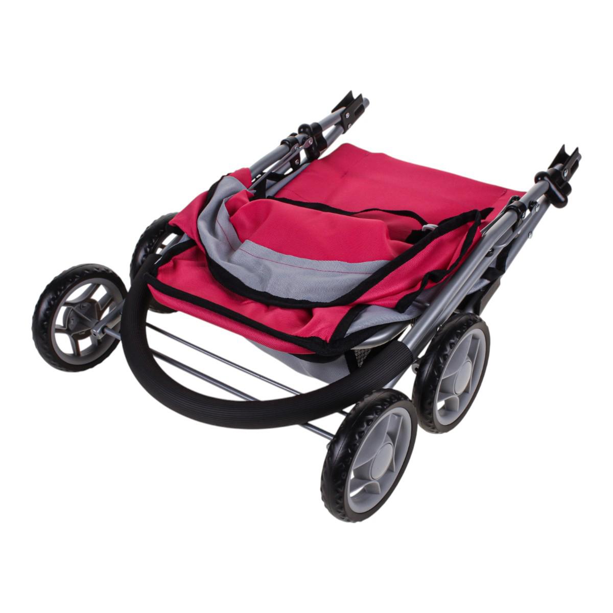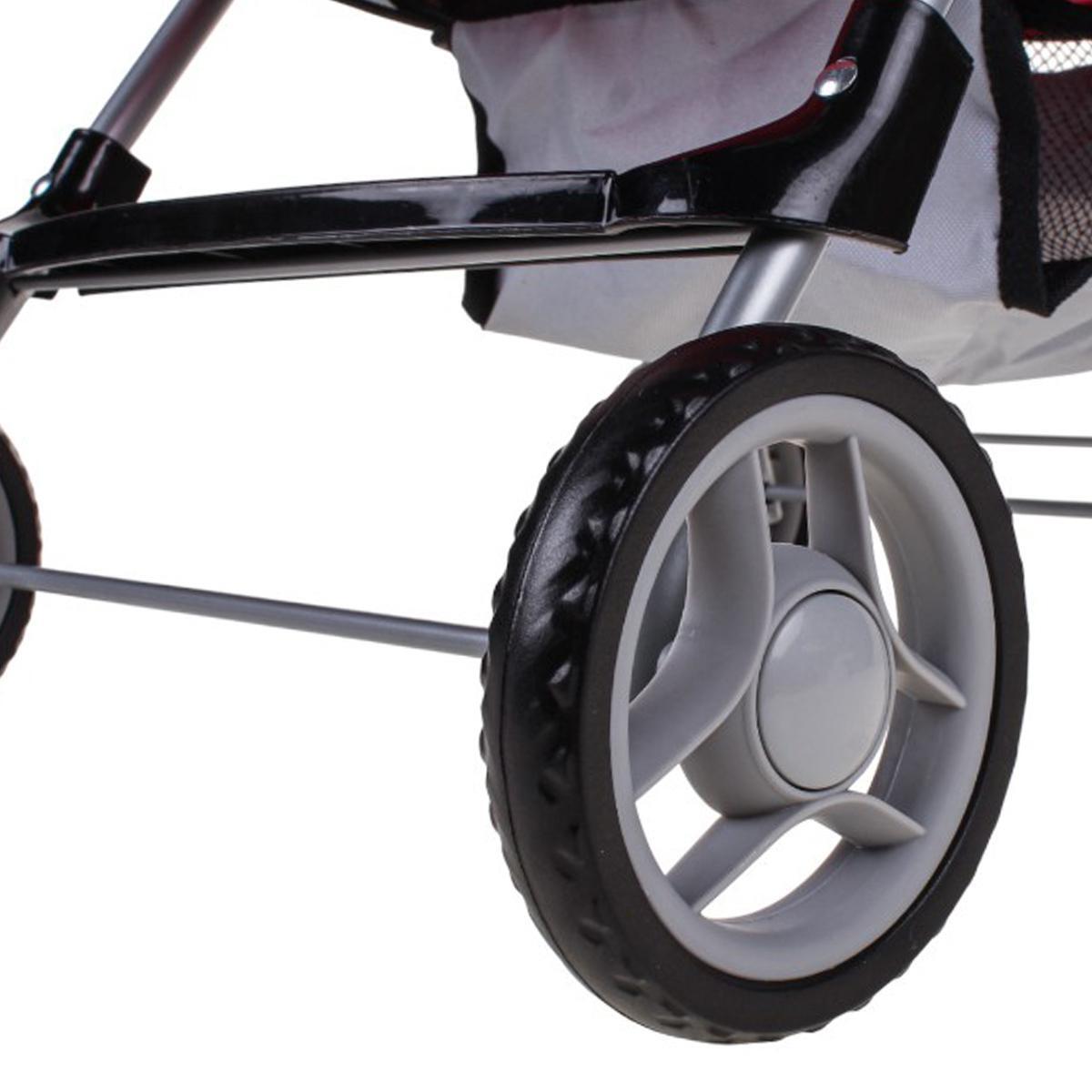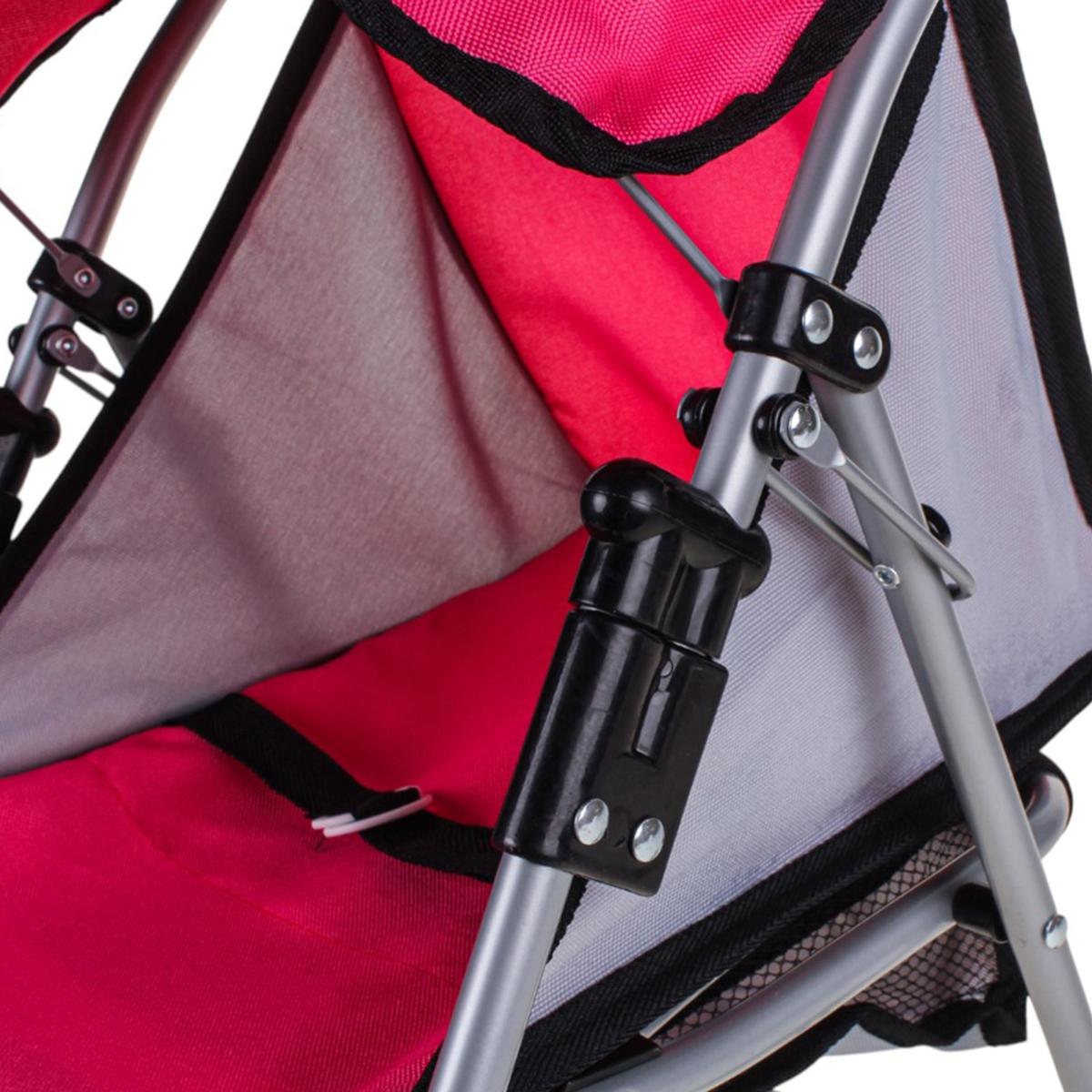 Размеры коляски – 57 см в высоту, 42 см в длину и 36 см в ширину. Диаметр колеса 11 см. Материалы – металл для каркаса, пластик для соединений и устойчивых колес, текстиль для сиденья и капюшона. Легкая конструкция позволяет ребенку самостоятельно катать коляску без помощи взрослых, а мягкая ручка делает захват удобным.