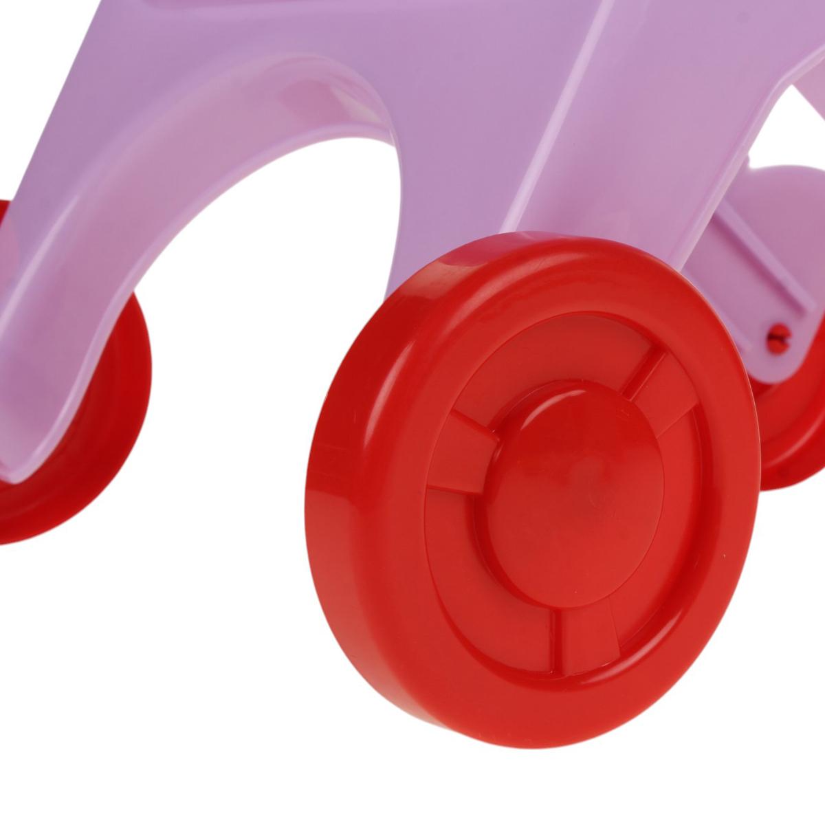Конструкция включает прочный каркас, удобную ручку для передвижения и устойчивые колеса диаметром 9 см, обеспечивающие мягкое катание по любой поверхности. Использованный материал — безопасный пластик, не содержит вредных веществ, полностью соответствующий нормам для игрушек для детей 3+.