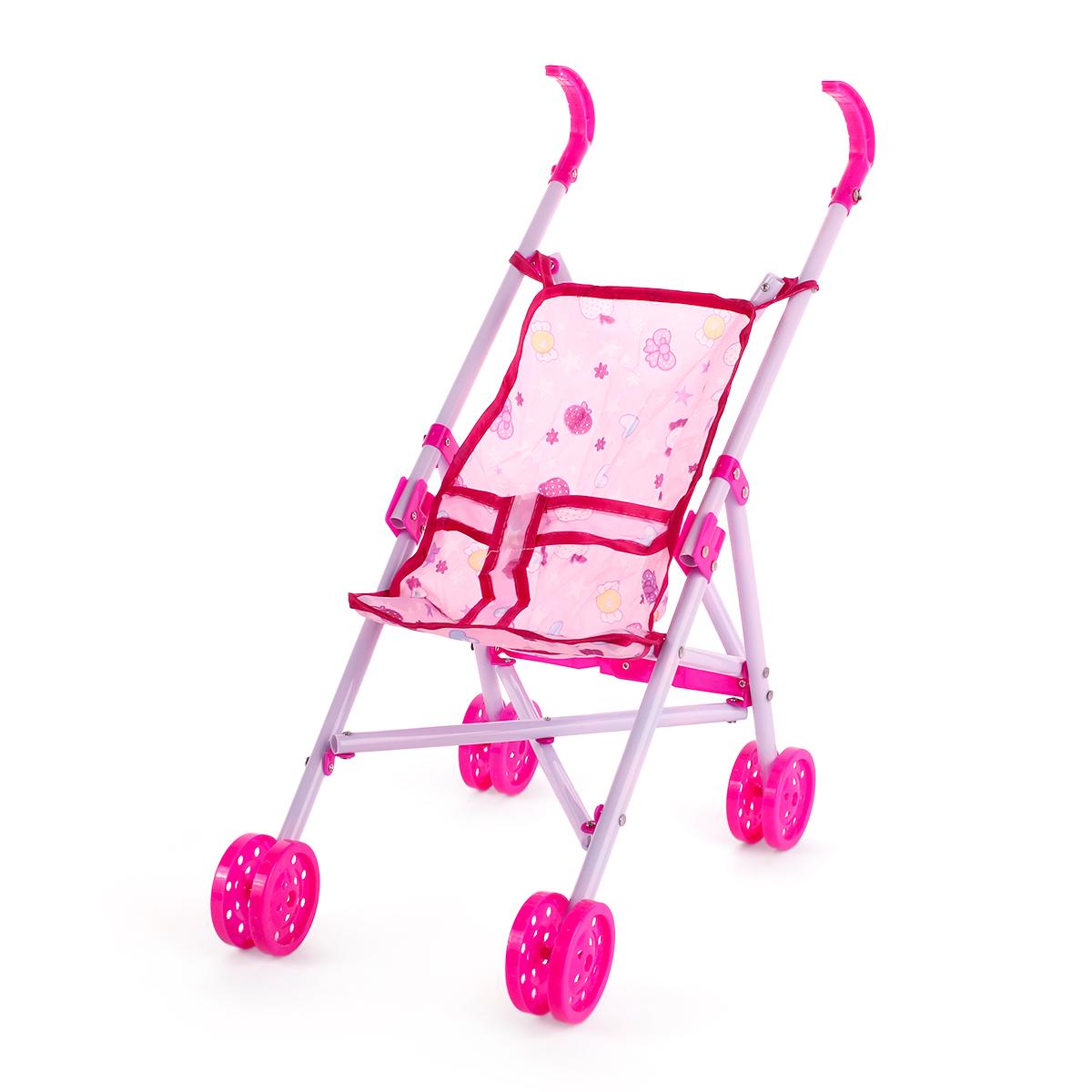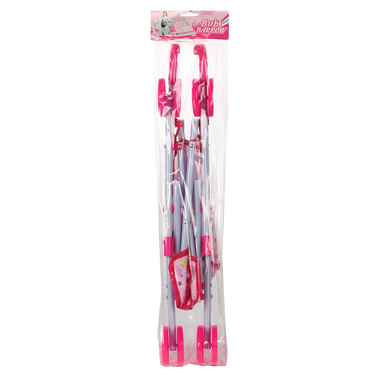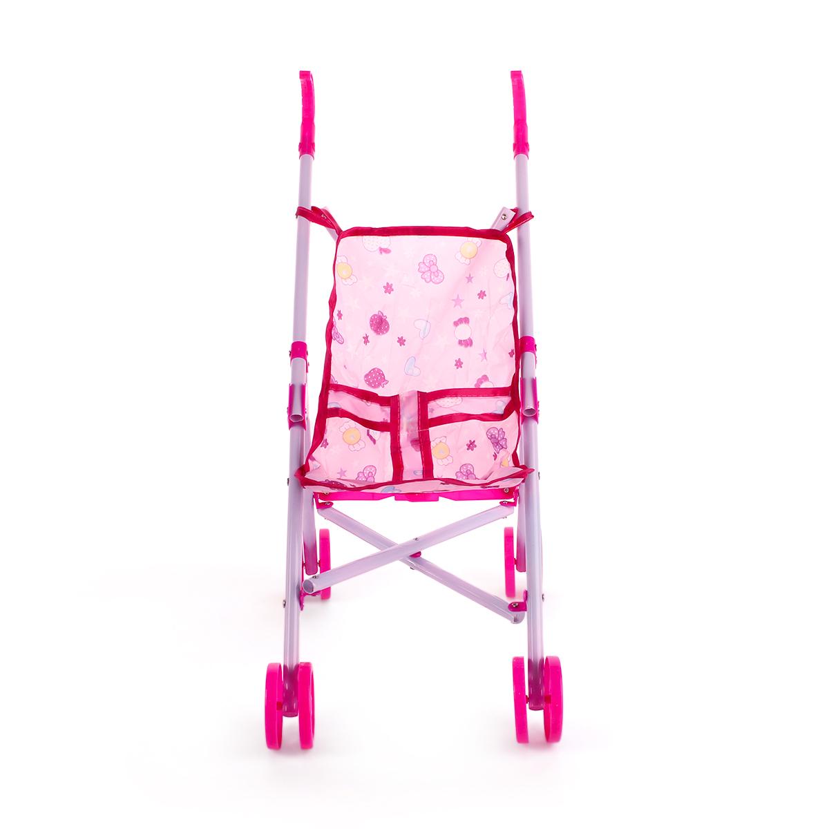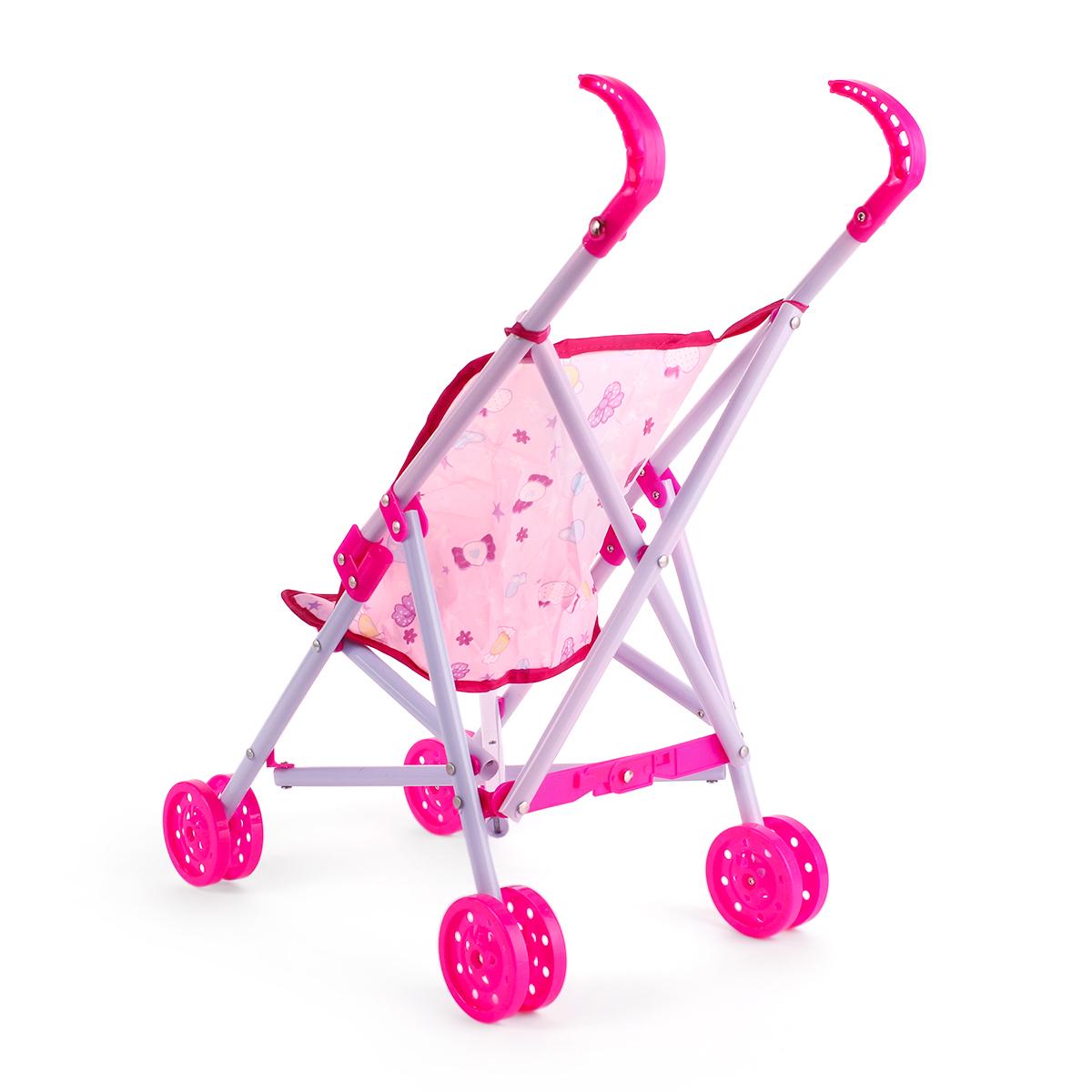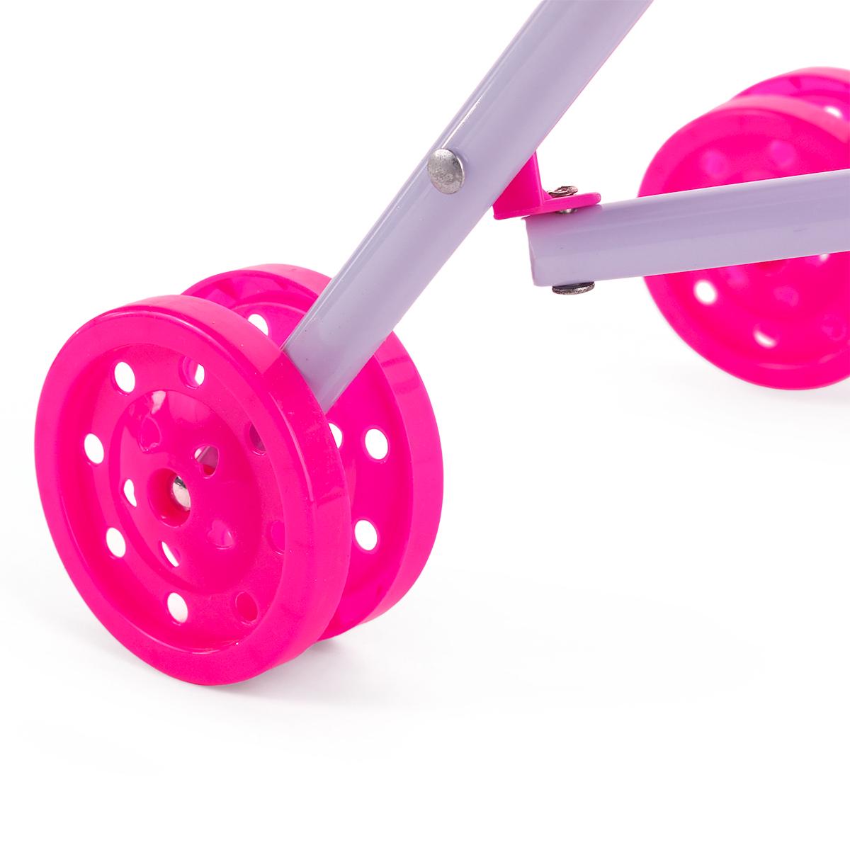 Коляска имеет размеры 55 см, что делает её подходящей для большинства кукол. Сиденье выполнено из текстиля, а каркас из металлических трубок, что обеспечивает надежность и долговечность. Ярко-розовые колеса добавляют коляске стильный вид и делают её заметной на фоне других игрушек.