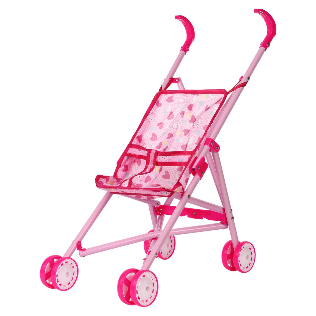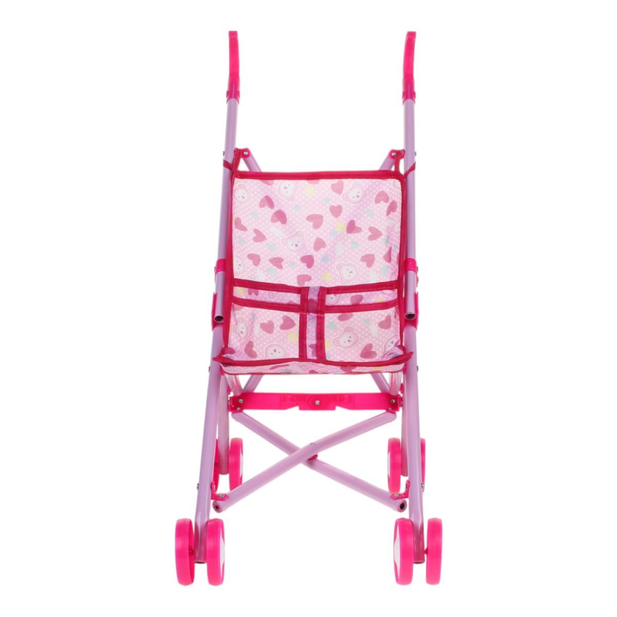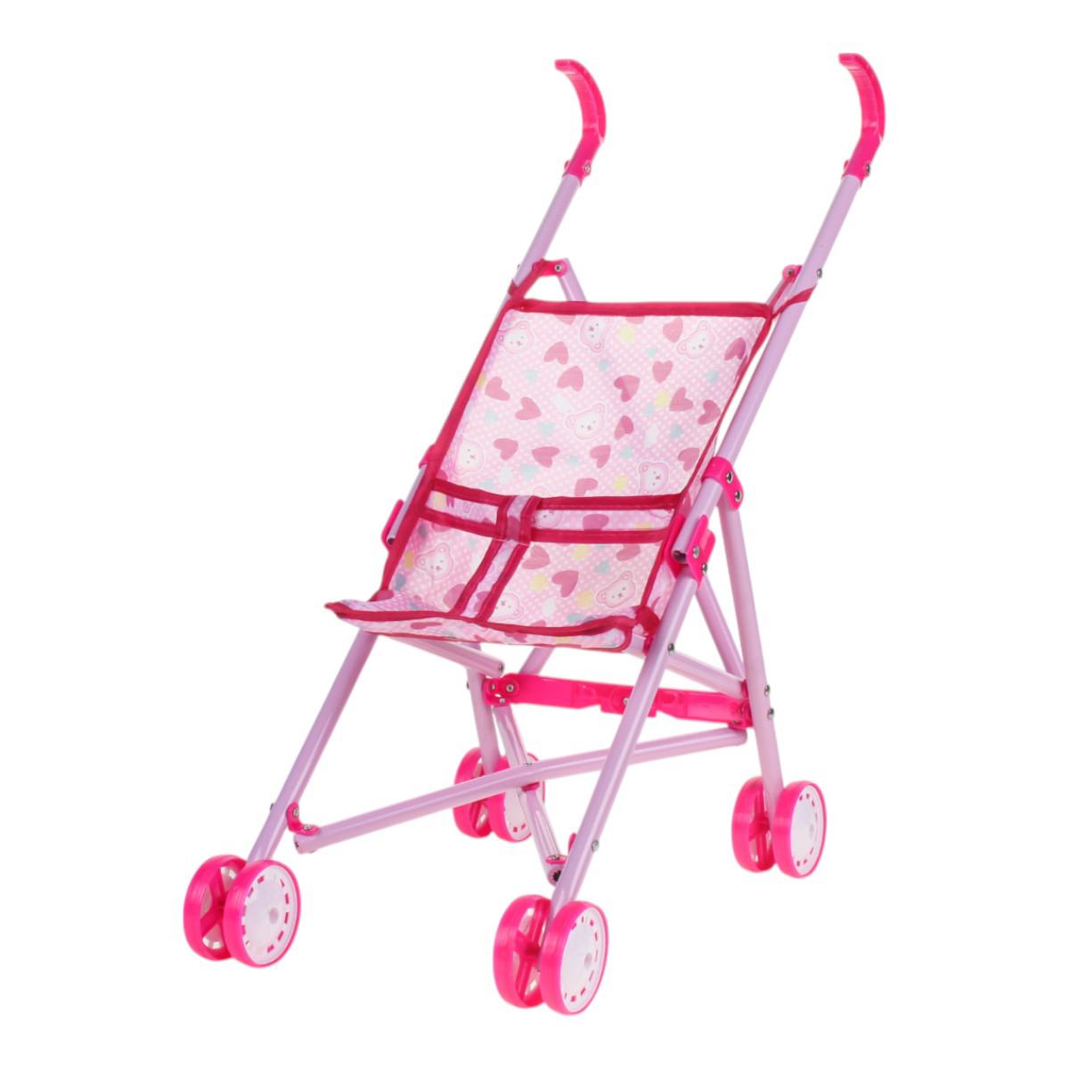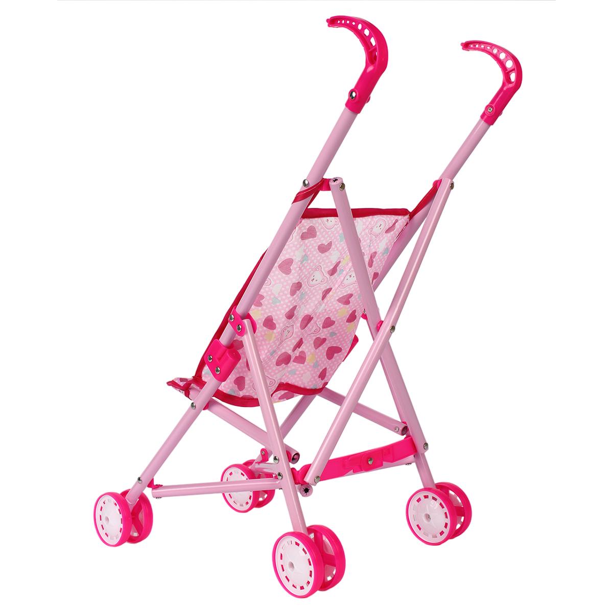 Используйте её для постановки кукол в реалистичные положения, легко складывайте и транспортируйте в сумке или машине. Современный дизайн, яркий розовый цвет с сердечками и удобные ручки делают её привлекательной и эргономичной для девочек 3 лет и старше. Размеры: 52 см в высоту, 36,5 см в длину, 24 см в ширину, колеса диаметром 6 см обеспечивают плавное вращение и устойчивость. Материалы: металл, пластик, текстиль — безопасны и долговечны.