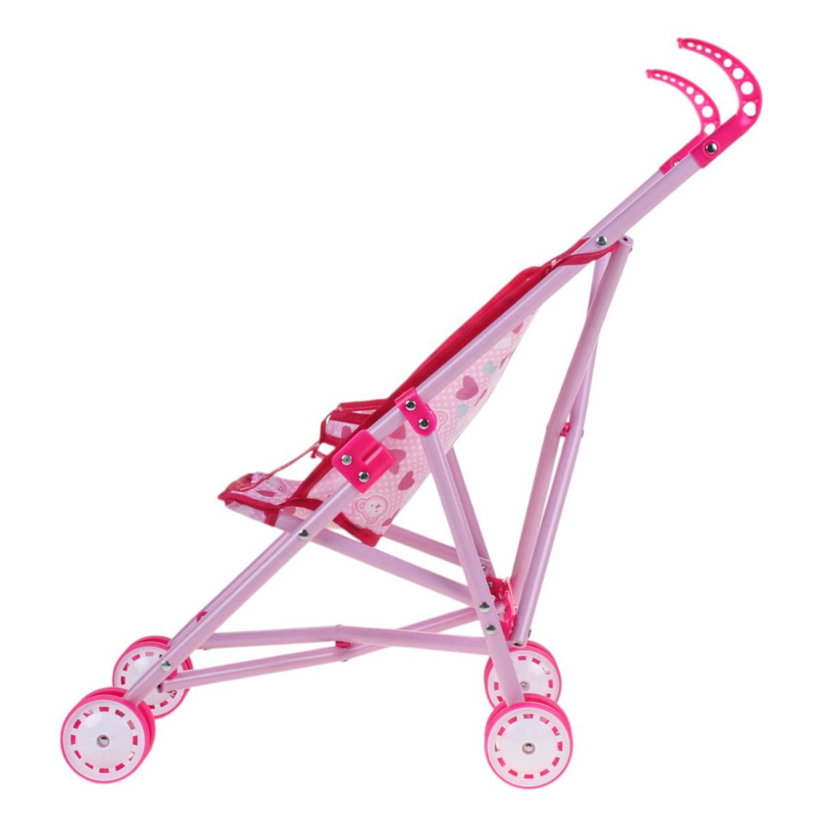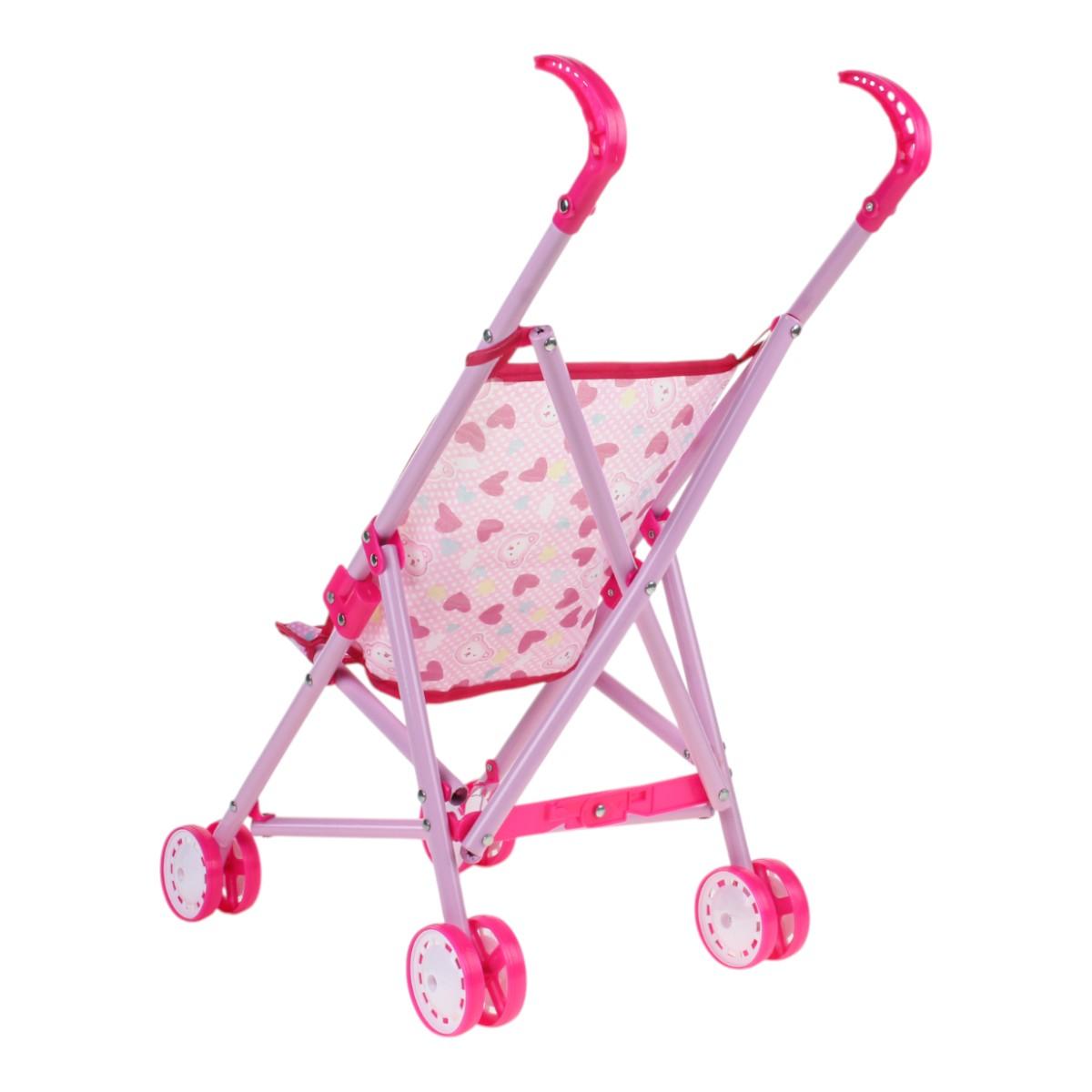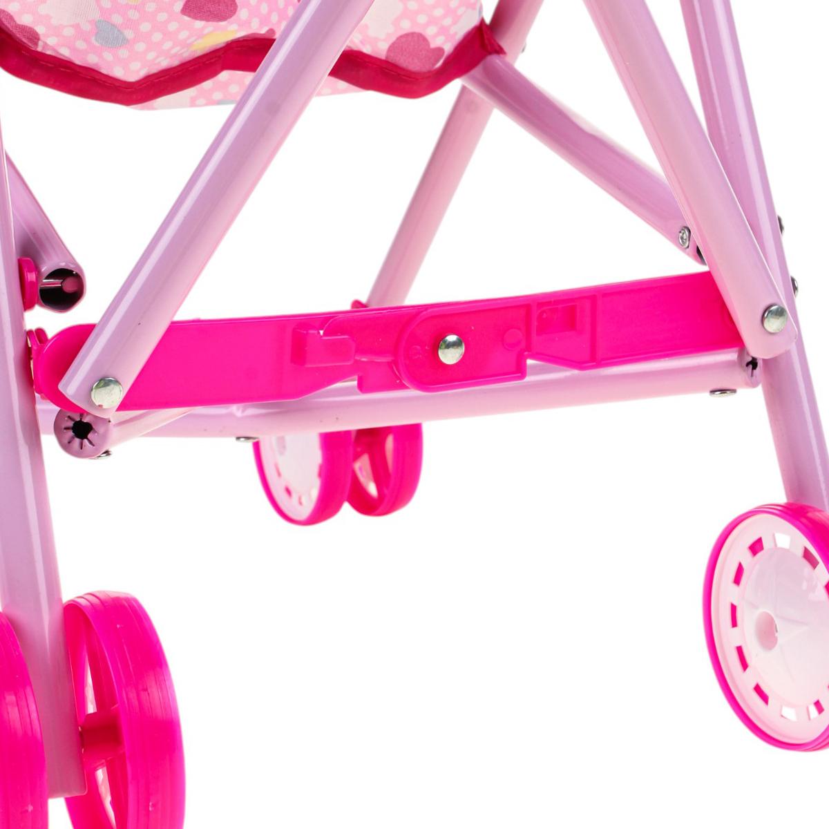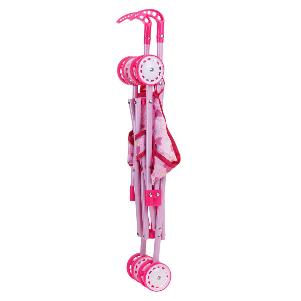 Используйте её для постановки кукол в реалистичные положения, легко складывайте и транспортируйте в сумке или машине. Современный дизайн, яркий розовый цвет с сердечками и удобные ручки делают её привлекательной и эргономичной для девочек 3 лет и старше. Размеры: 52 см в высоту, 36,5 см в длину, 24 см в ширину, колеса диаметром 6 см обеспечивают плавное вращение и устойчивость. Материалы: металл, пластик, текстиль — безопасны и долговечны.