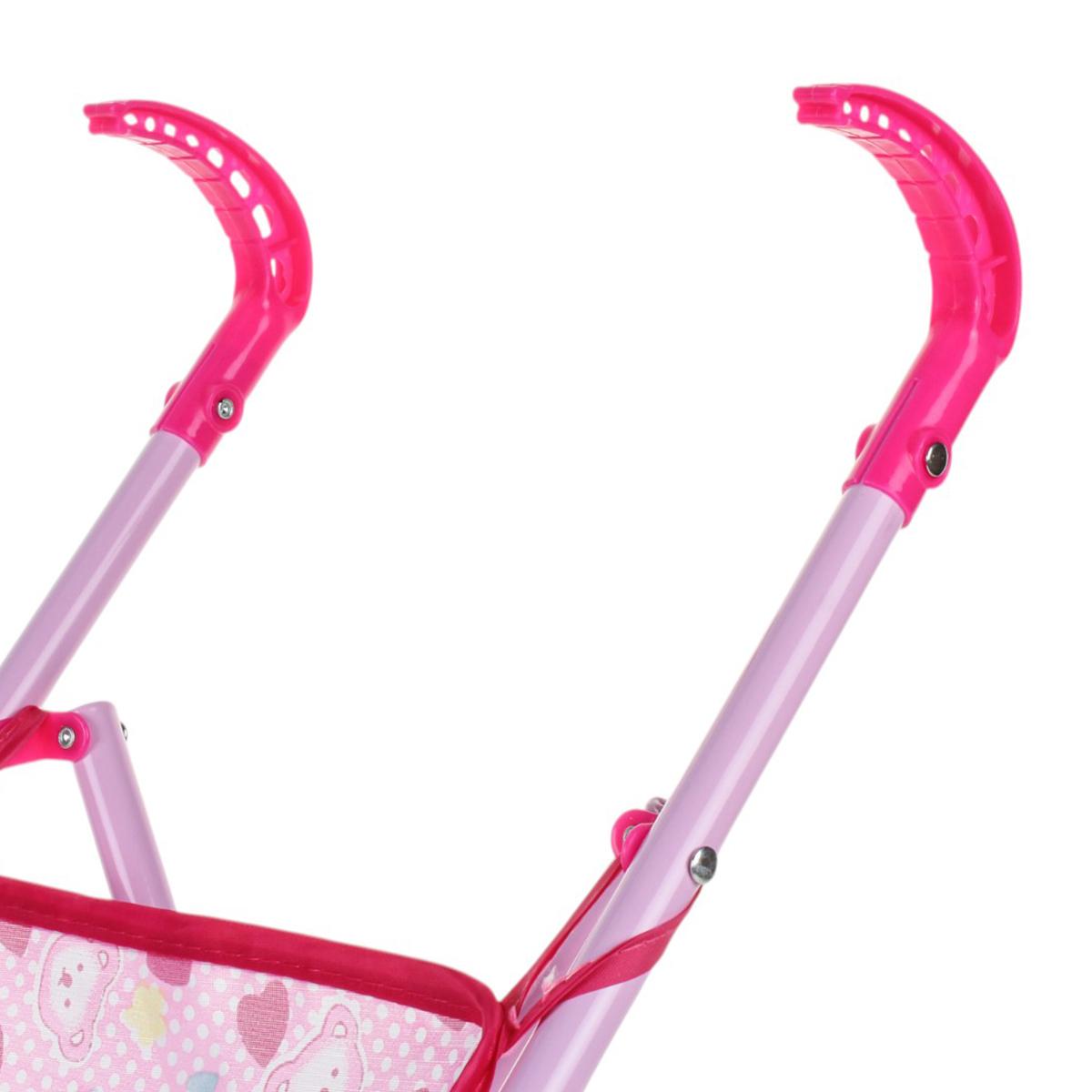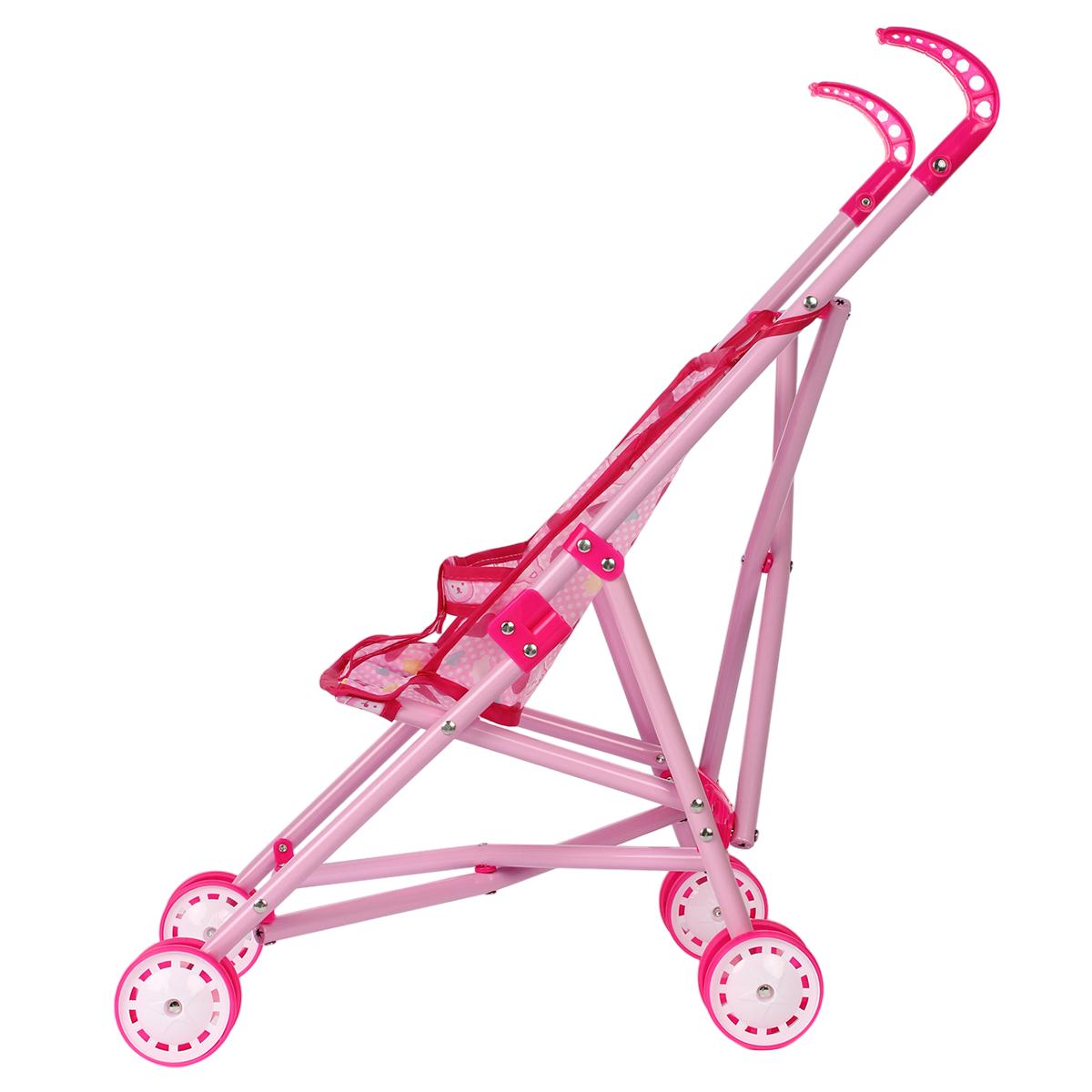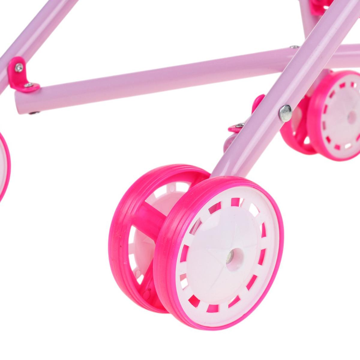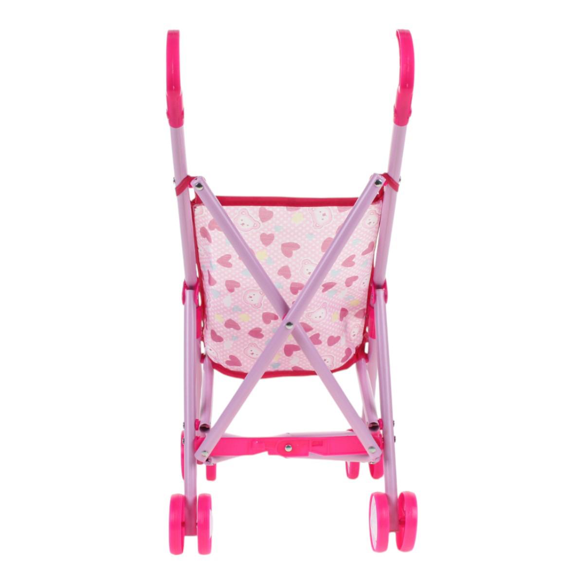 Используйте её для постановки кукол в реалистичные положения, легко складывайте и транспортируйте в сумке или машине. Современный дизайн, яркий розовый цвет с сердечками и удобные ручки делают её привлекательной и эргономичной для девочек 3 лет и старше. Размеры: 52 см в высоту, 36,5 см в длину, 24 см в ширину, колеса диаметром 6 см обеспечивают плавное вращение и устойчивость. Материалы: металл, пластик, текстиль — безопасны и долговечны.