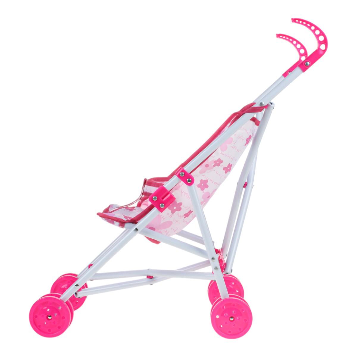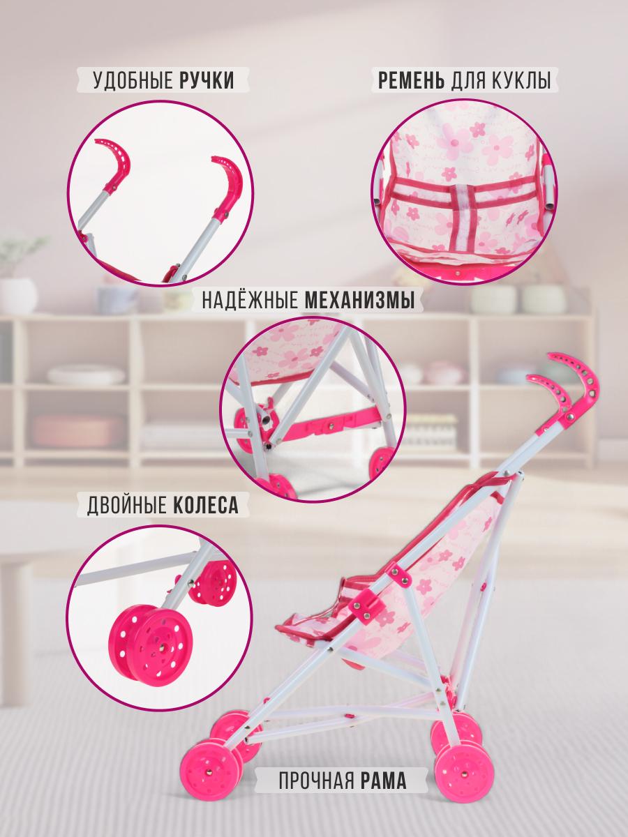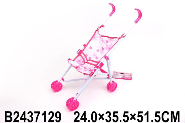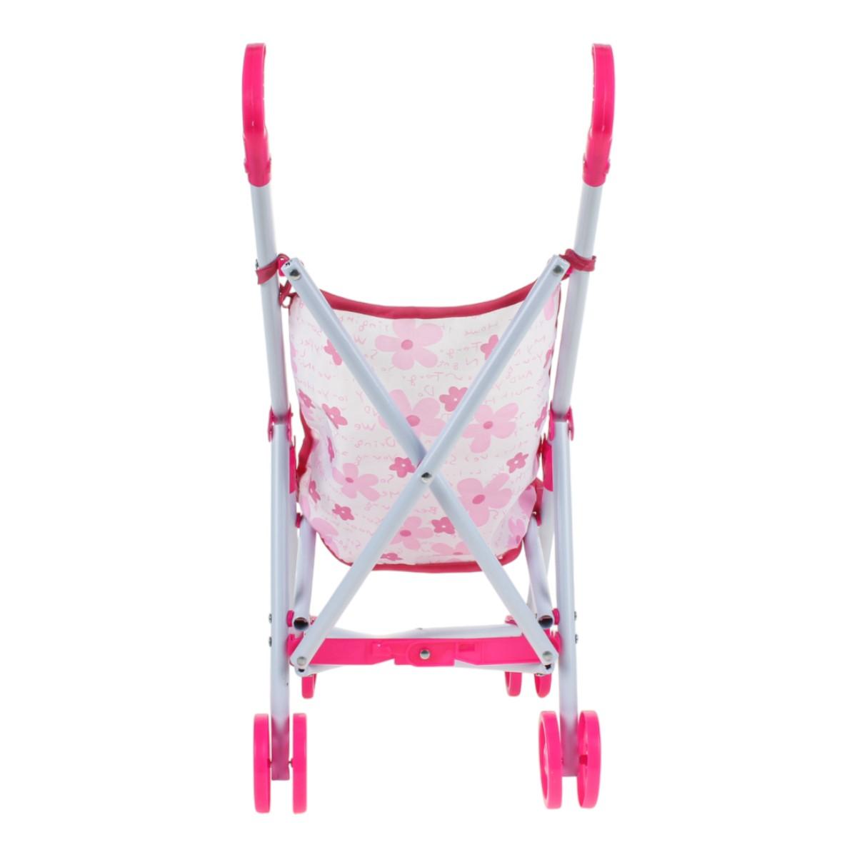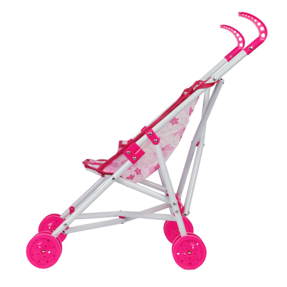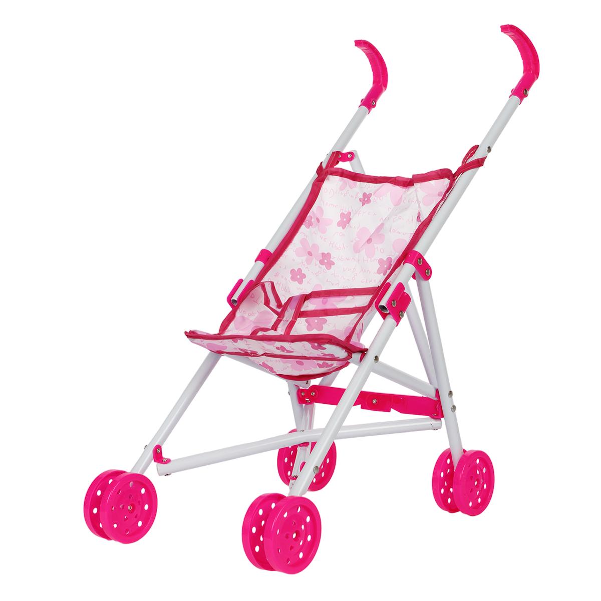 Коляска предназначена для детей, которые любят играть с куклами. Она выполнена из прочных материалов: металлический каркас обеспечивает надежность, а текстильное сиденье с цветочным узором добавляет эстетики. Сдвоенные пластиковые колеса обеспечивают легкость передвижения, а система безопасности в виде ремня удерживает куклу на месте. Коляска легко маневрирует и подходит для игры как дома, так и на улице.