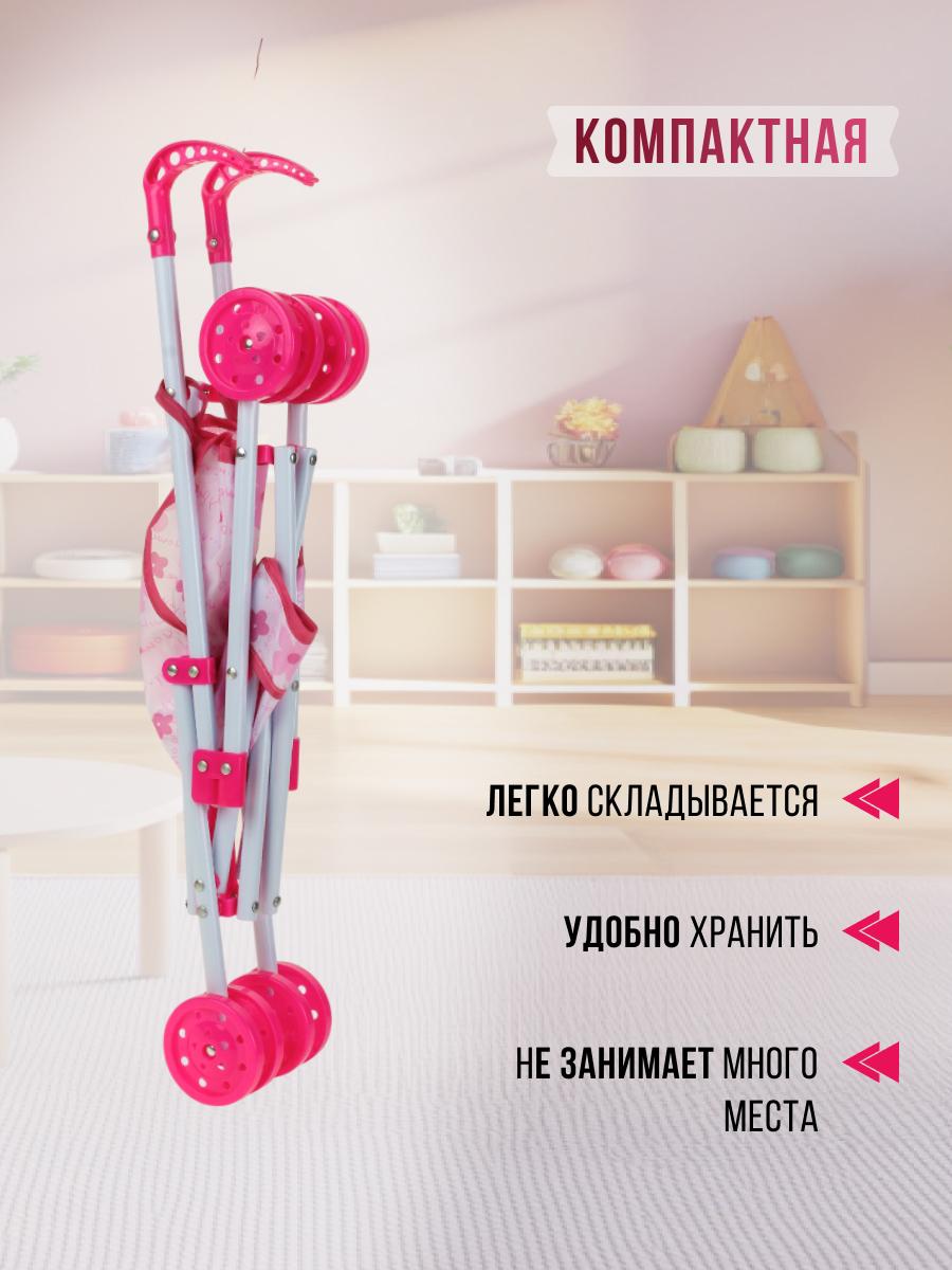 Размеры коляски составляют 59 см в высоту, а упаковка имеет размеры 24,0 * 35,5 * 51,5 см. Коляска выполнена в розовом цвете с цветочным принтом на сиденье, что делает её особенно привлекательной для маленьких модниц. Благодаря легкому весу и компактным размерам, коляска легко помещается в рюкзак или сумку, что позволяет брать её с собой куда угодно.