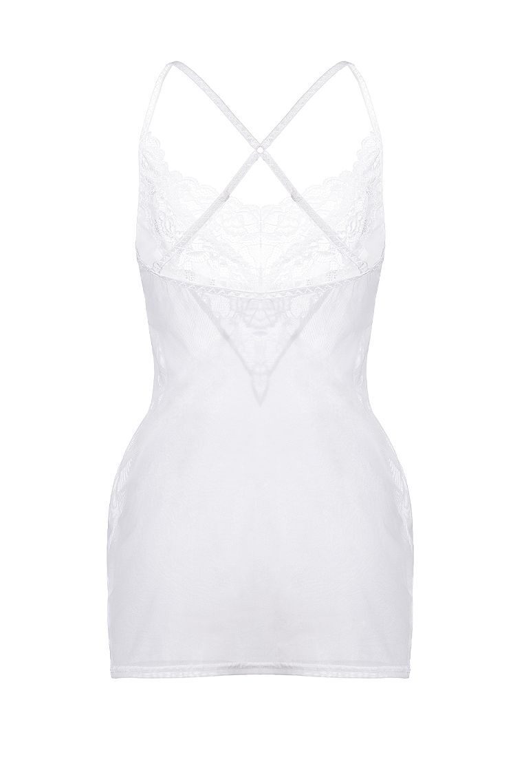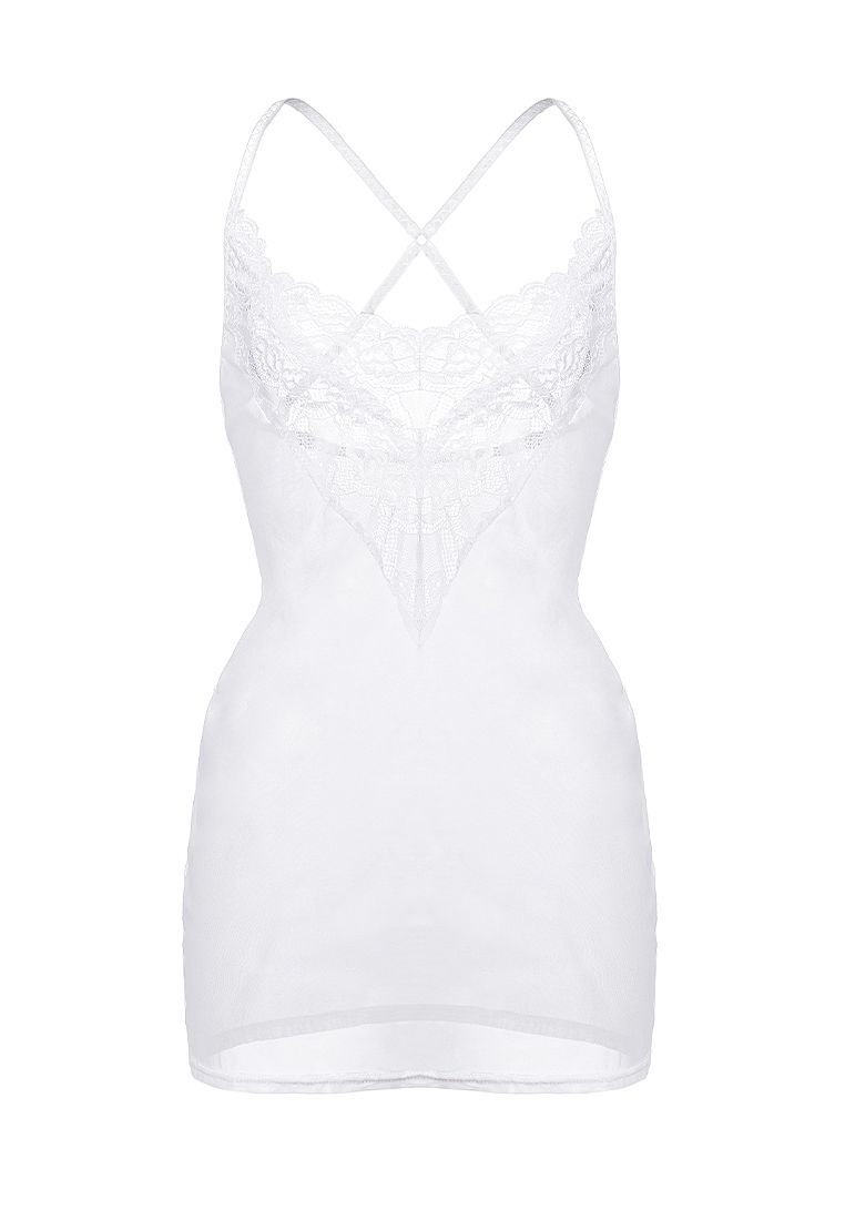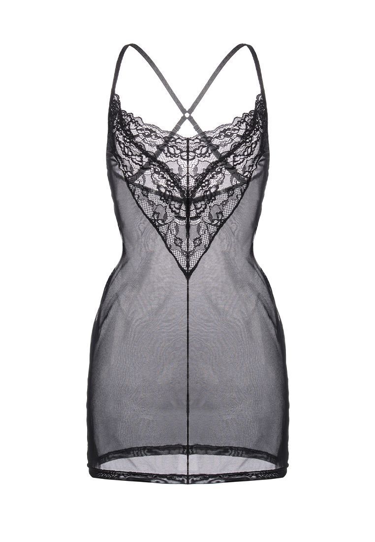 Эластичная комбинация из сетки с кружевным декольте мягко обтягивает фигуру, подчеркивая естественные изгибы тела. Перекрещенные регулируемые бретели позволяют точно настроить посадку, создавая эффект «второй кожи».