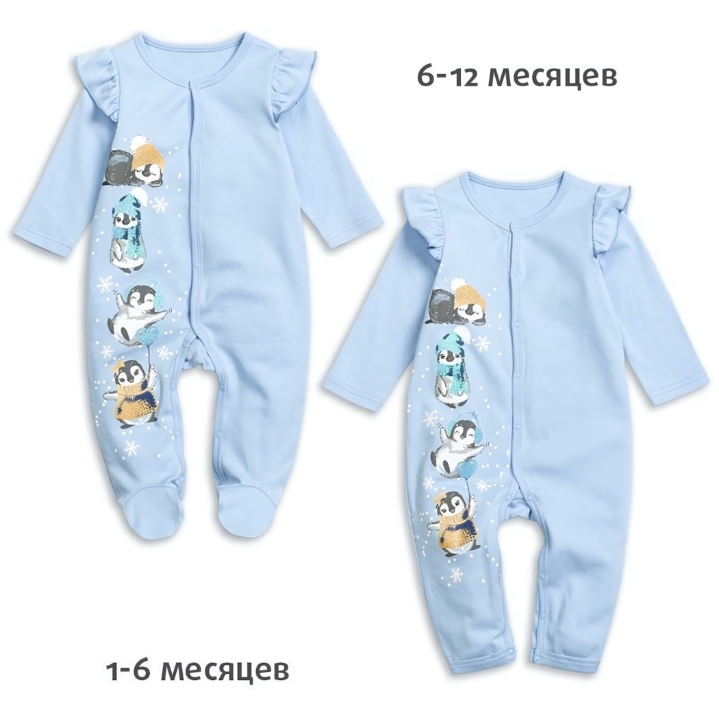 Застежка спереди на кнопки идёт по центру от горловины до ног, что облегчает переодевание и смену подгузника. Длинные рукава и закрытые ножки обеспечивают дополнительное тепло, а декоративные воланы добавляют милый акцент. На изделии принты с пингвинами — веселый элемент, который нравится малышкам и их родителям.